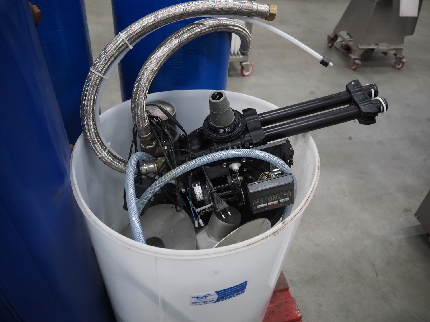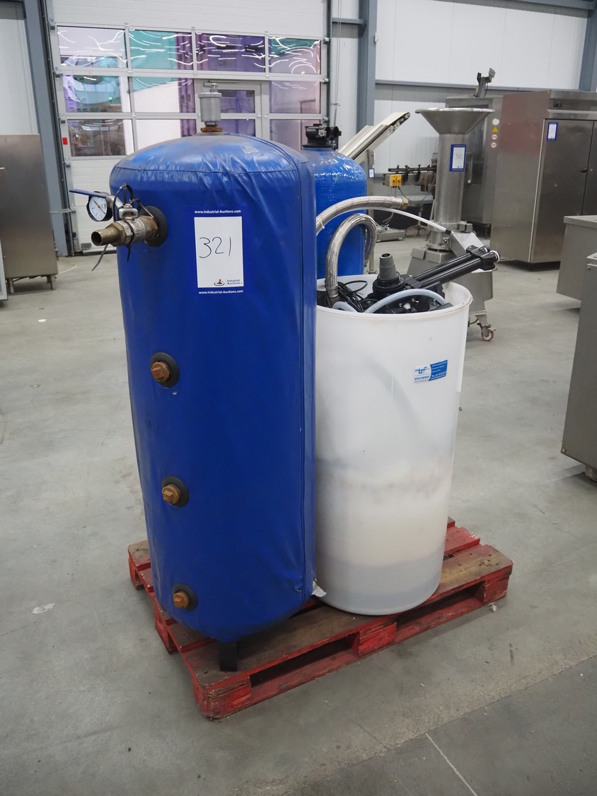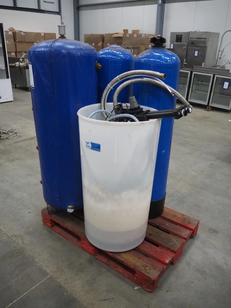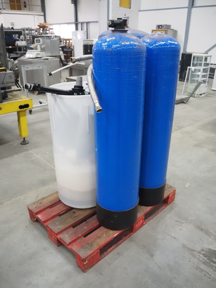 Pallet with water softener consisting of 3 vessels and 1 plastic bin.