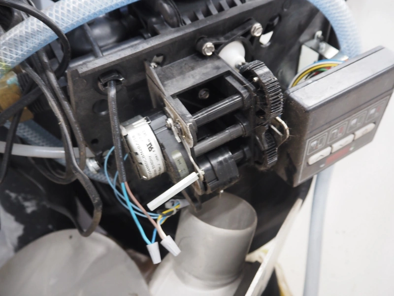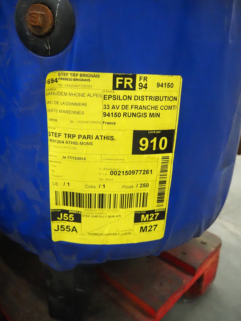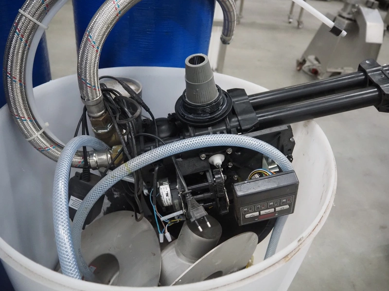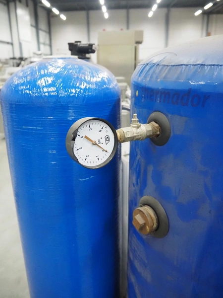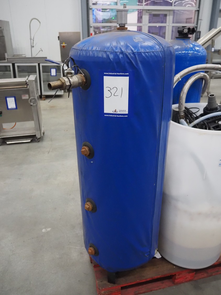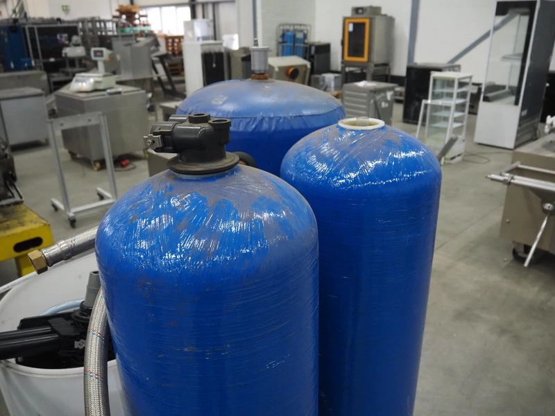 Pallet with water softener consisting of 3 vessels and 1 plastic bin.