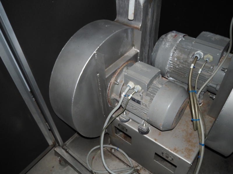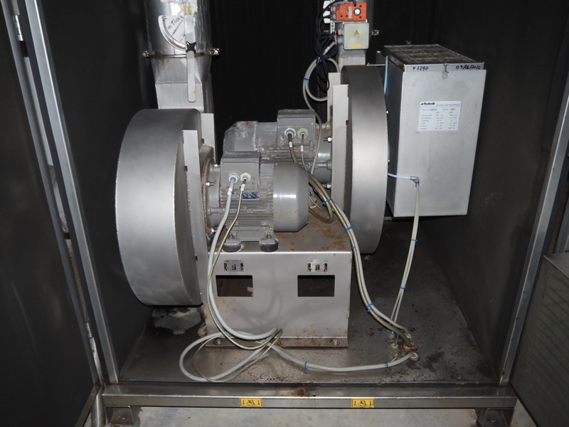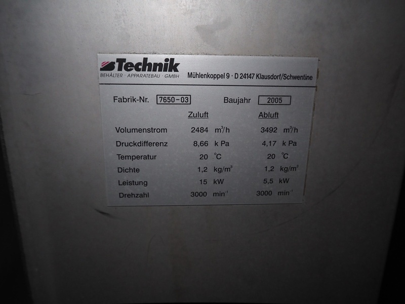 Technik GmbH air purifier, fabrication number: 7650-03, year of construction: 2005, capacity: 2484/3492 m³ per hour, 15/5.5 kW, dimensions: 1450 mm x 1500 mm x 1800 mm, steel switch cabinet, dimensions: 1150 mm x 410 mm x 1900 mm.