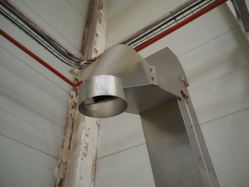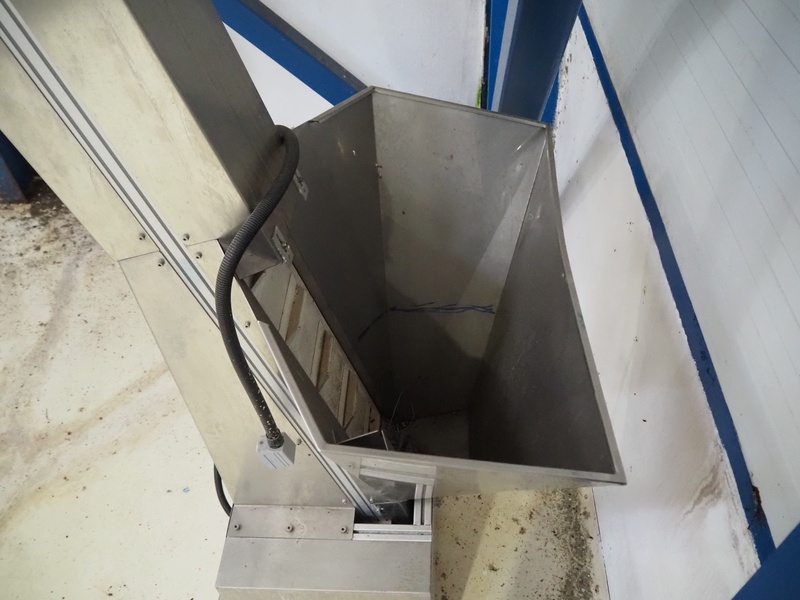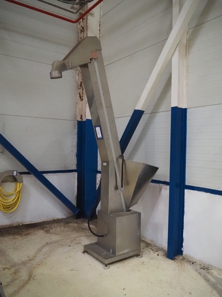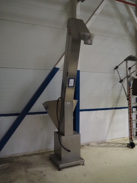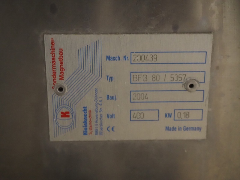 Kleinknecht elevating belt, type: BFB 80 / 5357, serial number: 200439, year of construction: 2004, 400 V, 0.18 kW, plastic belt, belt width: 200 mm, total dimensions: 1550 mm x 850 mm x 3100 mm.