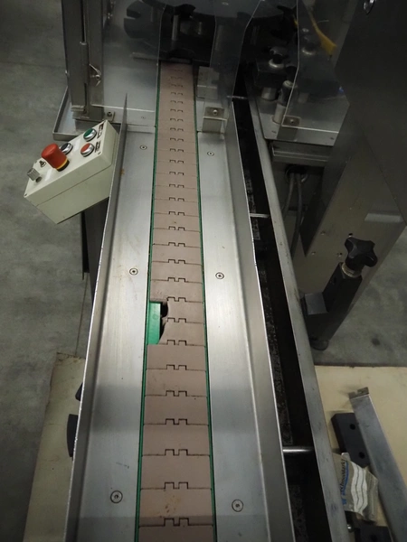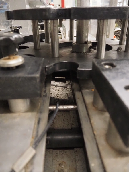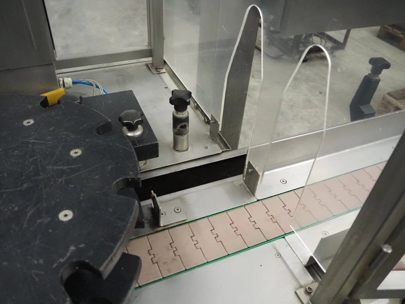 Jespers machinebouw 1-heads pressure closer, diameter upper stations: 35 mm, diameter lower stations: 60 mm, plastic belt, belt width: 90 mm, clearance: 100 mm x 320 mm, total dimensions: 2900 mm x 1100 mm x 2300 mm. Including pallet with spare parts.