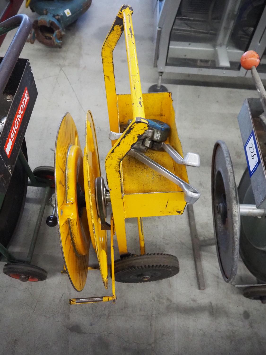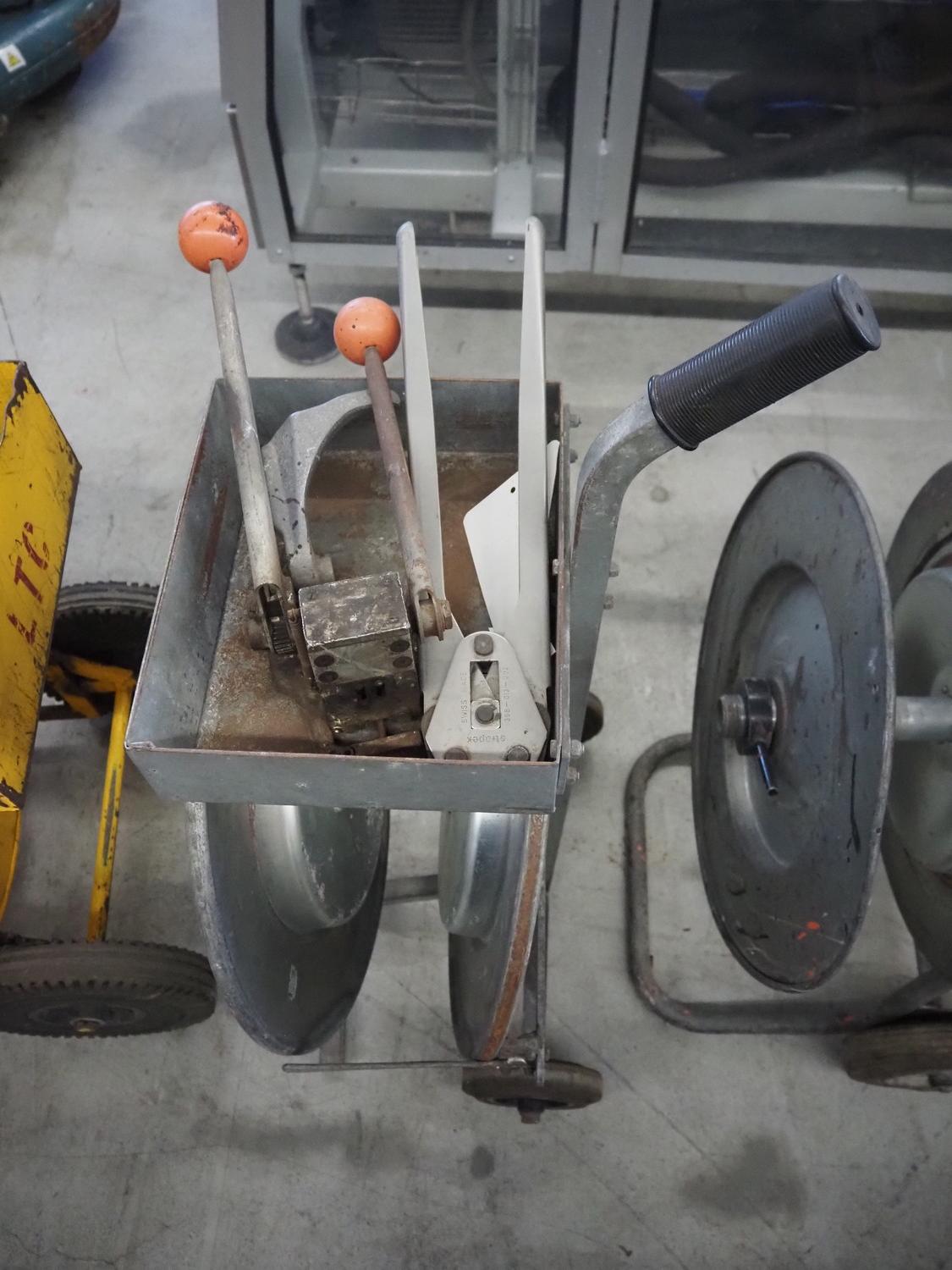 5 Signode steel strapping trolleys, dimensions: (3x) 500 mm x 530 mm x 1000 mm, including 2 steel boxes with clips.