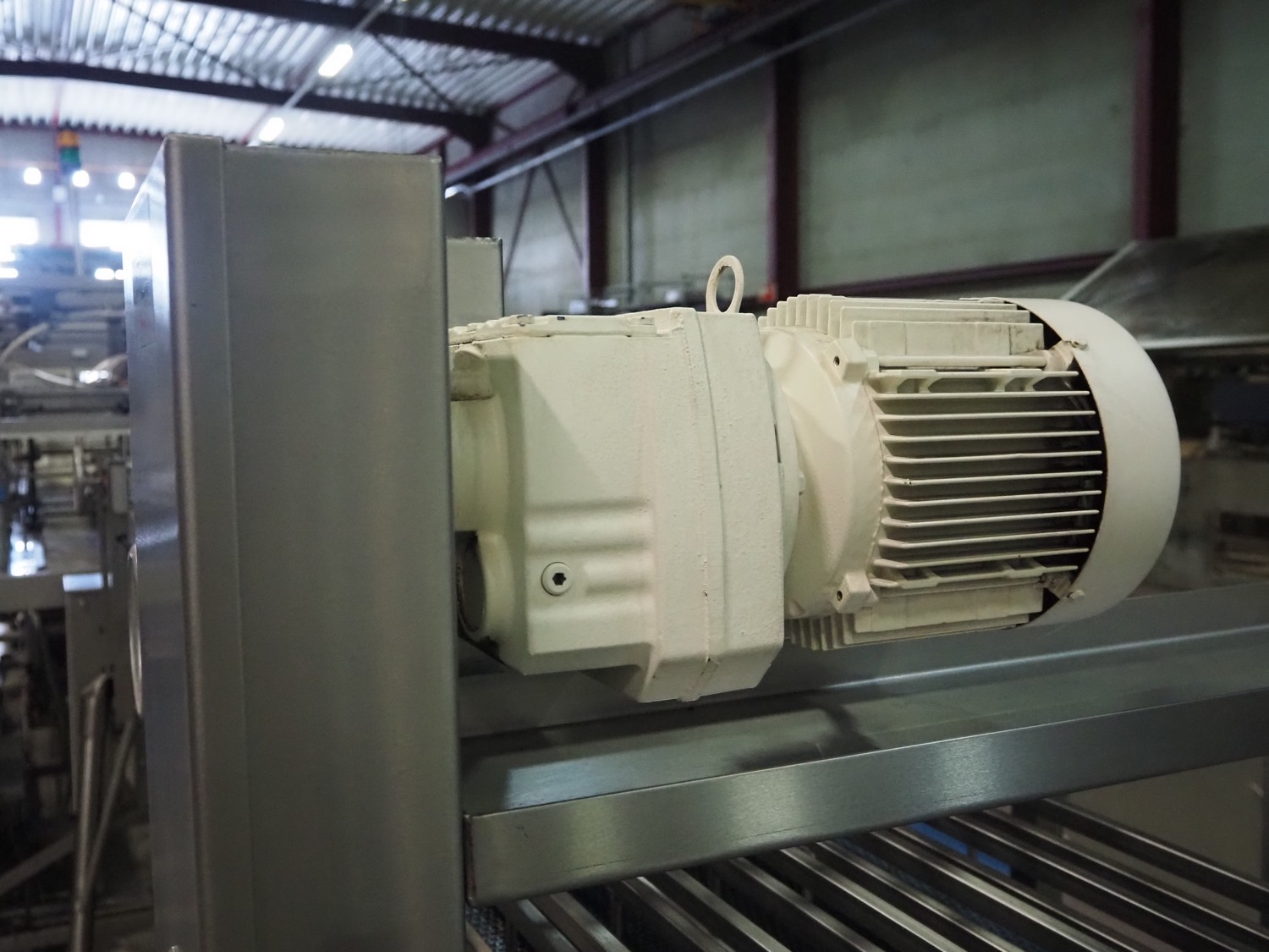 Meypack bottle packaging line consisting of divider/infeed belt, plastic mesh belt, belt width: 680 mm, 6 lanes, lane width: (6x) 85 mm, clearance: 85 mm x 280 mm, total dimensions: 1240 mm x 1600 mm x 2000 mm, Meypack shrink wrapper, model: SW90 M40-2, serial number: 858308, year of construction: 2003, s/s mesh belt, belt width: 900 mm, clearance: (6x) 65 mm x 230 mm, plastic buffer and outfeed belt, belt width: 800 mm, film width: 500 mm, total dimensions: 5700 mm x 2600 mm x 2200 mm, Meypack shrink tunnel, model: STU 10040-32, serial number: 853660, year of construction: 2003, s/s mesh belt, belt width: 950 mm, clearance: 950 mm x 350 mm, total dimensions: 4850 mm x1650 mm x 1950 mm, dimensions switch cabinet: 2400 mm x 650 mm x 2150 mm. Capacity: up to 40 cycles per minute.