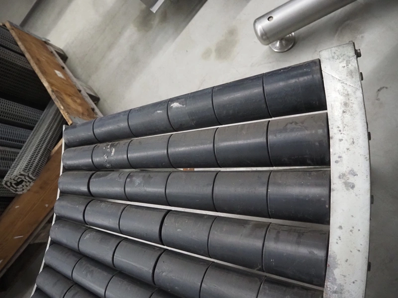 45° curved roller conveyor, steel frame, plastic rollers, roller width: 600 mm, total dimensions: 2050 mm x 900 mm x 630 mm.