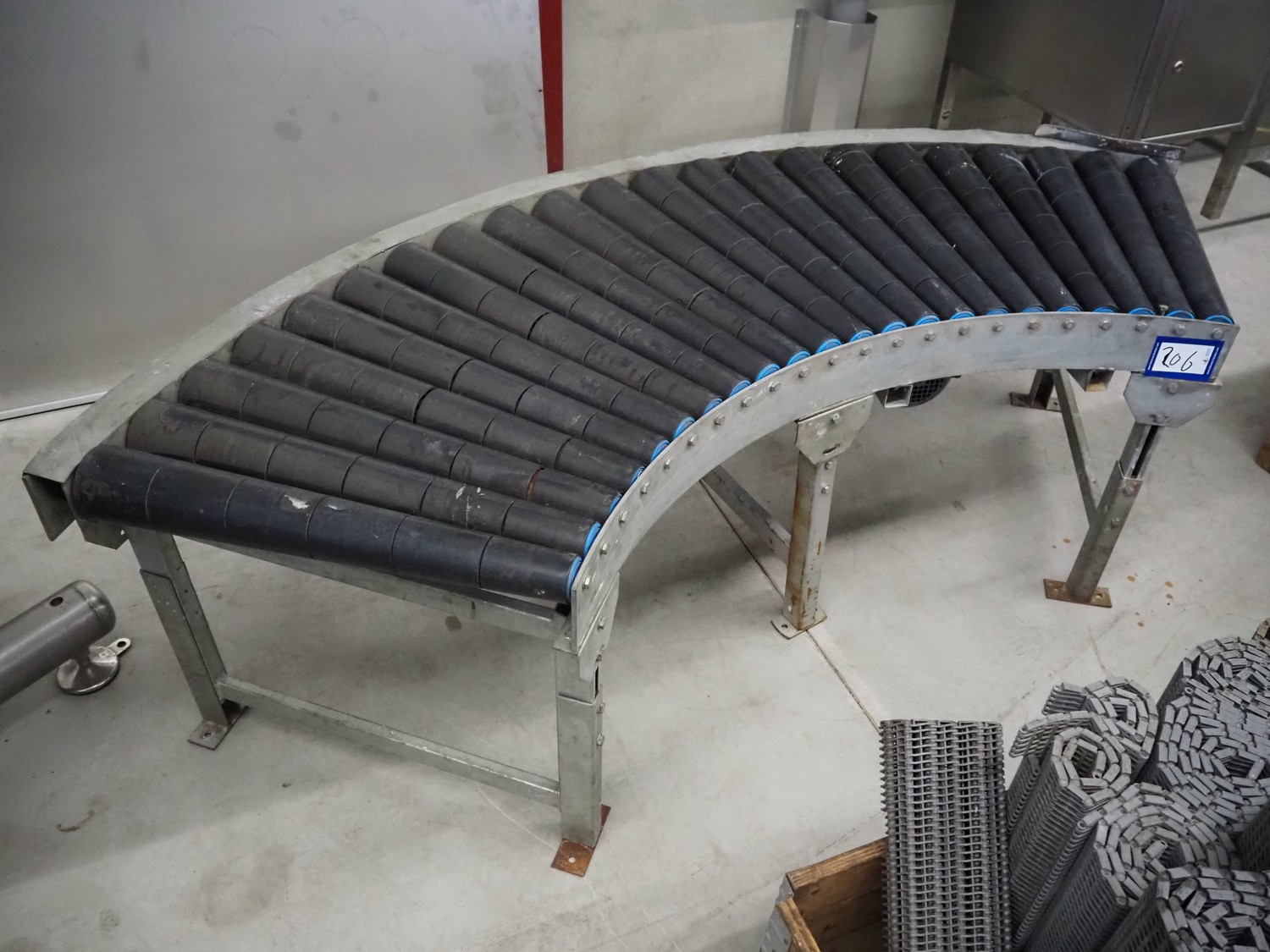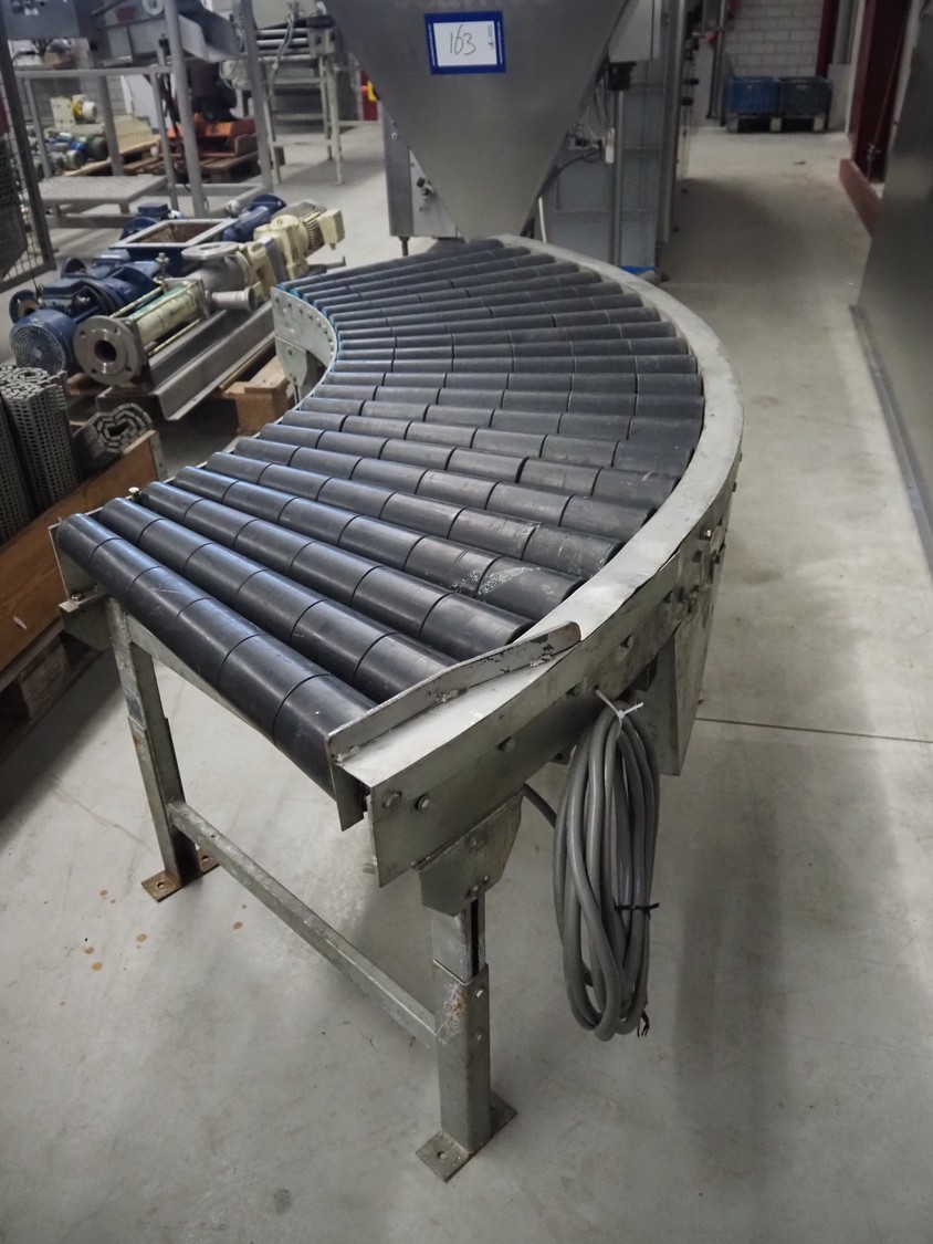 45° curved roller conveyor, steel frame, plastic rollers, roller width: 600 mm, total dimensions: 2050 mm x 900 mm x 630 mm.