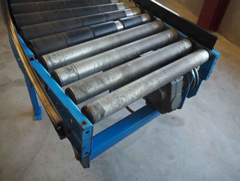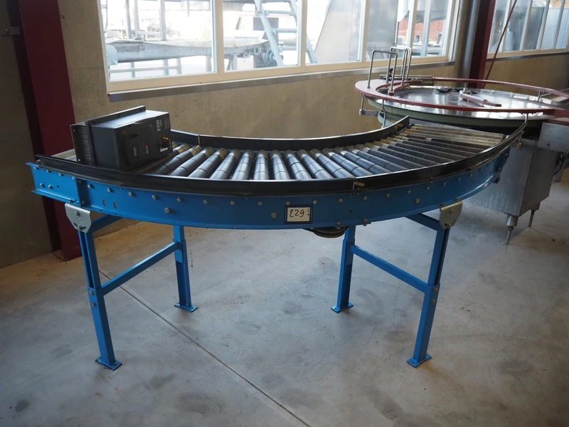 90° curved roller conveyor with Teco control panel, steel frame, plastic rollers, roller width: 485 mm, total dimensions: 2300 mm x 1000 mm x 950 mm. Control panel type: E510, 220 v, 1.5 kW, 1 Ph.