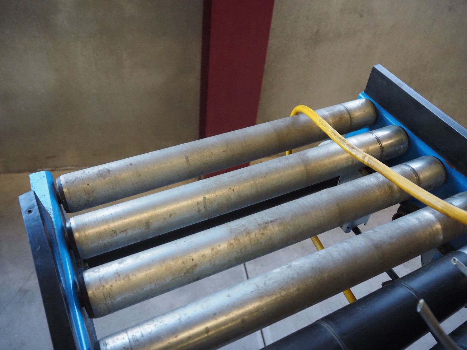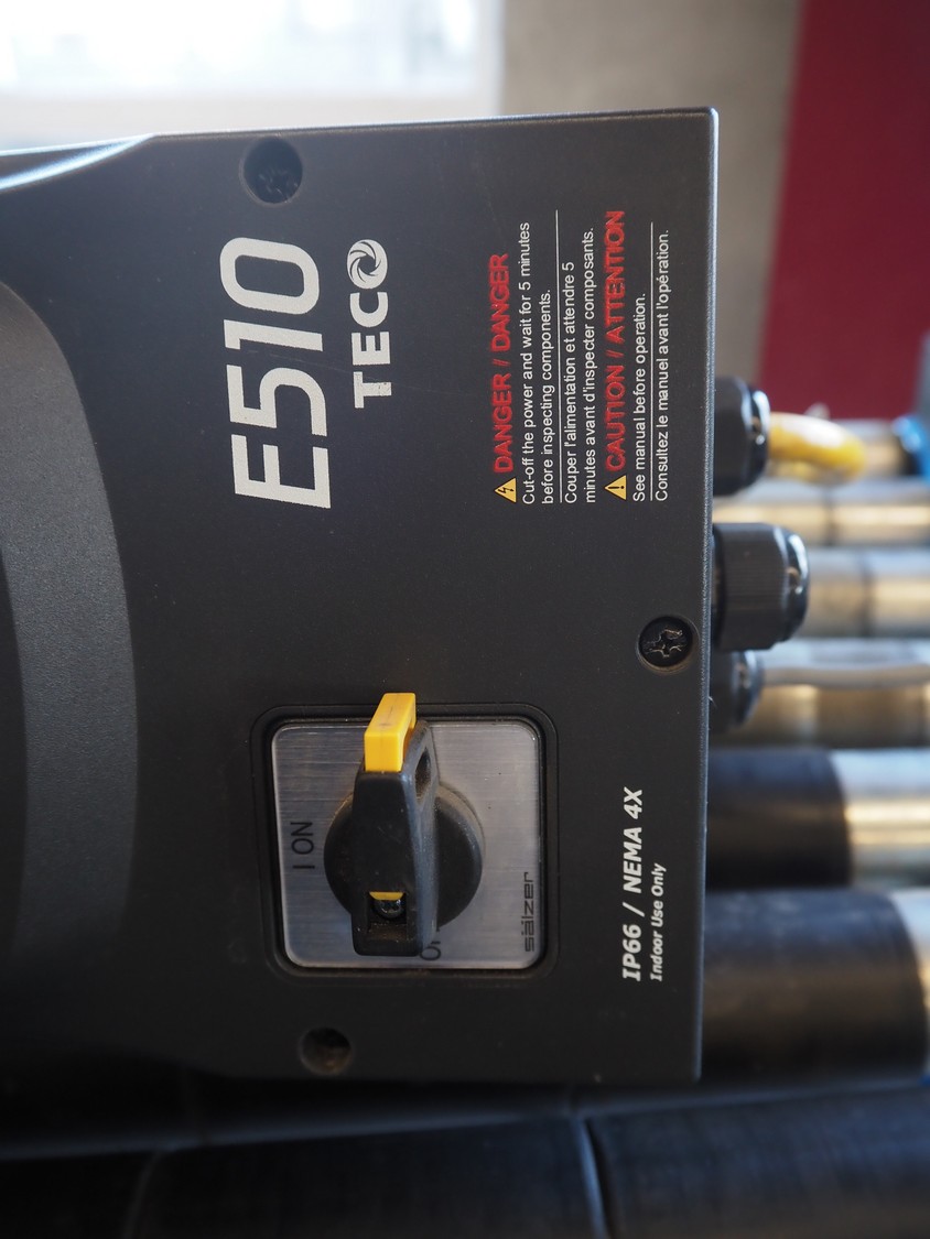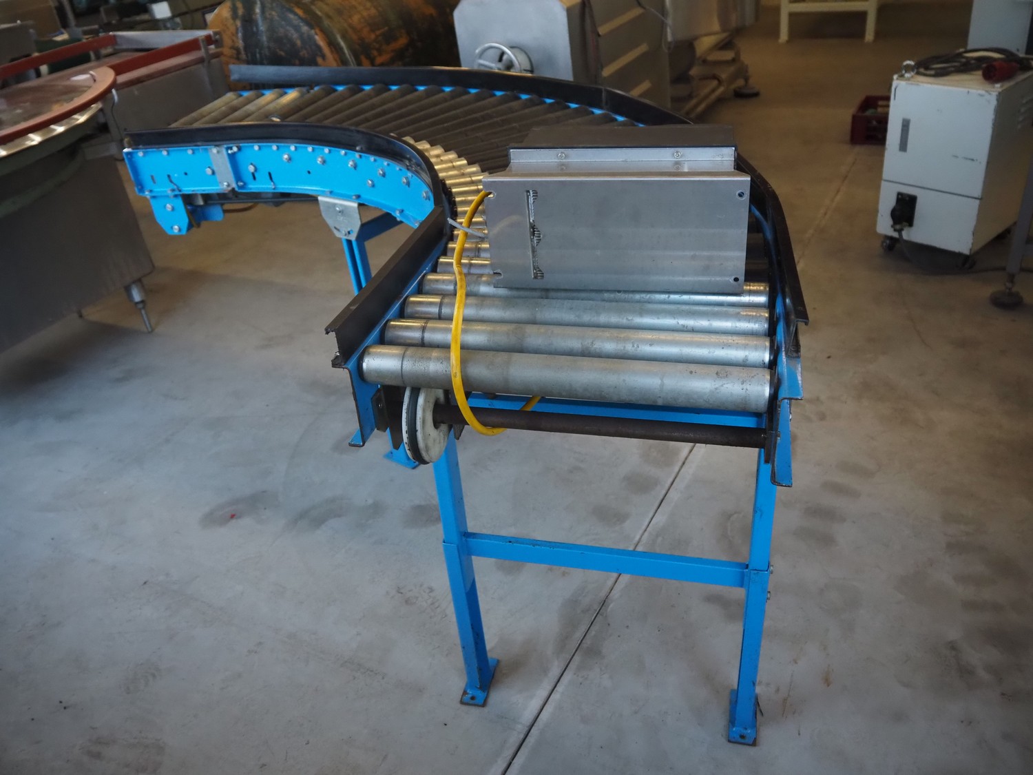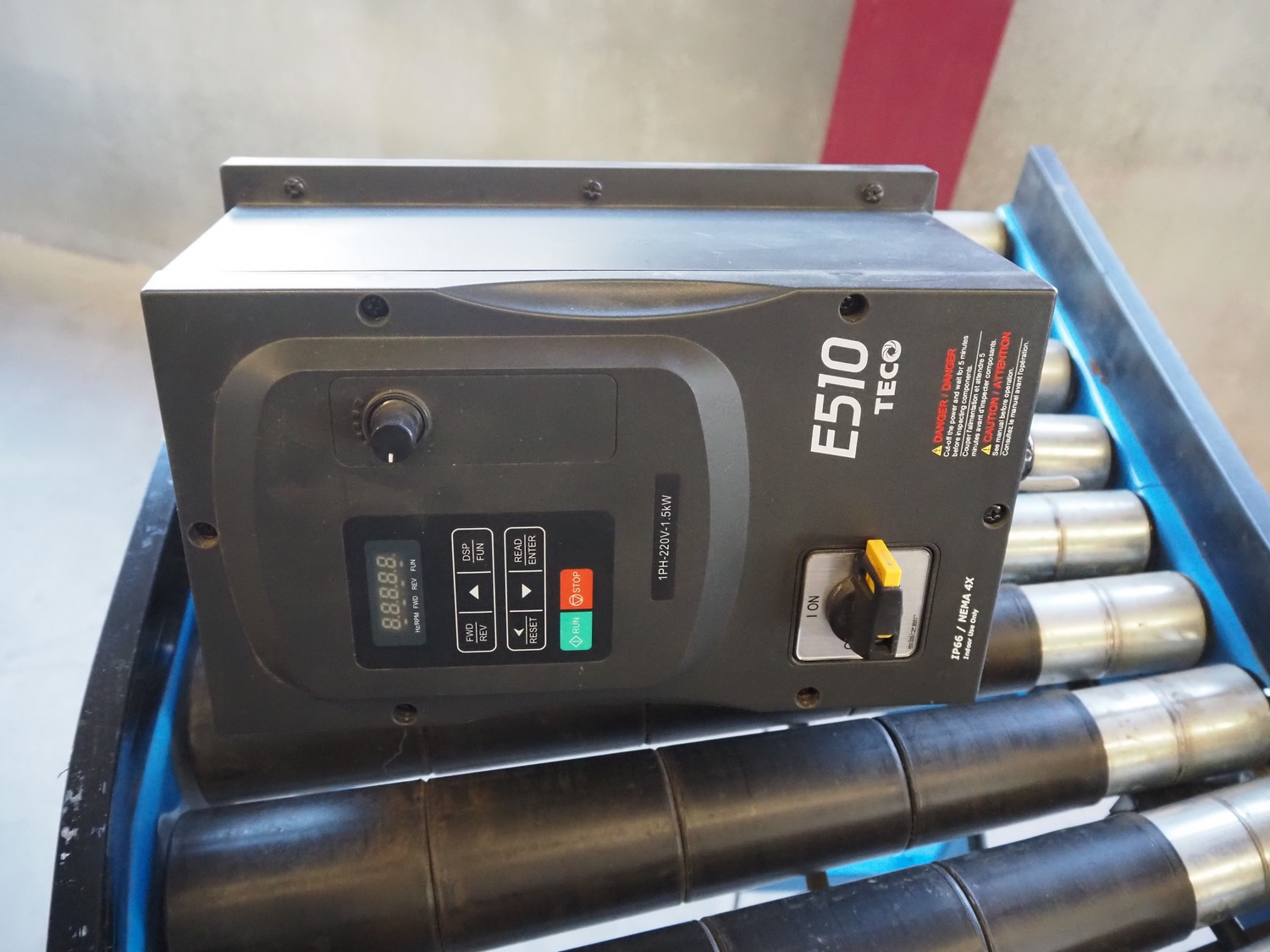 90° curved roller conveyor with Teco control panel, steel frame, plastic rollers, roller width: 485 mm, total dimensions: 2300 mm x 1000 mm x 950 mm. Control panel type: E510, 220 v, 1.5 kW, 1 Ph.