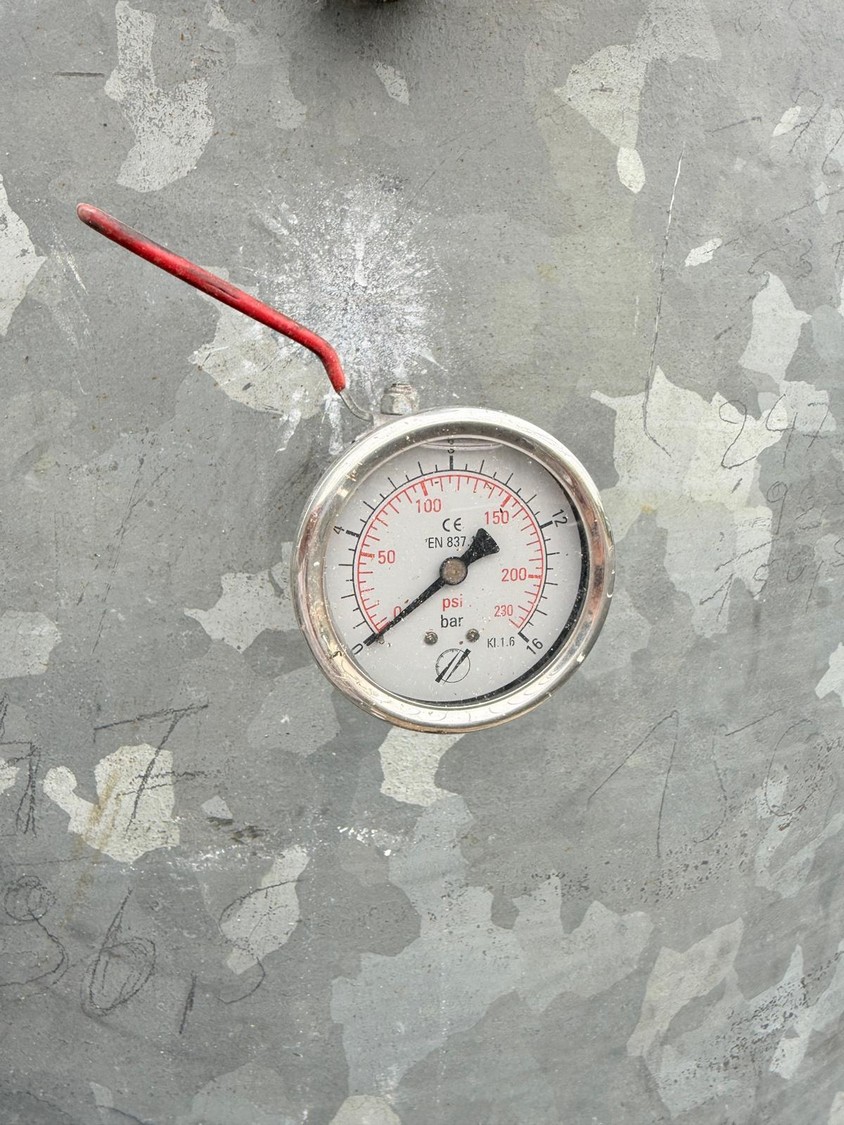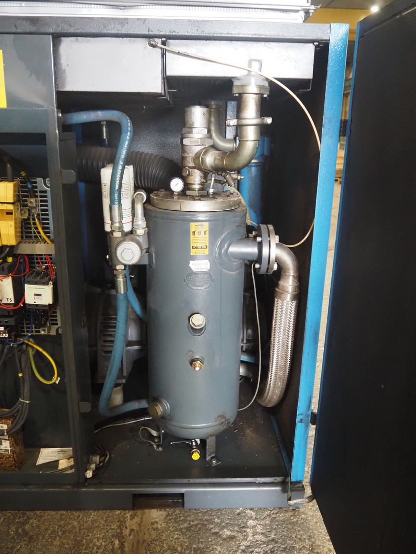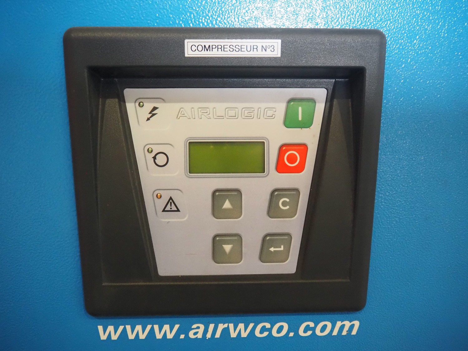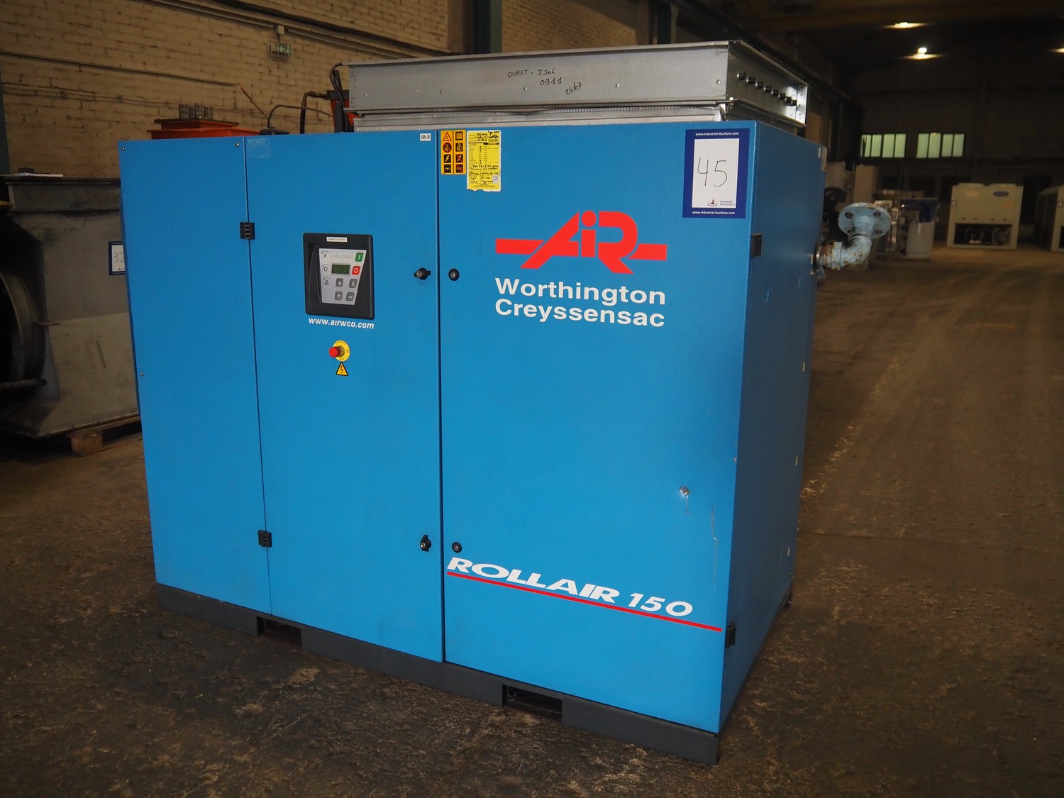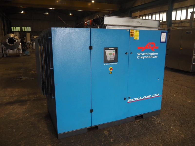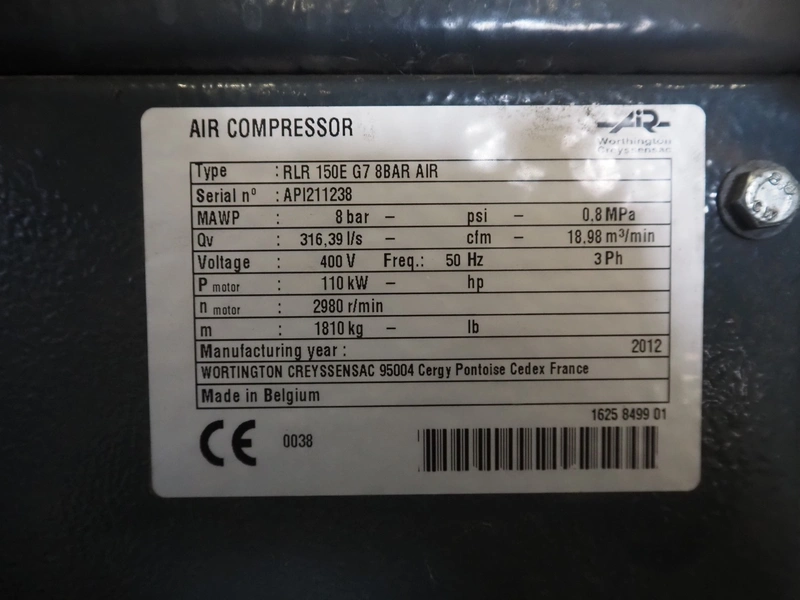 Worthington Creyssensac air compressor, type: RLR 150E G7 8BAR AIR, serial number: API211238, year of construction: 2012, 400 V, 3 Ph, 50 Hz, 110 kW, weight: 1810 kg, dimensions: 2300 mm x 1100 mm x 1800 mm. Including steel pressure vessel, number: 8904069, volume: 5000 liter, dimensions: ⌀ 1200 mm x 3550 mm, pallet with parts and switch cabinet, dimensions switch cabinet: 950 mm x 270 mm x 180 mm.