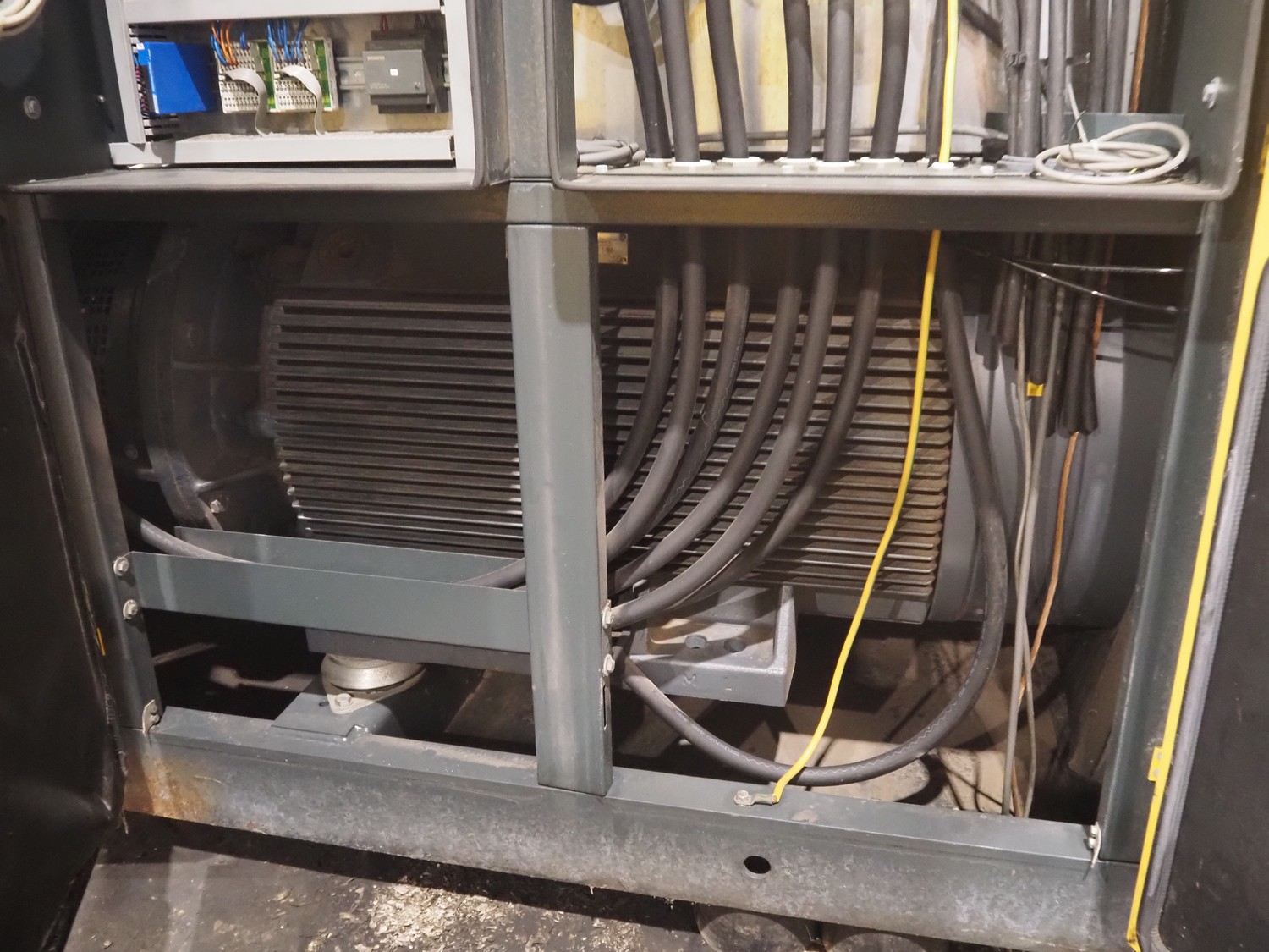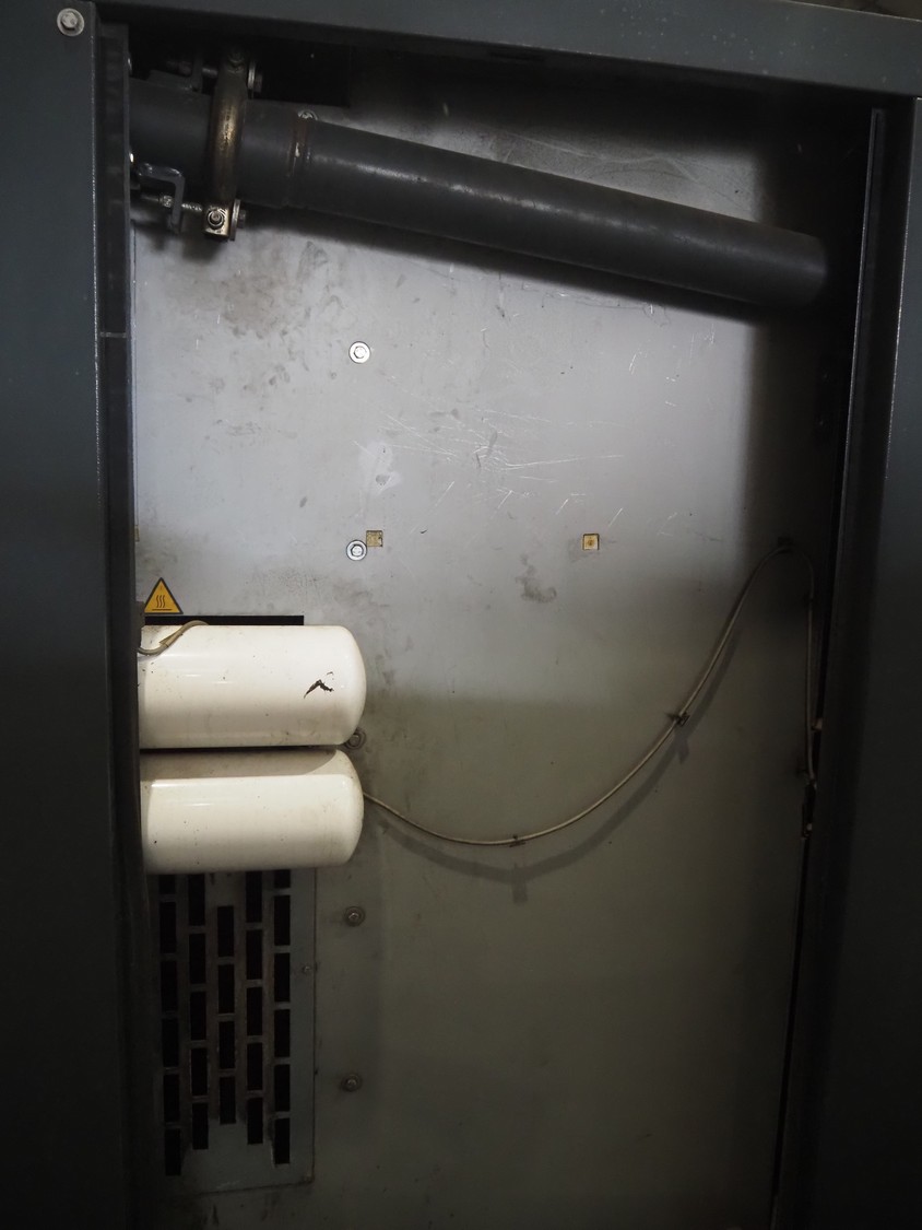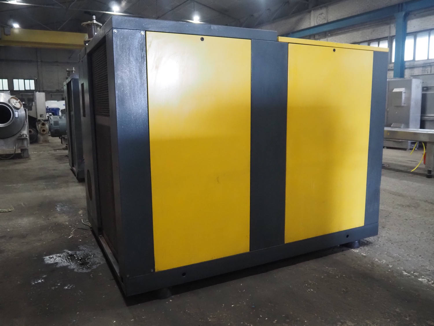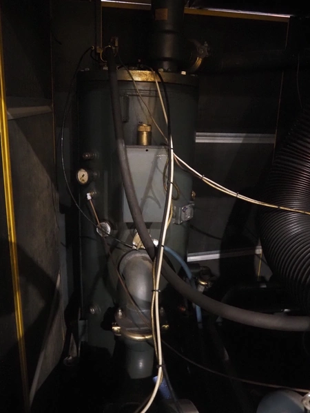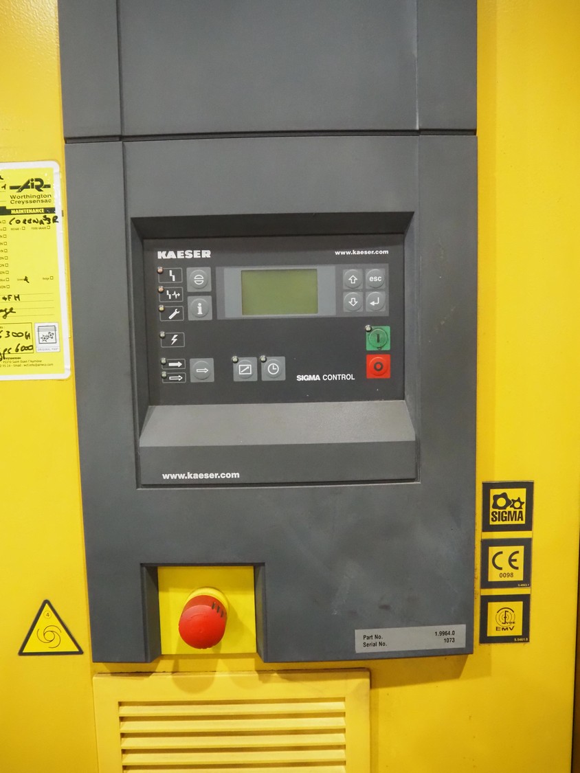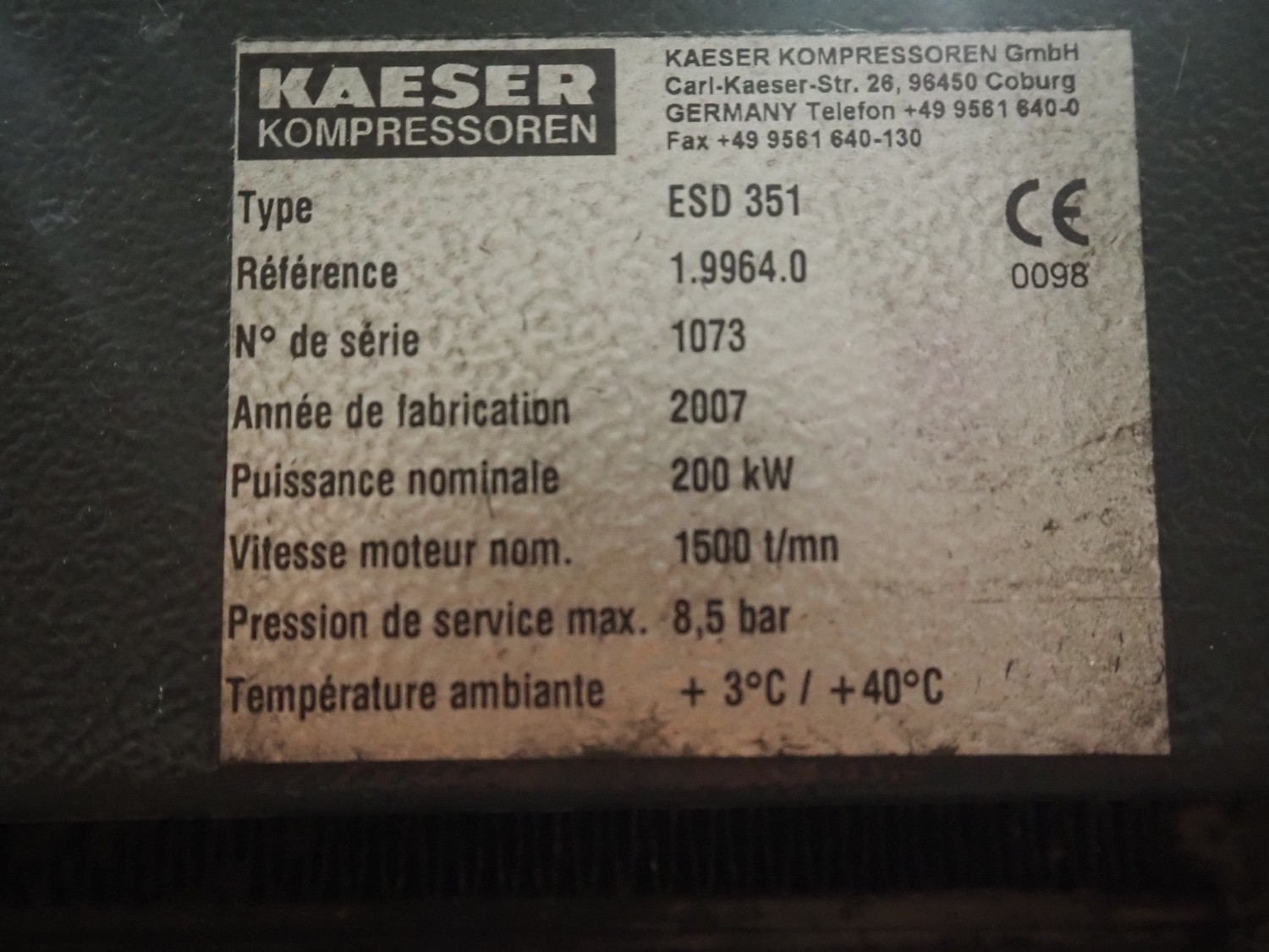 Kaeser kompressoren GmbH screw air compressor, model: ESD 351, serial number: 1073, year of construction: 2007, 400 V, 3 Ph, 50 Hz, 410 A, 200 kW, dimensions: 2650 mm x 2200 mm x 2350 mm. Including steel pressure vessel, number: 136 195, volume: 5000 liter, dimensions: ⌀ 1400 mm x 3900 mm, pallet with parts and switch cabinet, dimensions: 600 mm x 400 mm x 800 mm.
