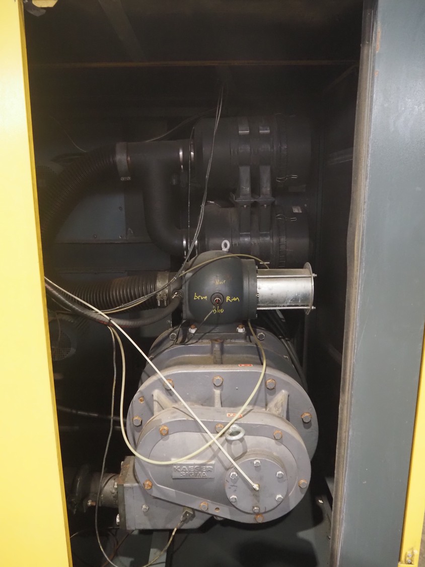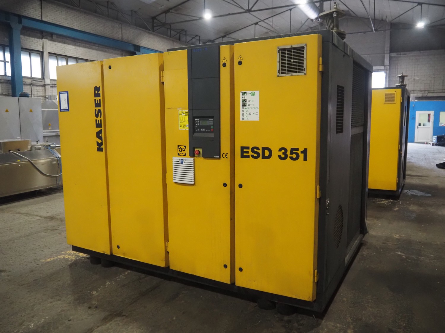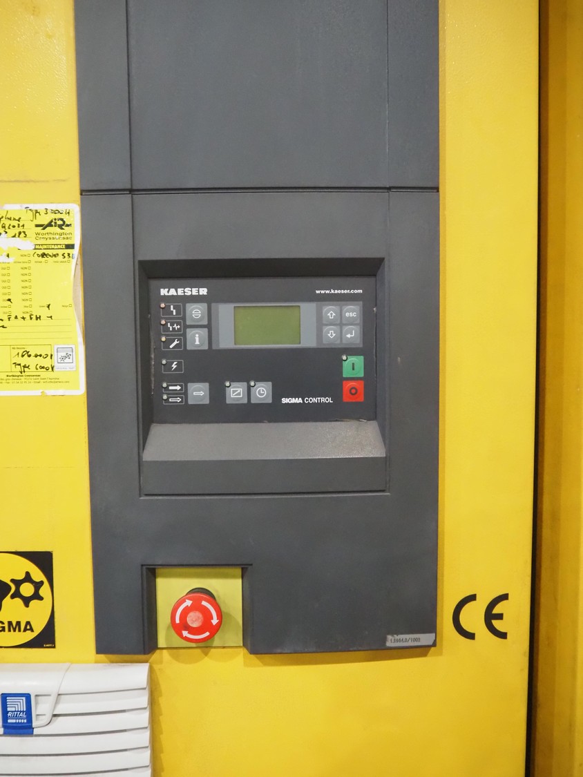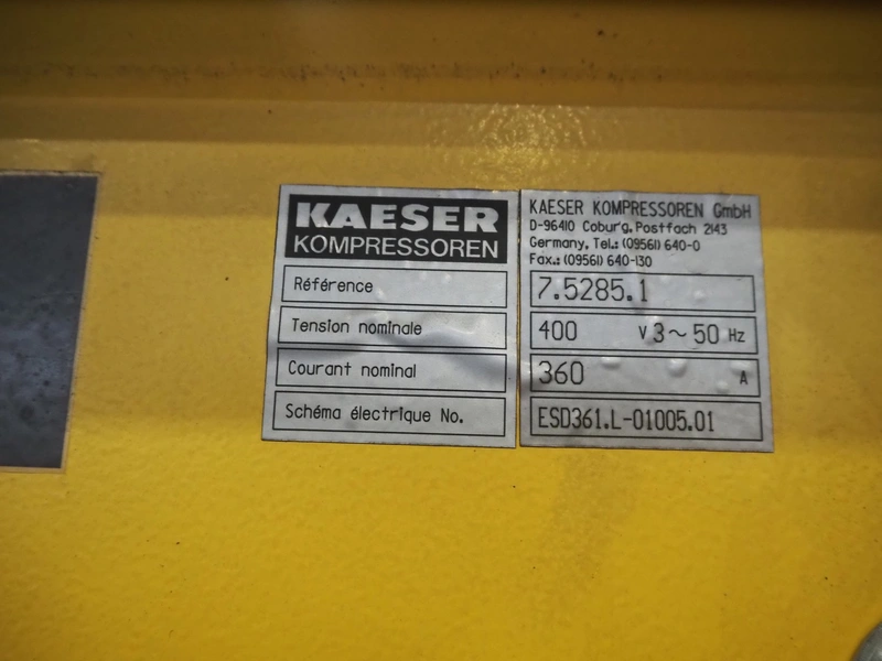 Kaeser kompressoren GmbH screw air compressor, model: ESD 351, serial number: 1002, year of construction: 2000, 400 V, 3 Ph, 50 Hz, 410 A, 200 kW, dimensions: 2650 mm x 2200 mm x 2350 mm. Including steel pressure vessel, number: 136 194, volume: 5000 liter, dimensions: ⌀ 1400 mm x 3900 mm and switch cabinet, dimensions: 600 mm x 400 mm x 800 mm.