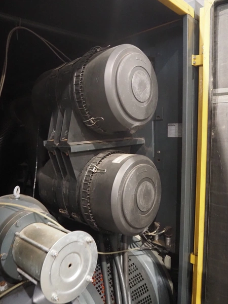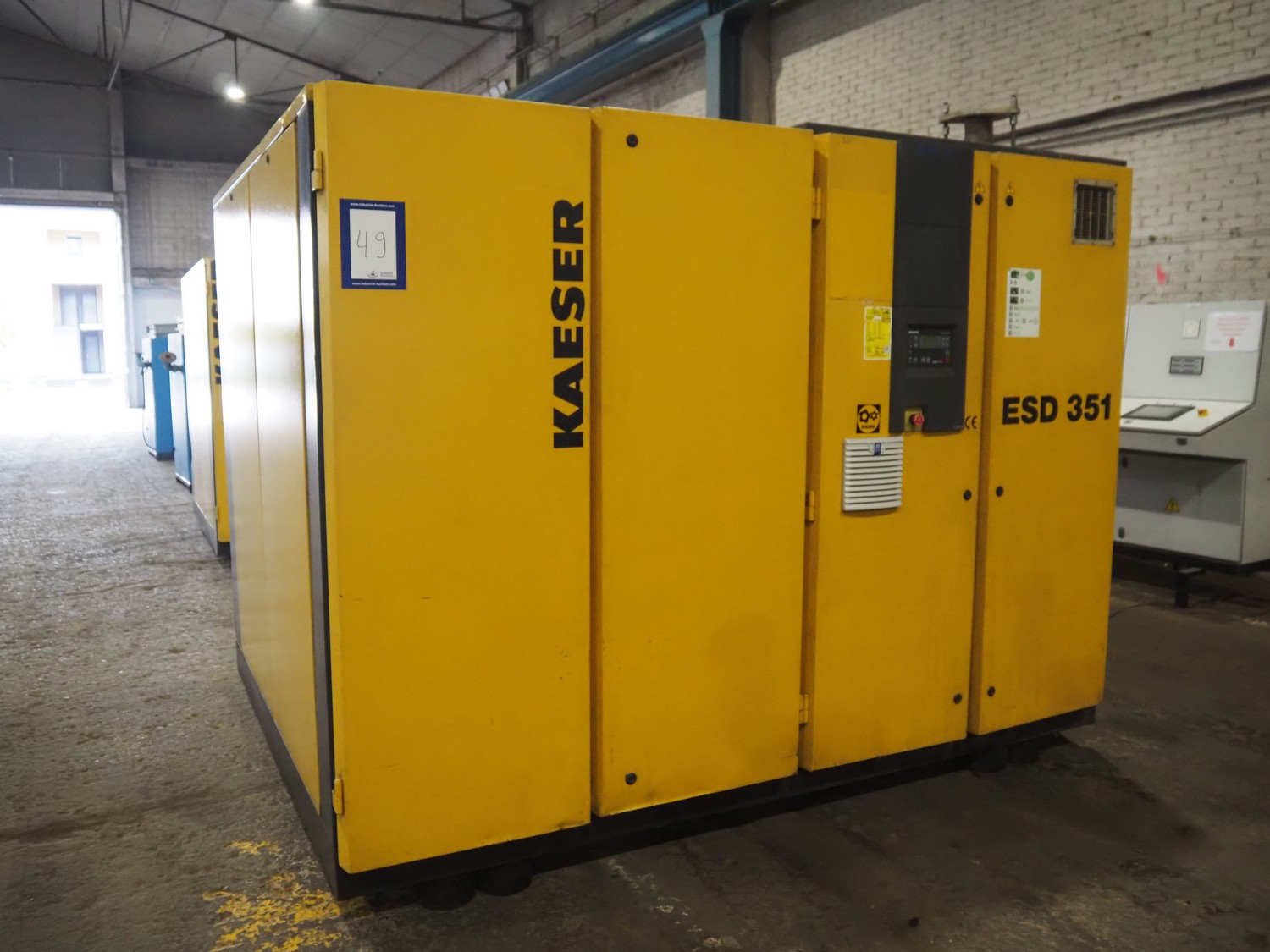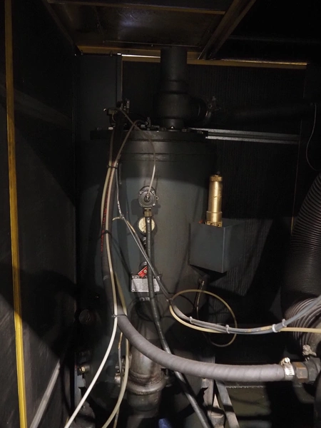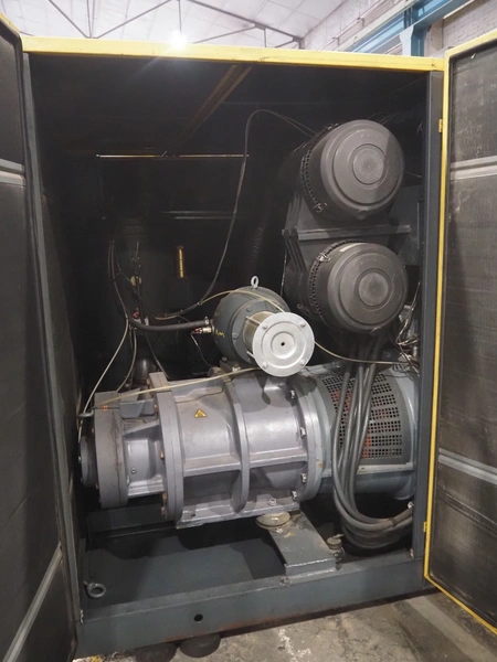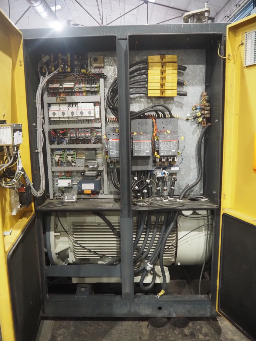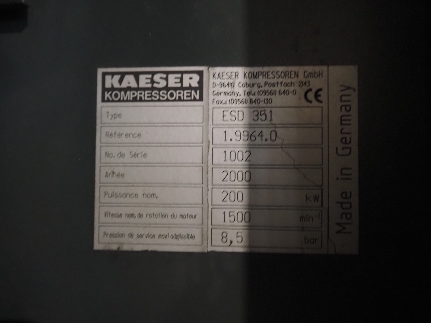 Kaeser kompressoren GmbH screw air compressor, model: ESD 351, serial number: 1002, year of construction: 2000, 400 V, 3 Ph, 50 Hz, 410 A, 200 kW, dimensions: 2650 mm x 2200 mm x 2350 mm. Including steel pressure vessel, number: 136 194, volume: 5000 liter, dimensions: ⌀ 1400 mm x 3900 mm and switch cabinet, dimensions: 600 mm x 400 mm x 800 mm.