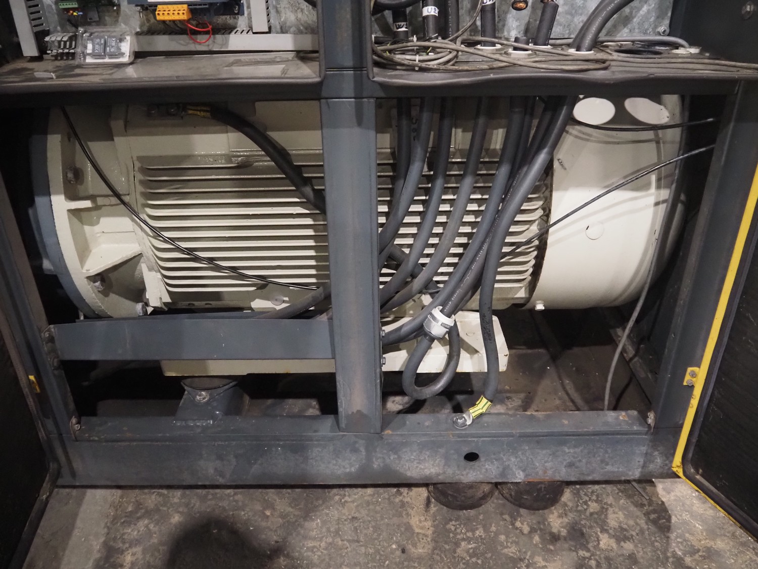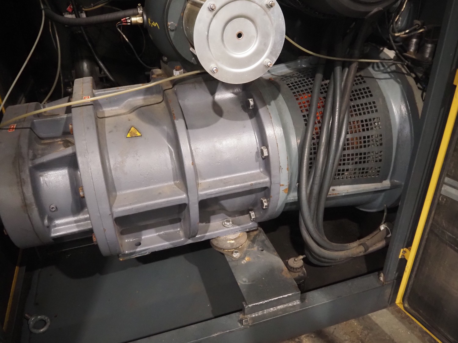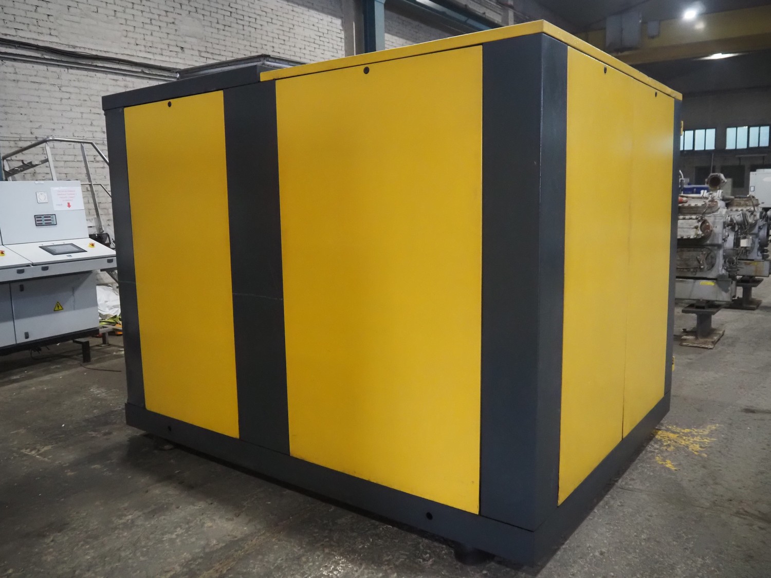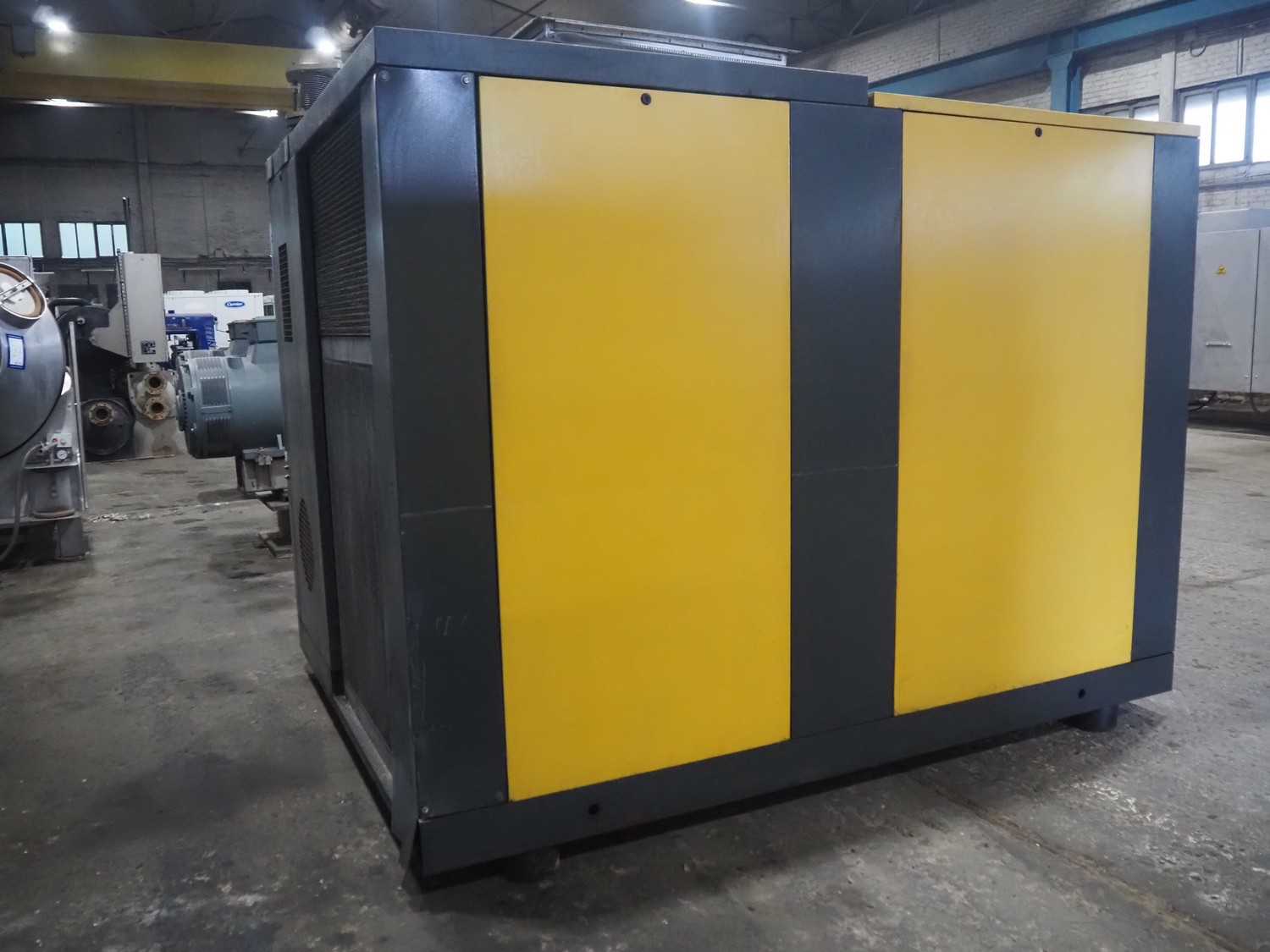 Kaeser kompressoren GmbH screw air compressor, model: ESD 351, serial number: 1002, year of construction: 2000, 400 V, 3 Ph, 50 Hz, 410 A, 200 kW, dimensions: 2650 mm x 2200 mm x 2350 mm. Including steel pressure vessel, number: 136 194, volume: 5000 liter, dimensions: ⌀ 1400 mm x 3900 mm and switch cabinet, dimensions: 600 mm x 400 mm x 800 mm.