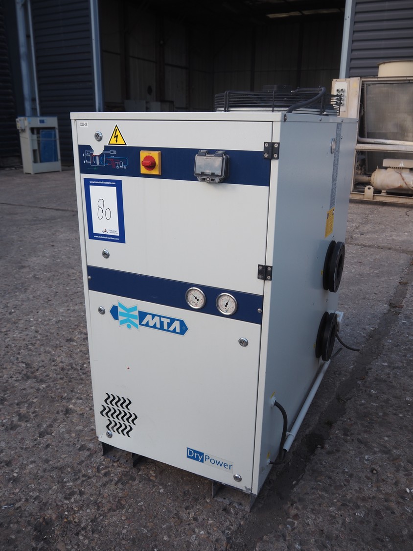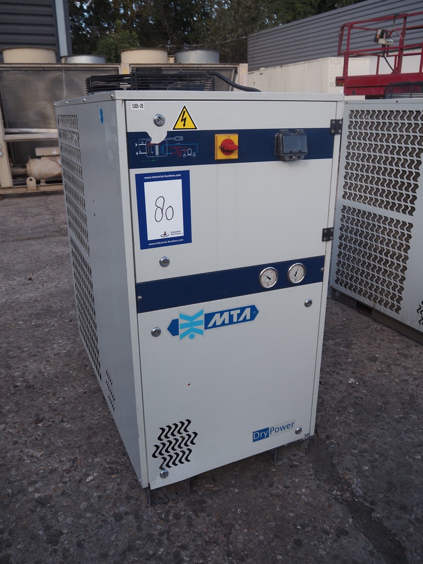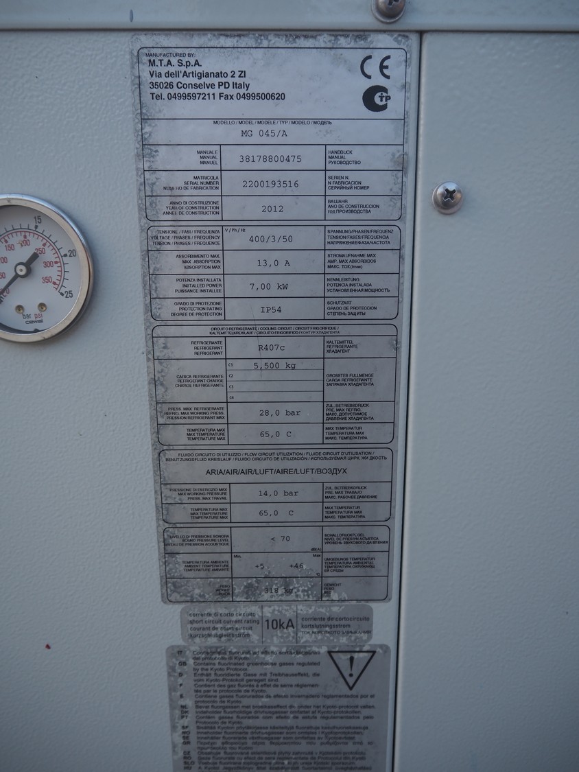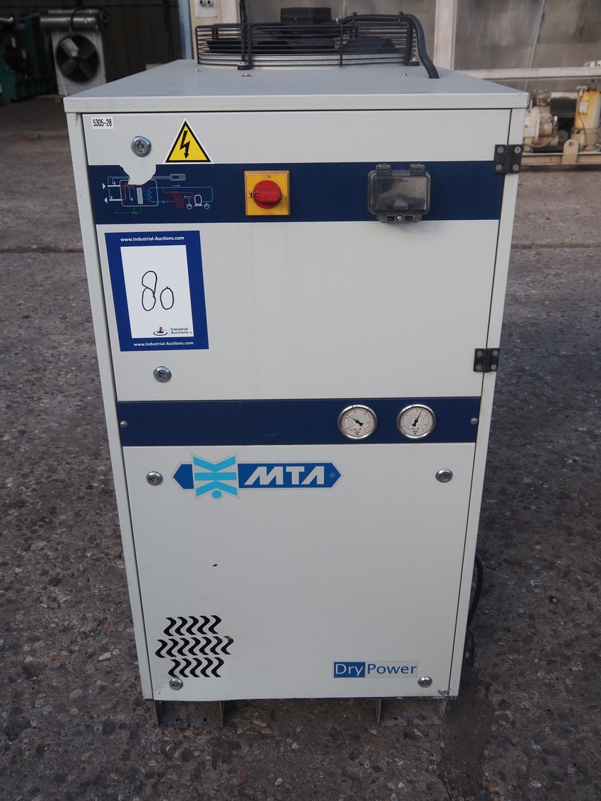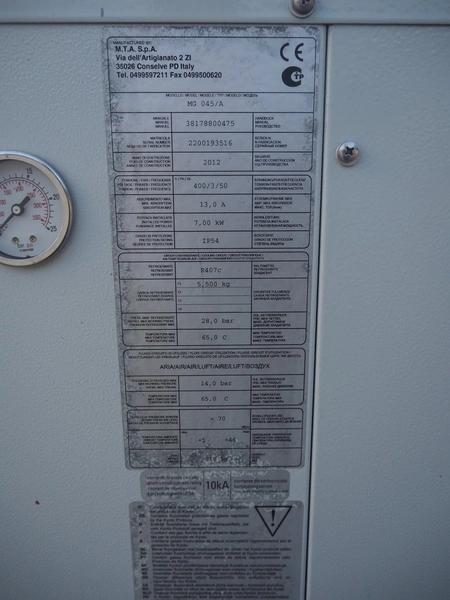 M.T.A. S.p.A. air dryer, model: MG 045/A, serial number: 2200193516, year of construction: 2012, 400 V, 3 Ph, 50 Hz, 13 A, 7 kW, weight: 318 kg, refrigerant: R407A, 5.5 kg, 1 fan, dimensions: 2250 mm x 660 mm x 1400 mm.