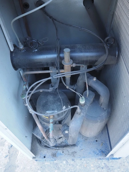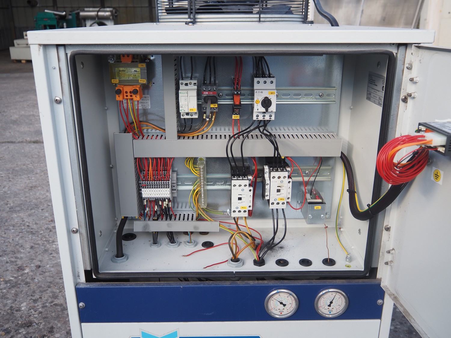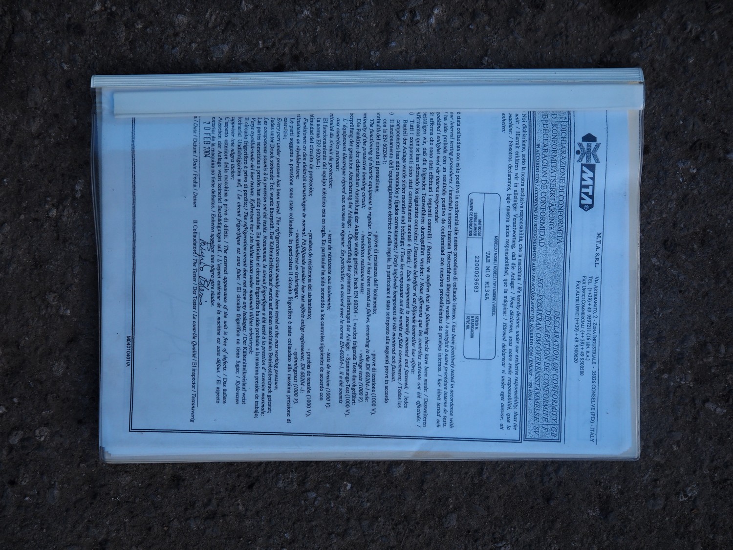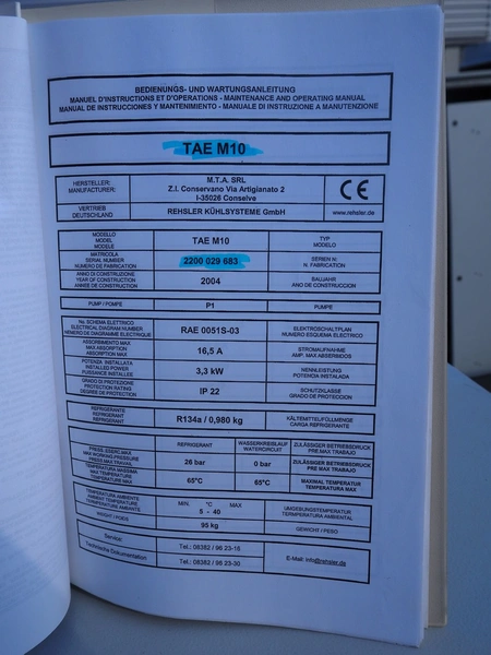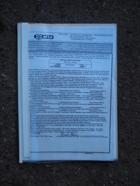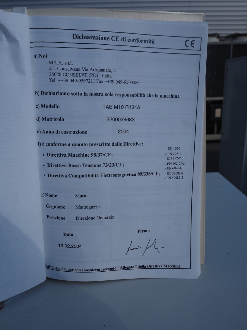 M.T.A. S.p.A. air dryer, model: MG 045/A, serial number: 2200193516, year of construction: 2012, 400 V, 3 Ph, 50 Hz, 13 A, 7 kW, weight: 318 kg, refrigerant: R407A, 5.5 kg, 1 fan, dimensions: 2250 mm x 660 mm x 1400 mm.