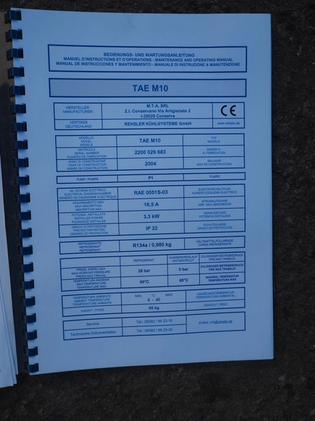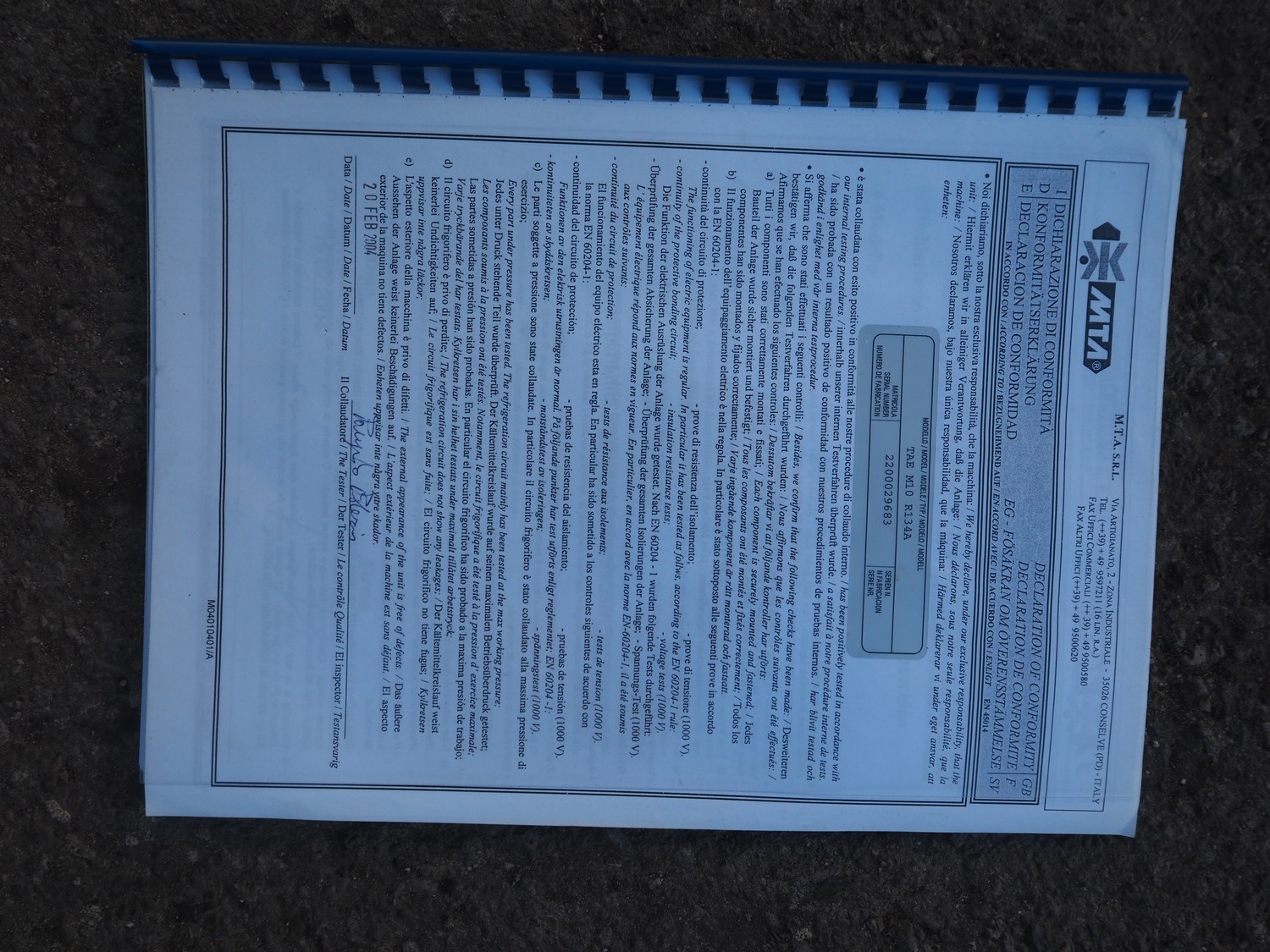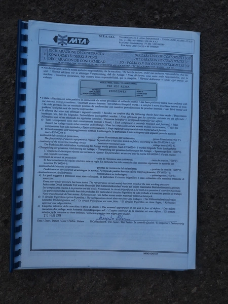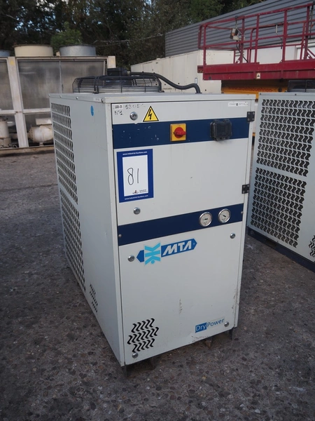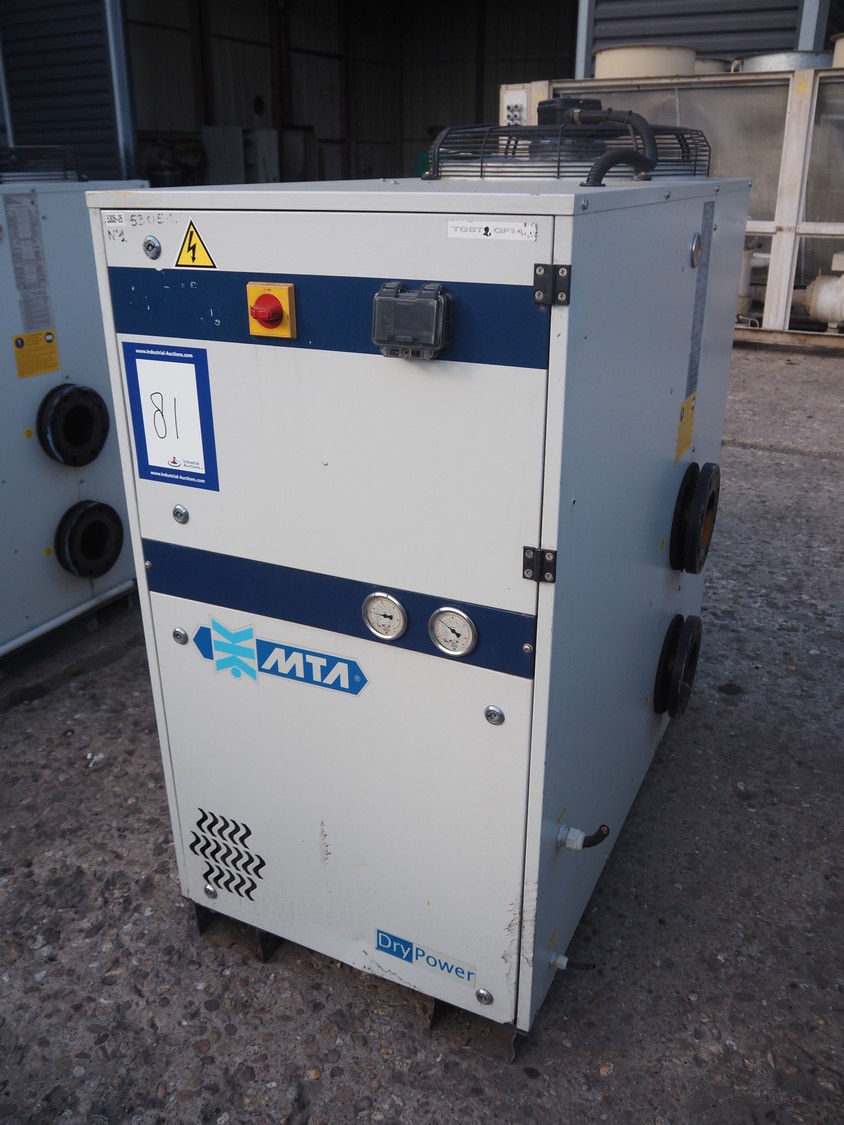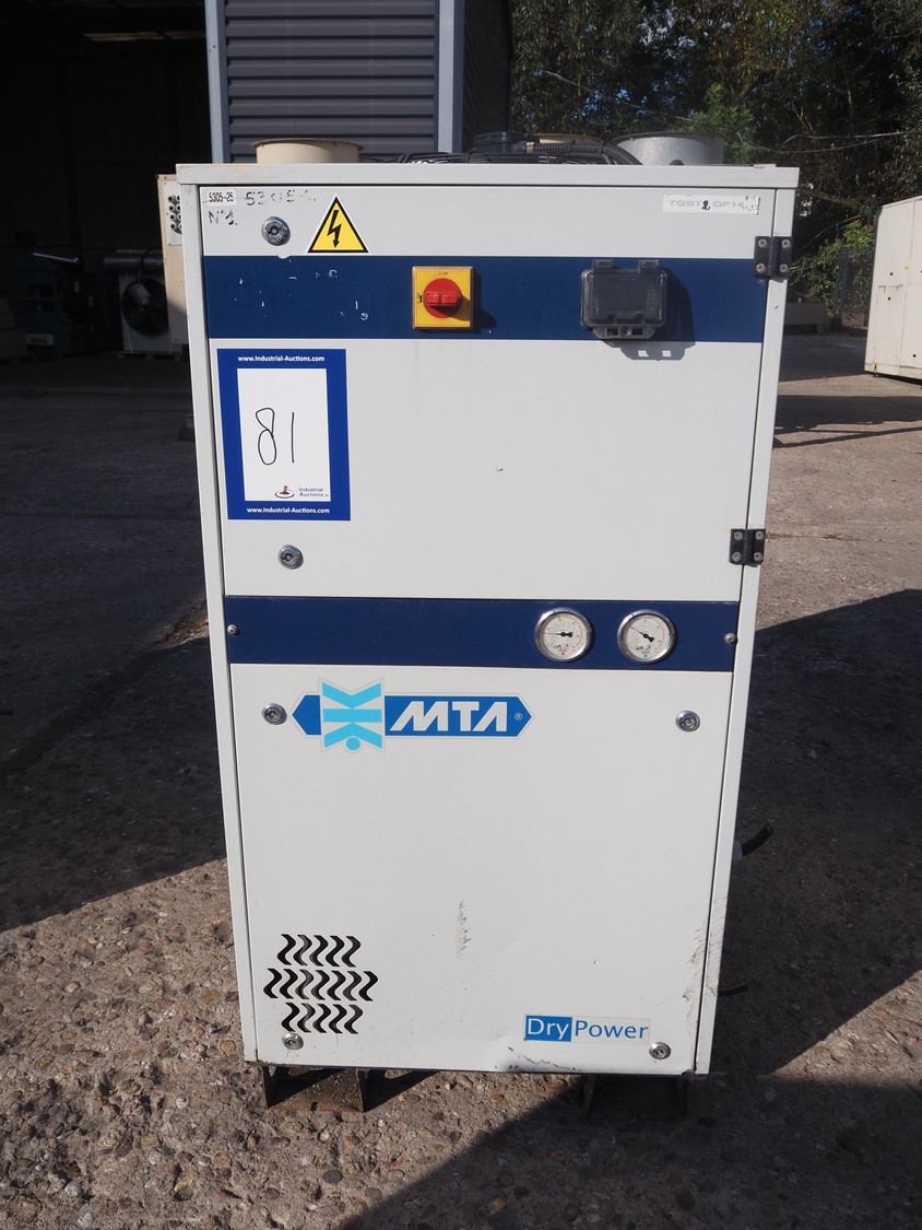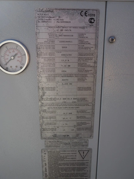 M.T.A. S.p.A. air dryer, model: MG 045/A, serial number: 2200144811, year of construction: 2009, 400 V, 3 Ph, 50 Hz, 13 A, 7,1 kW, weight: 318 kg, refrigerant: R407C, 6.6 kg, 1 fan, dimensions: 2250 mm x 660 mm x 1400 mm.