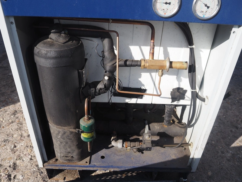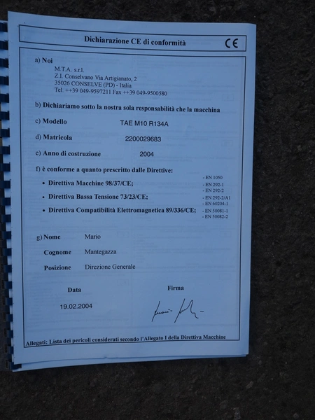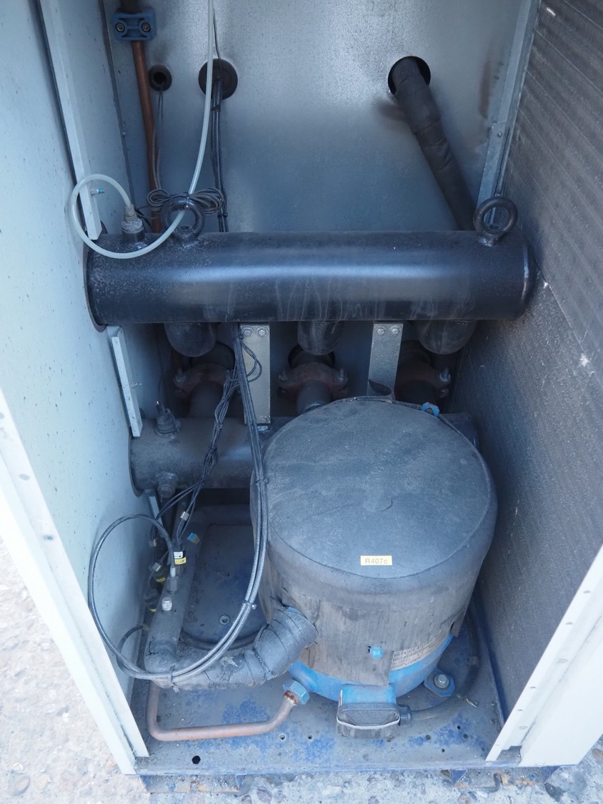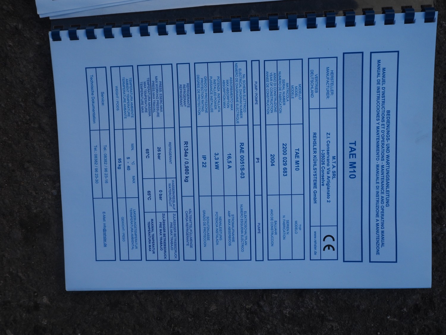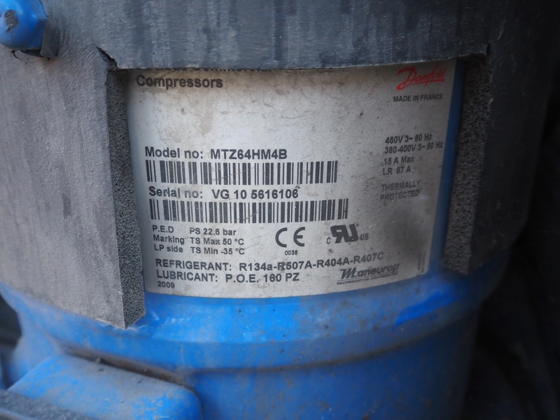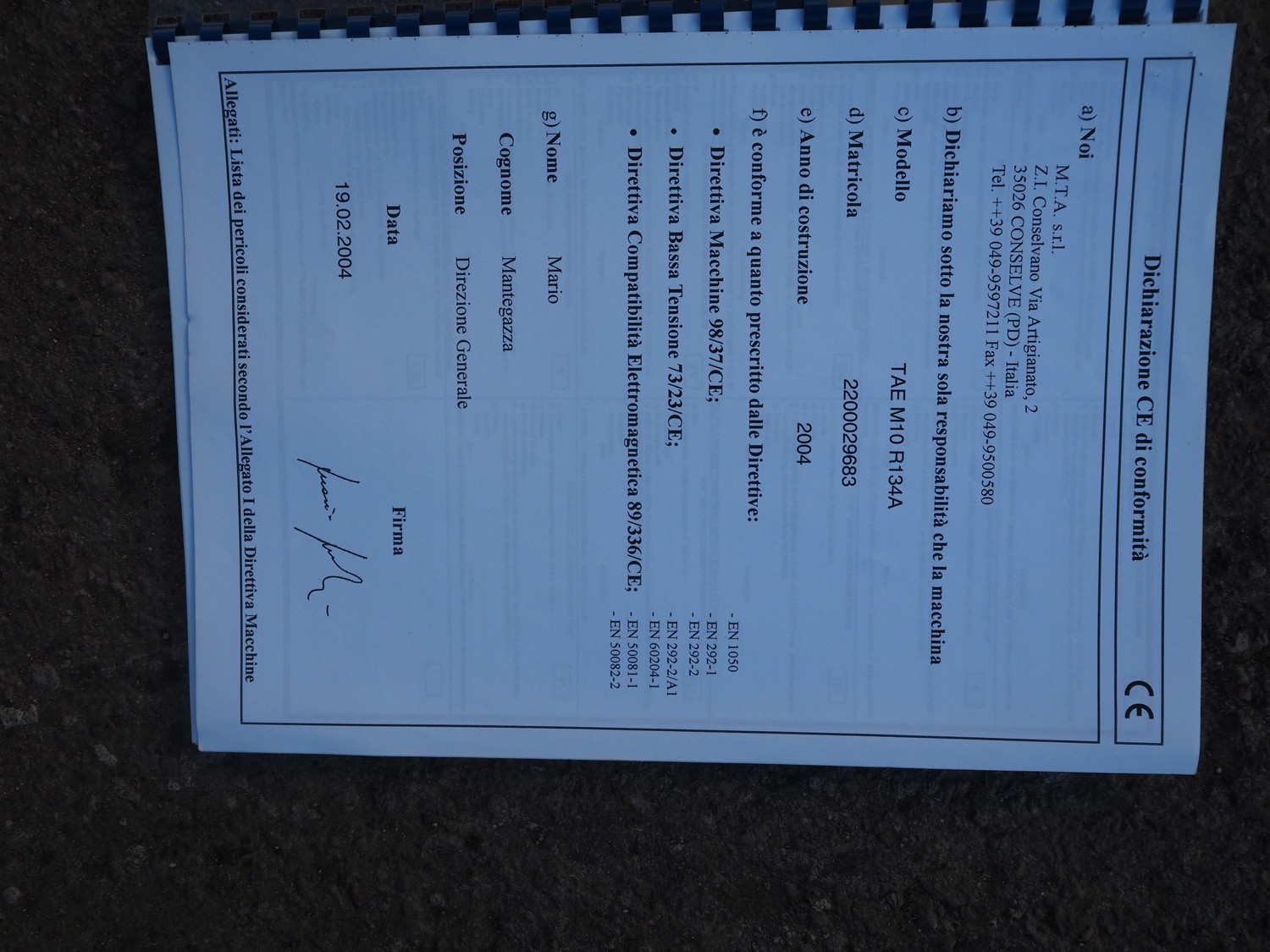 M.T.A. S.p.A. air dryer, model: MG 045/A, serial number: 2200144811, year of construction: 2009, 400 V, 3 Ph, 50 Hz, 13 A, 7,1 kW, weight: 318 kg, refrigerant: R407C, 6.6 kg, 1 fan, dimensions: 2250 mm x 660 mm x 1400 mm.