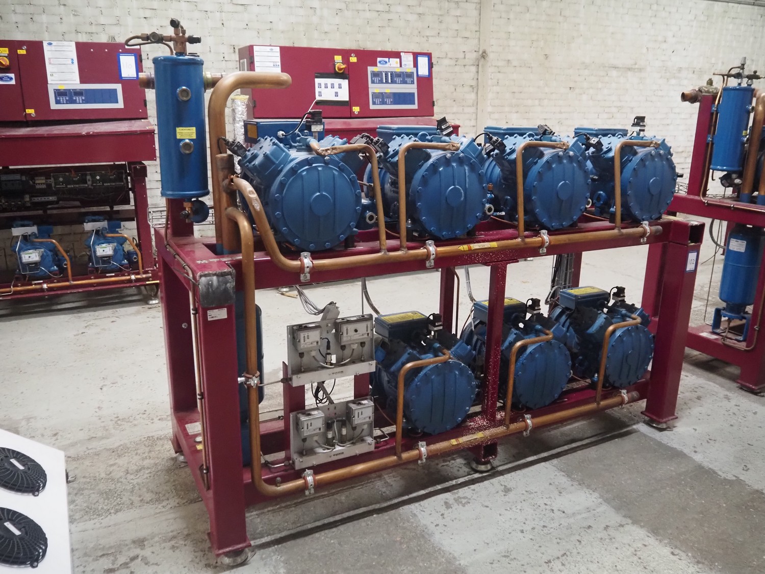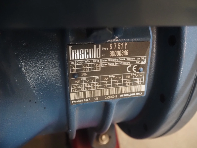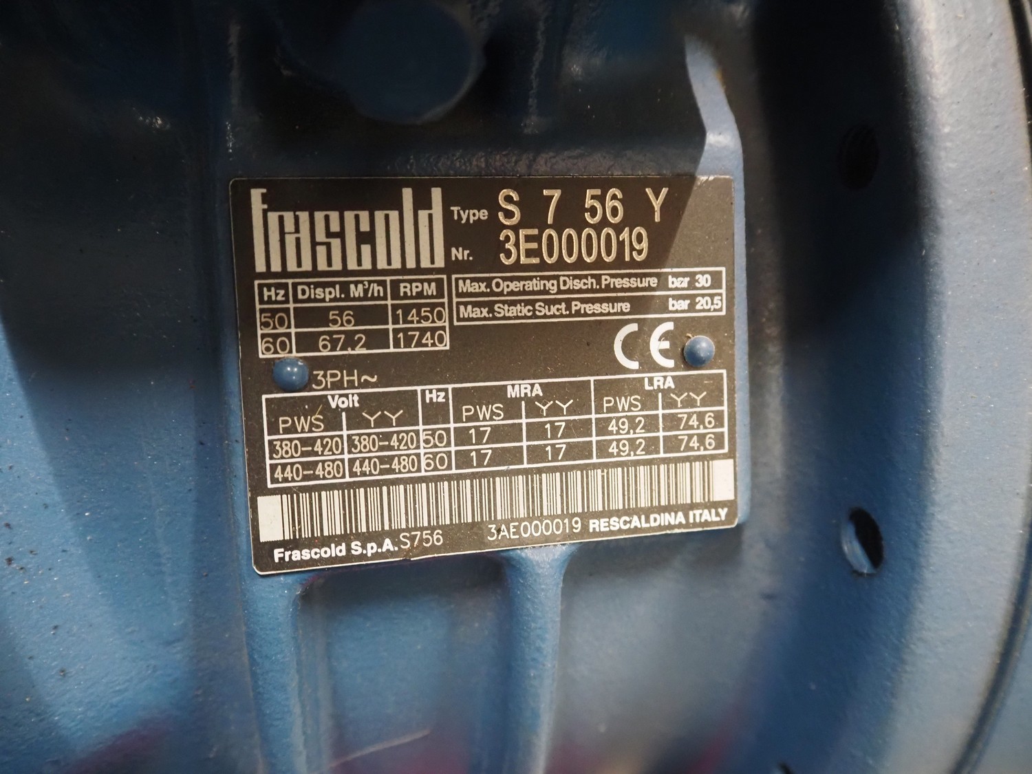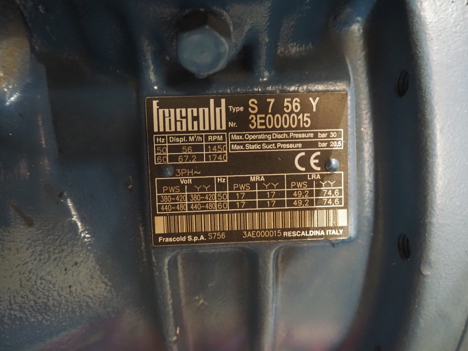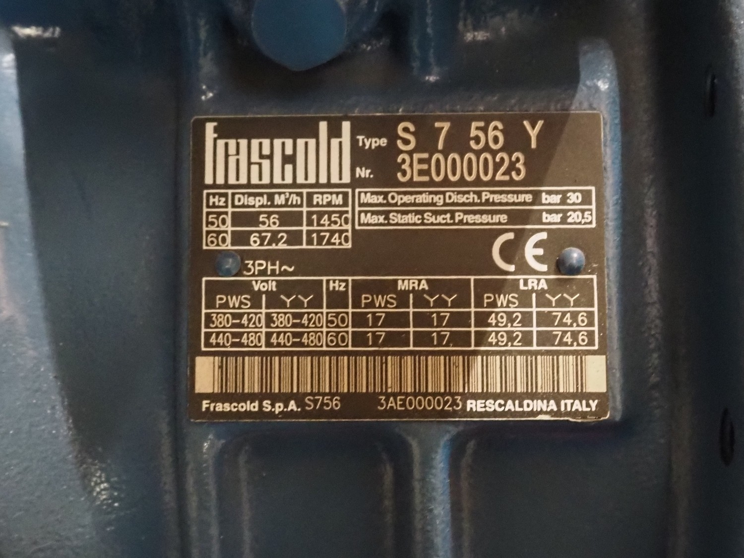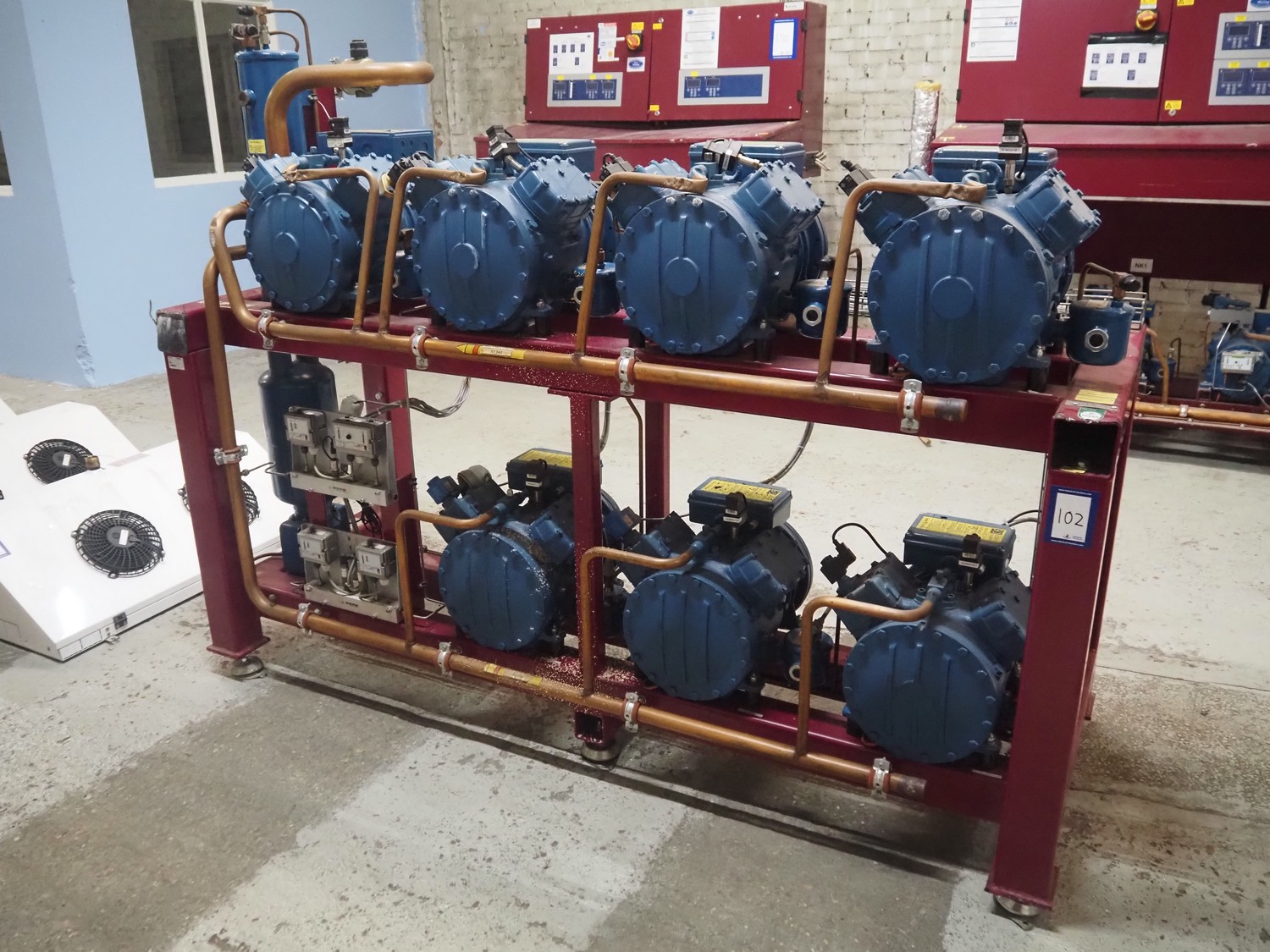 Teko compressor rack with 7 Frascold cooling compressors, type: (4x) S 7 56 Y, capacity: 56/67.2 m³ per hour, (2x) S 7 51 Y, capacity: 50.43/61.51 m³ per hour, (1x) S5-33Y, capacity: 32.8/39.36 m³ per hour, dimensions: 2180 mm x 820 mm x 1720 mm.