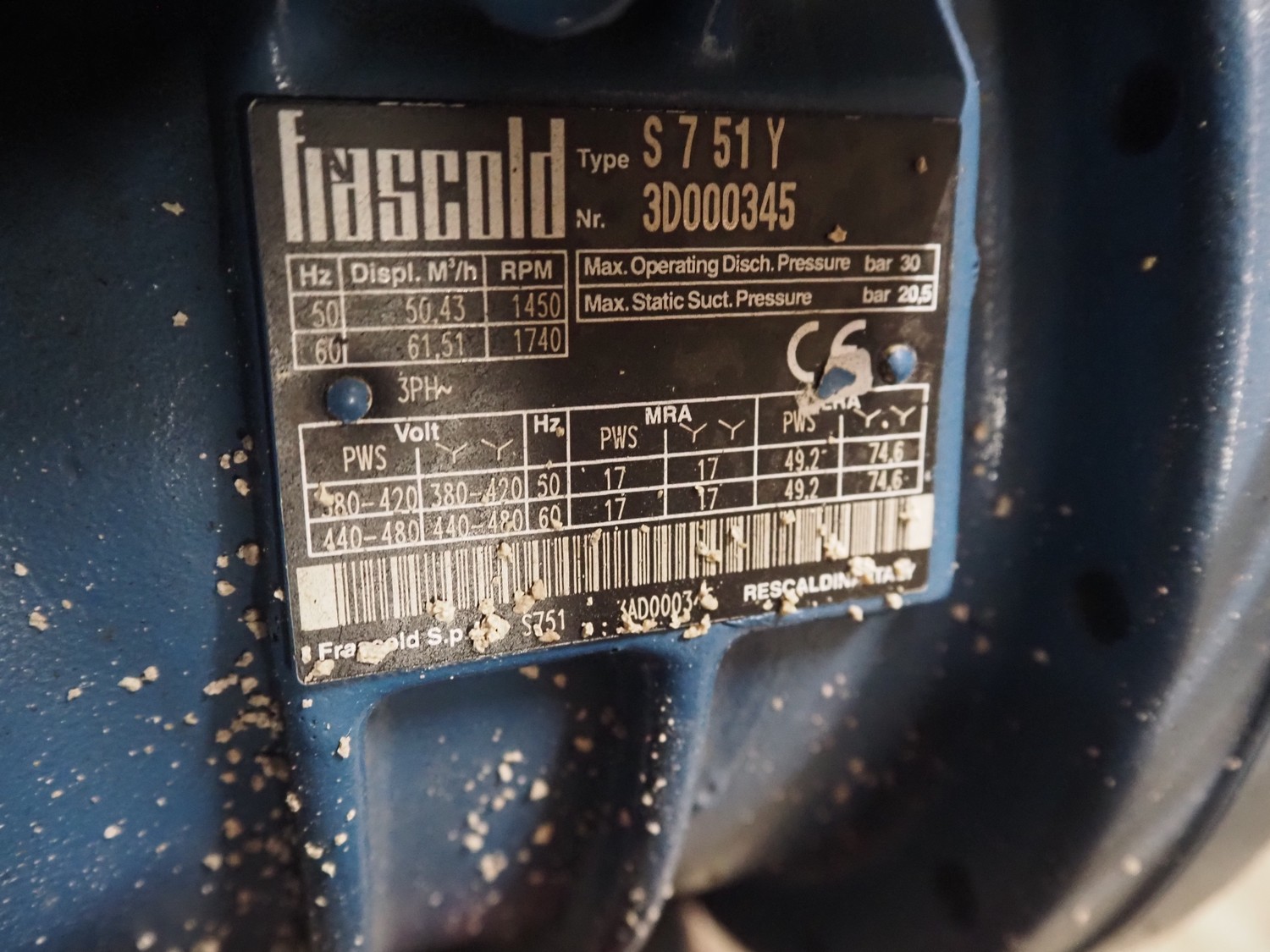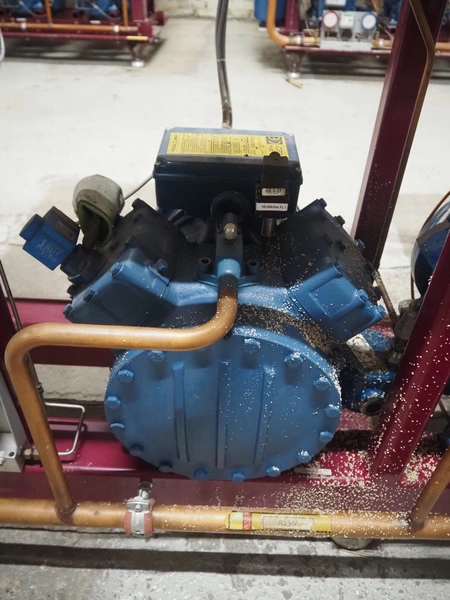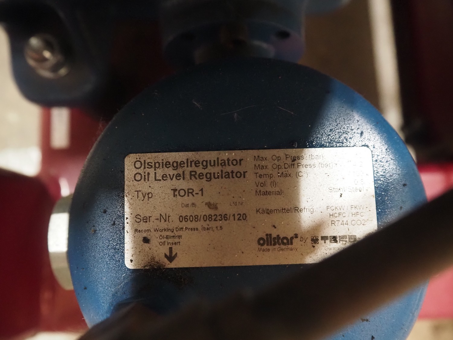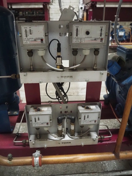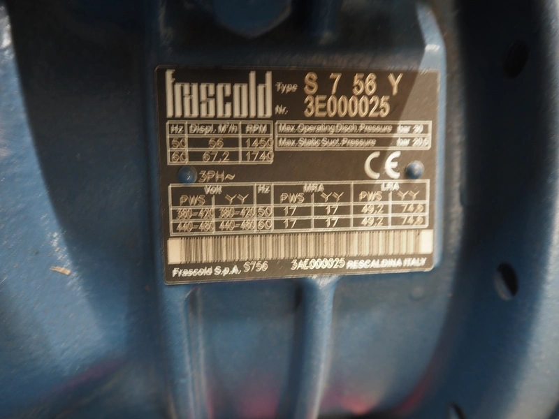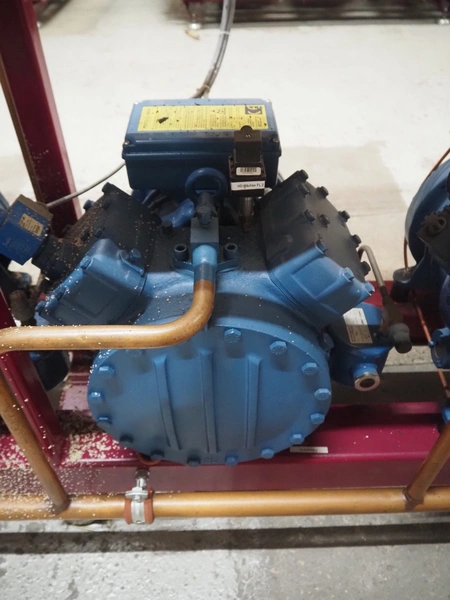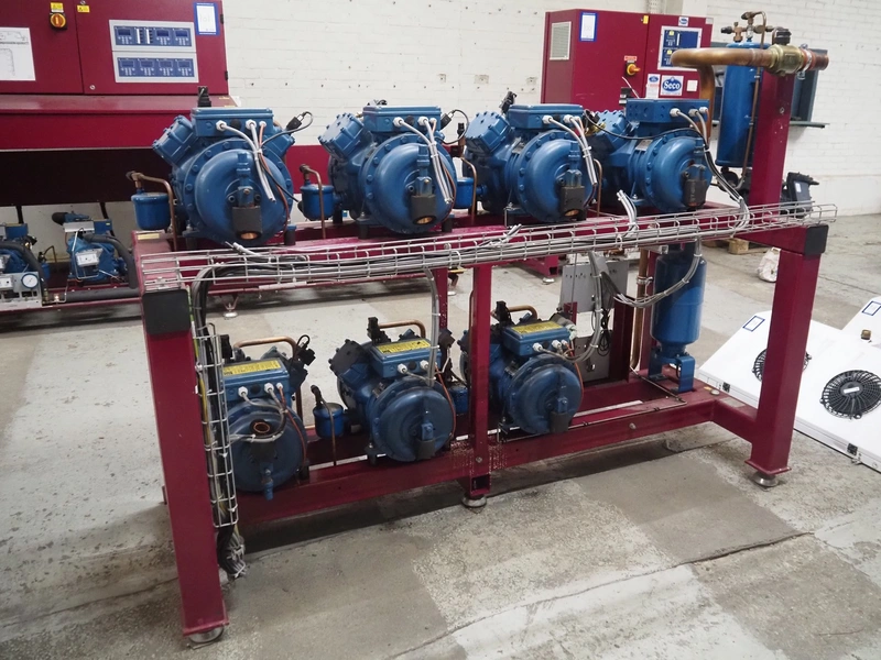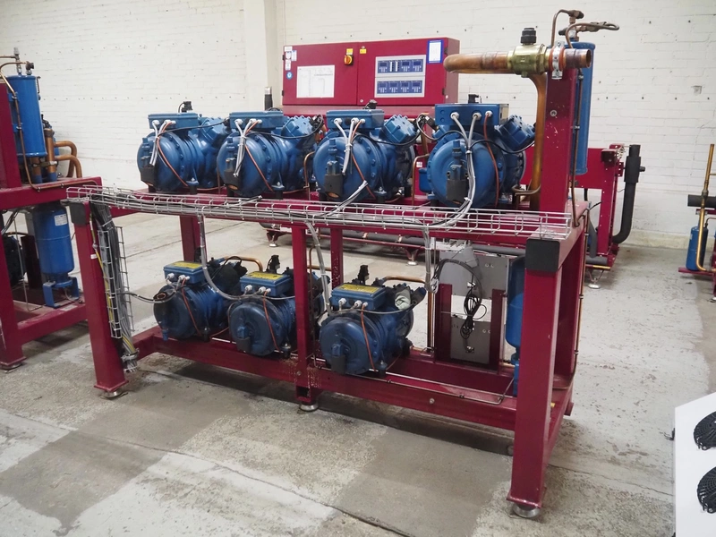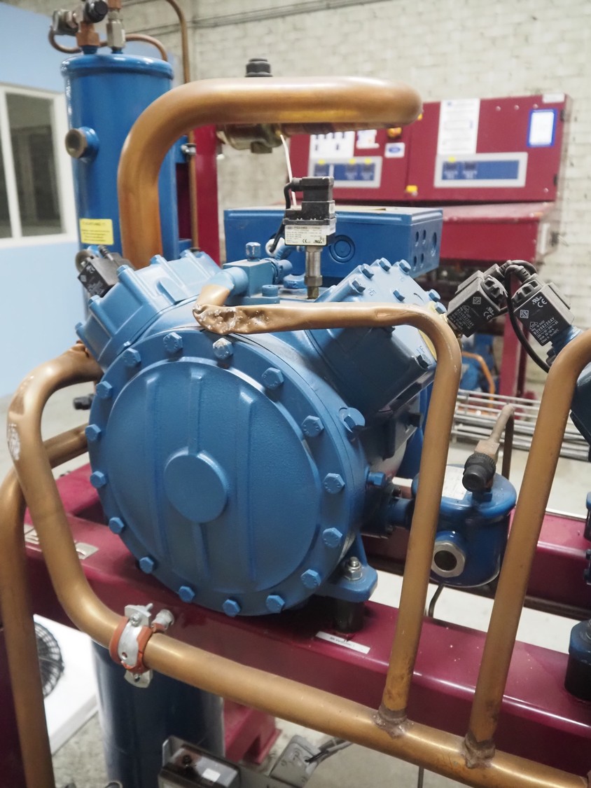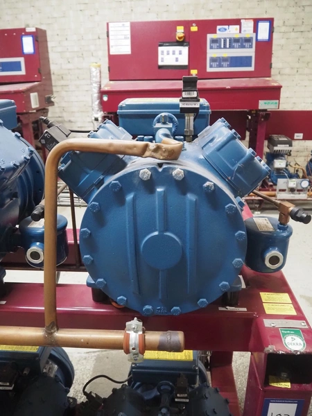 Teko compressor rack with 7 Frascold cooling compressors, type: (4x) S 7 56 Y, capacity: 56/67.2 m³ per hour, (2x) S 7 51 Y, capacity: 50.43/61.51 m³ per hour, (1x) S5-33Y, capacity: 32.8/39.36 m³ per hour, dimensions: 2180 mm x 820 mm x 1720 mm.
