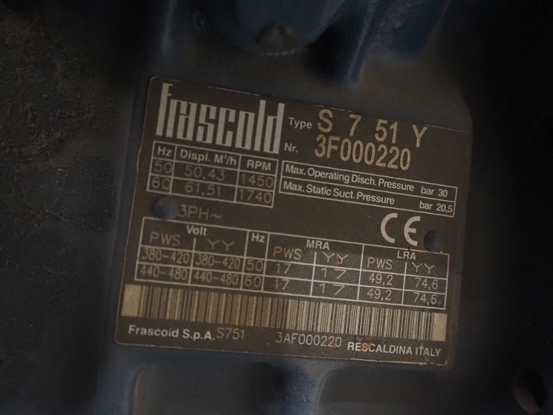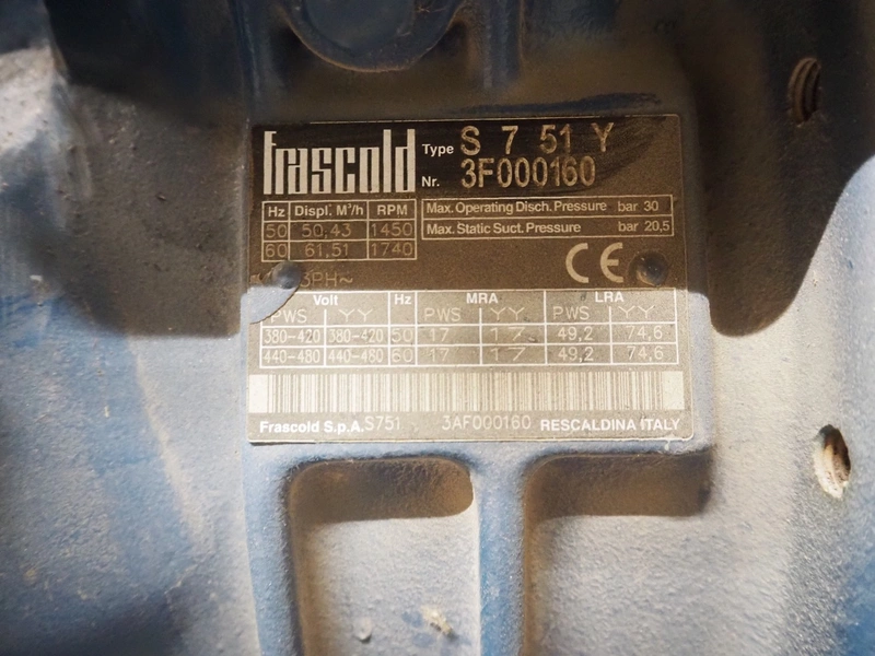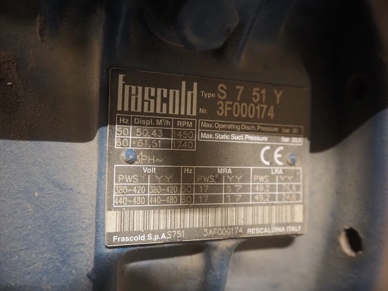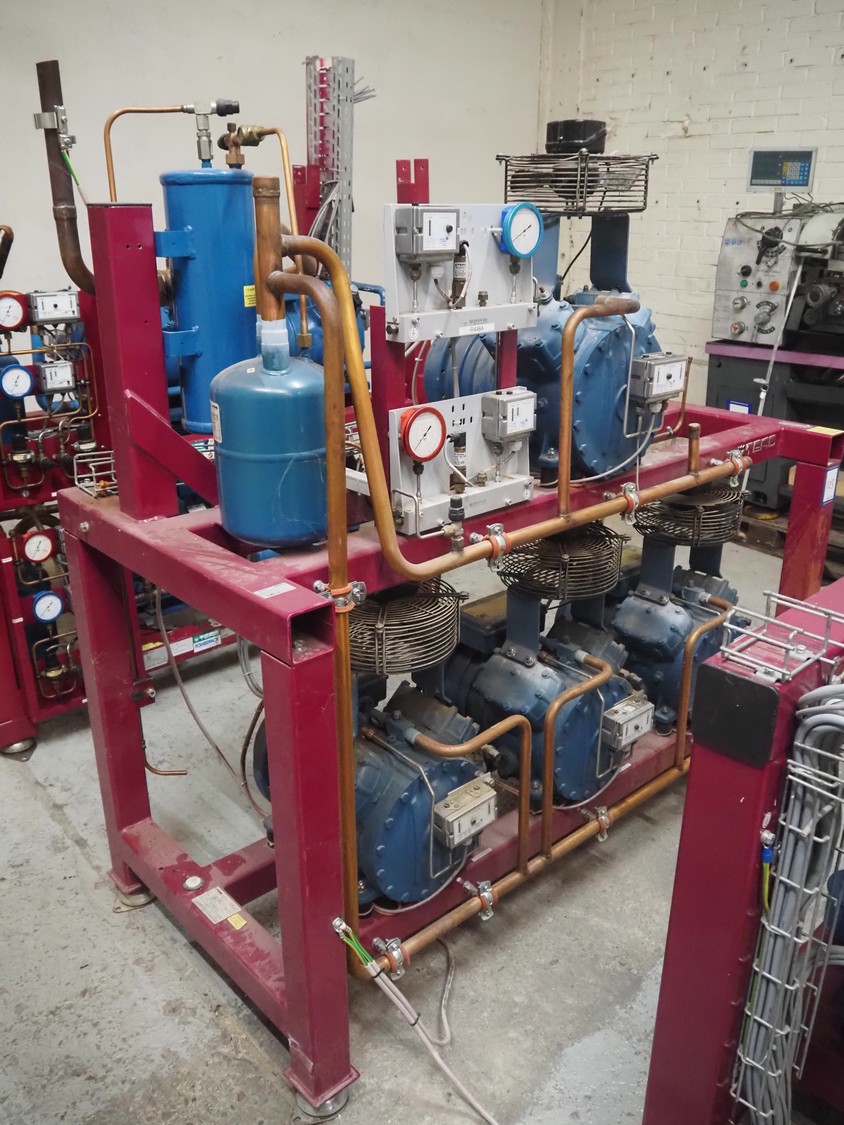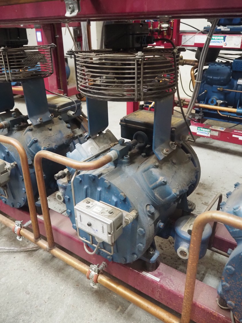 Teko compressor rack with 4 Frascold cooling compressors, type: (4x) S 7 51 Y, capacity: 50.43/61.51 m³ per hour, dimensions: 1650 mm x 810 mm x 1650 mm.
