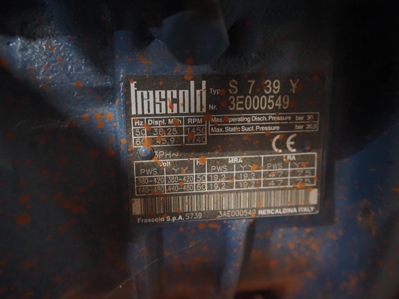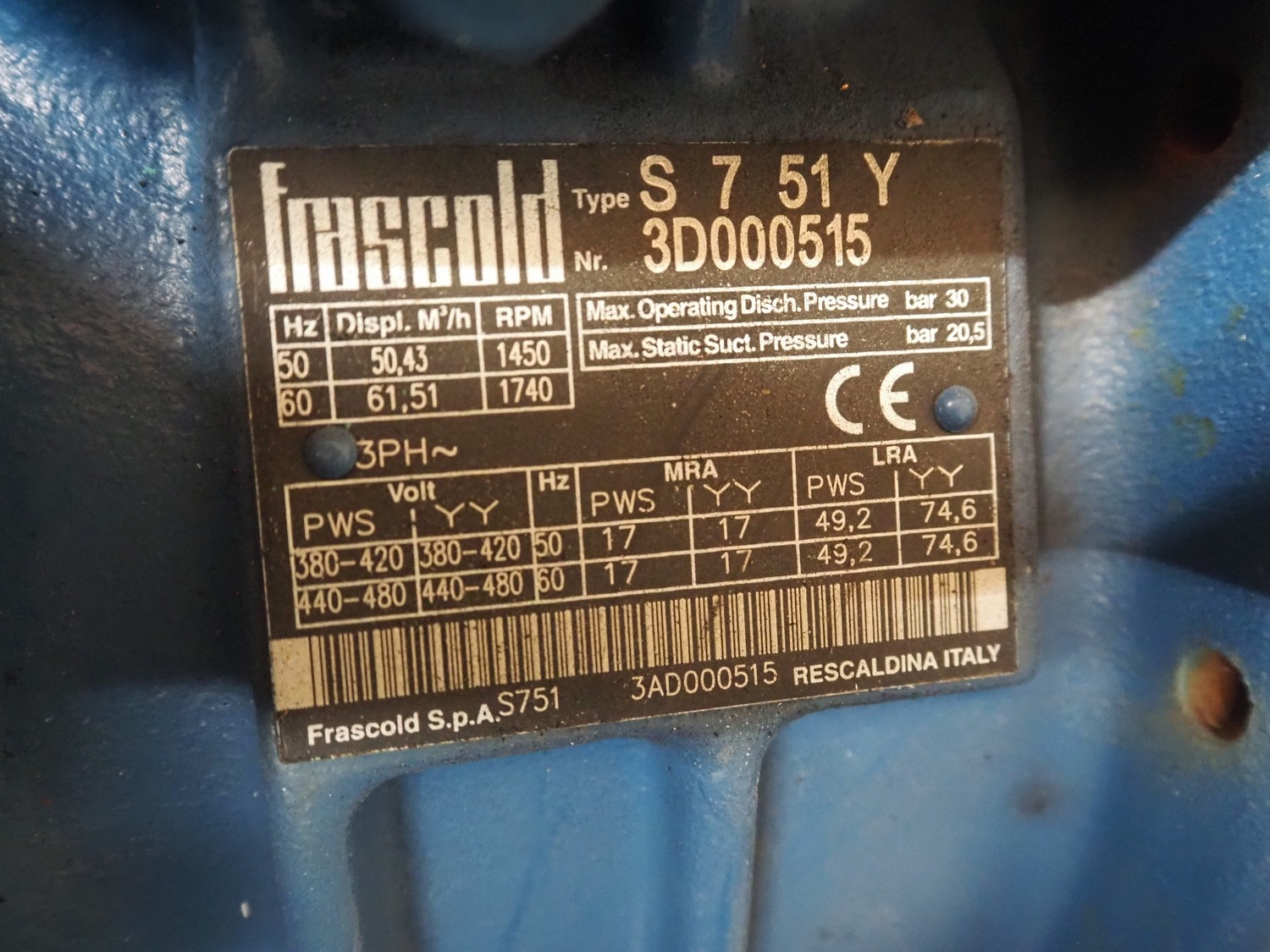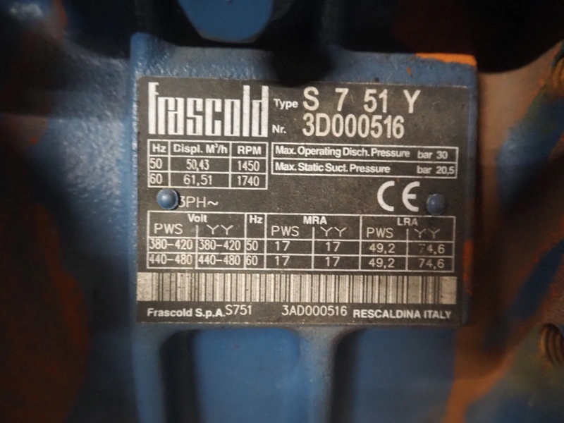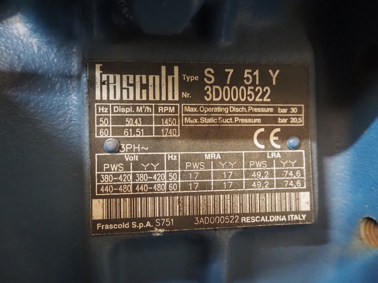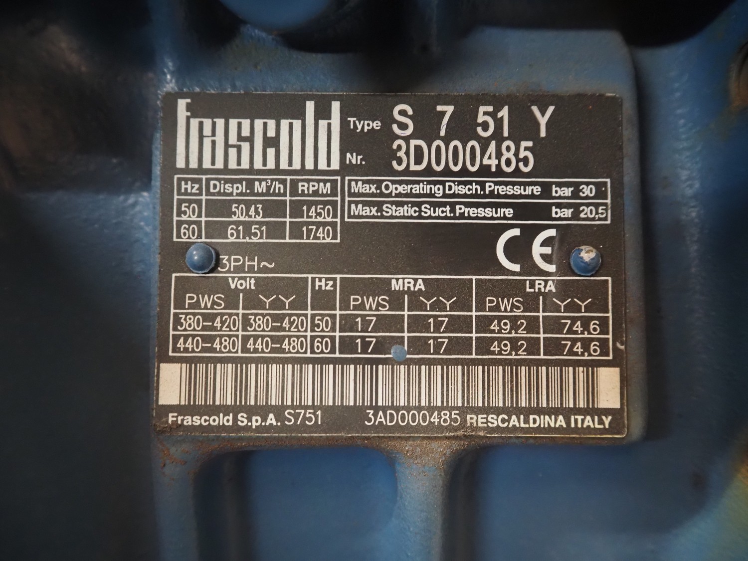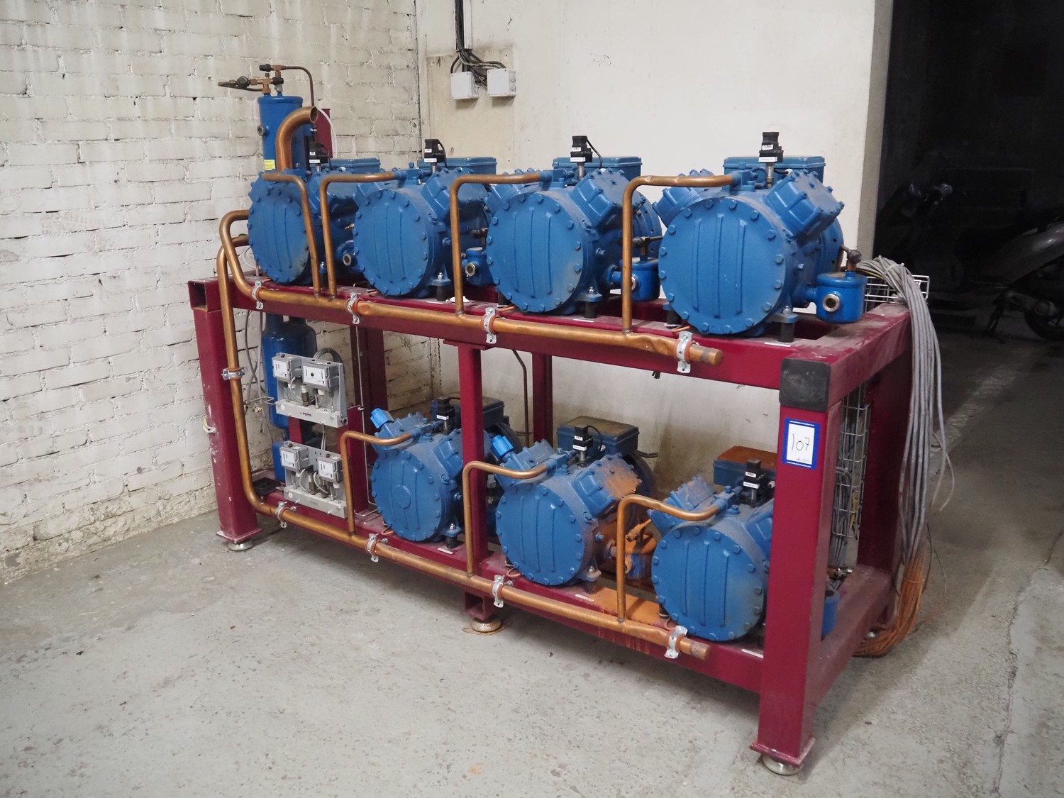 Teko compressor rack with 7 Frascold cooling compressors, type: (5x) S 7 51 Y, capacity: 50.43/61.51 m³ per hour, (2x) S 7 39 Y, capacity: 38.25/45.9 m³ per hour, dimensions: 2180 mm x 820 mm x 1720 mm.