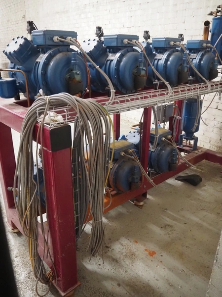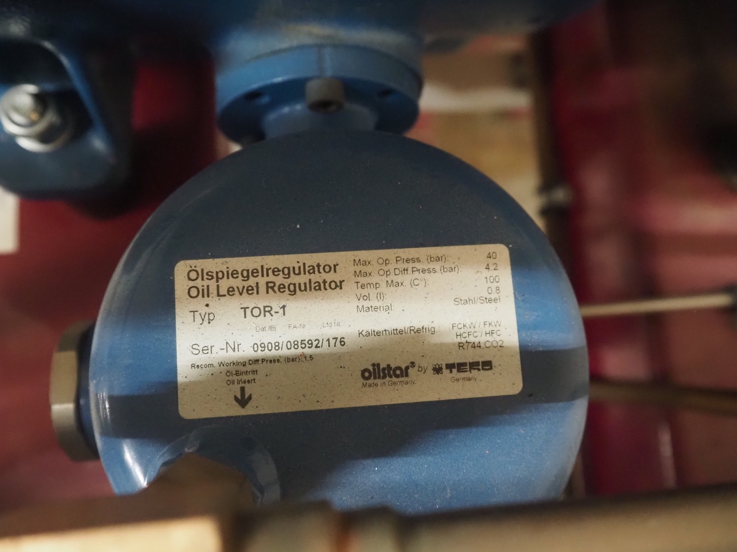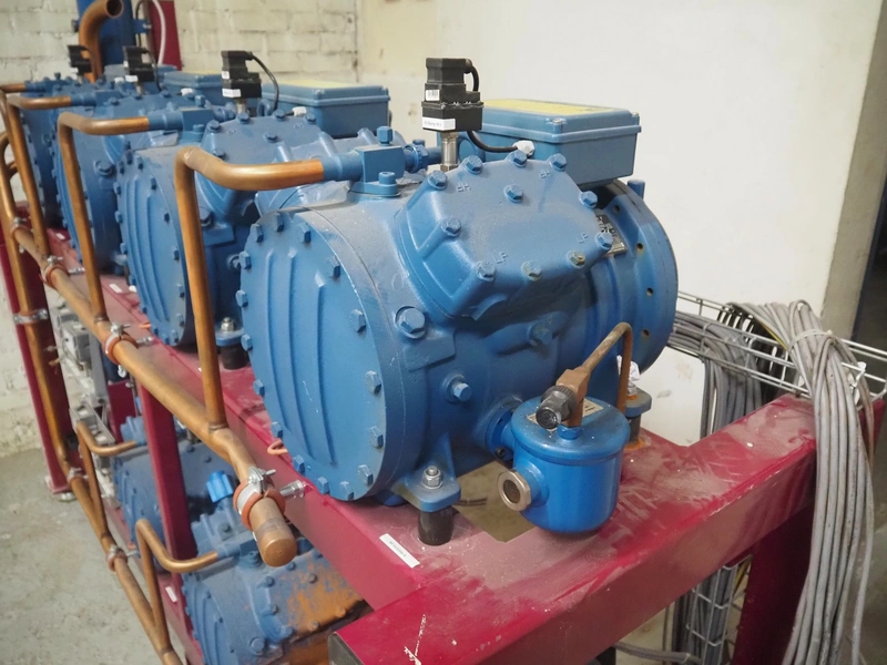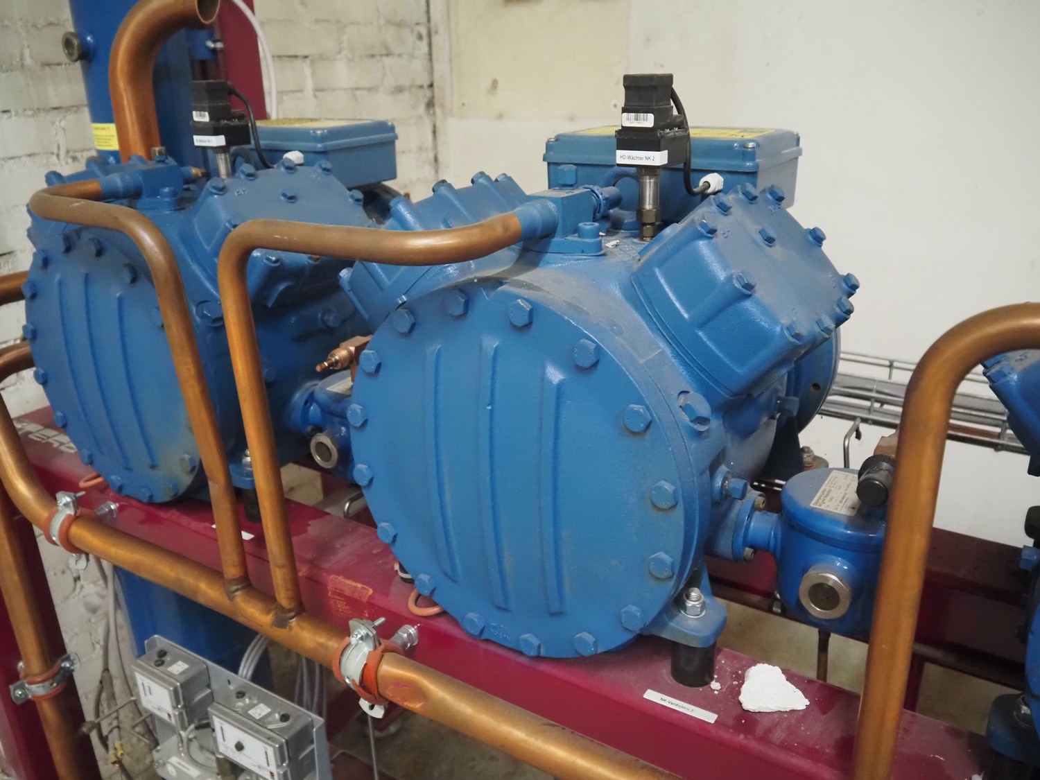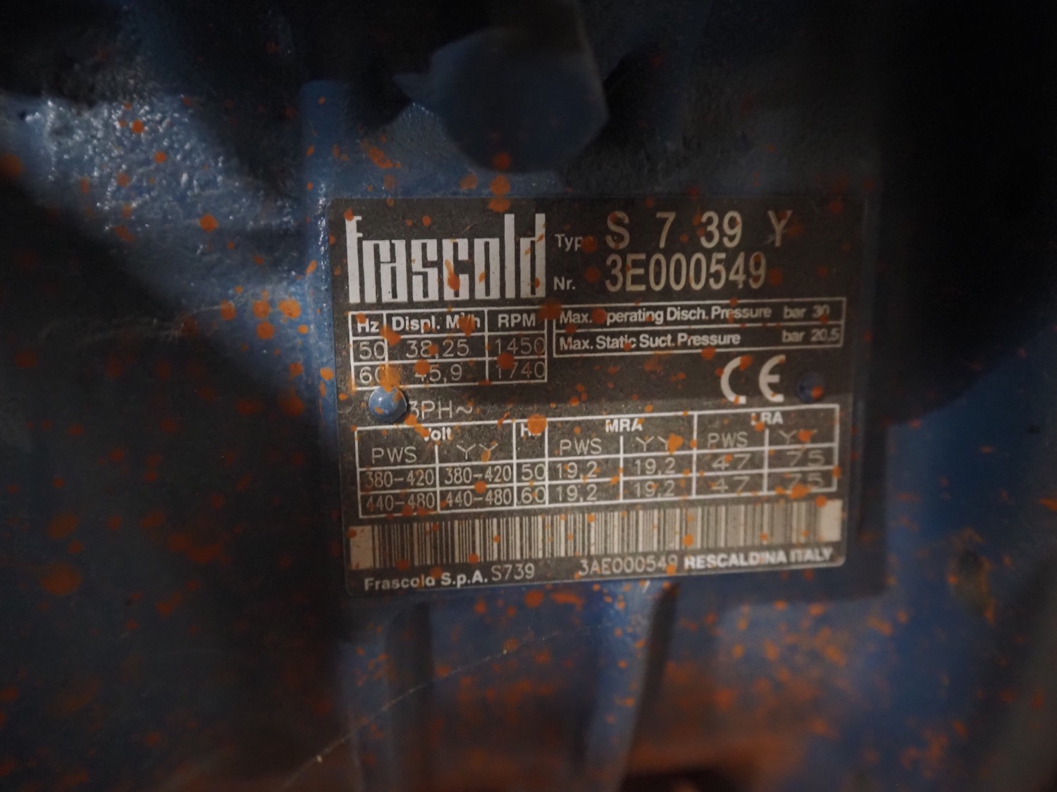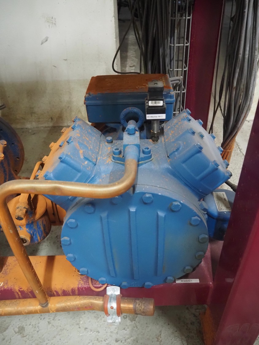 Teko compressor rack with 7 Frascold cooling compressors, type: (5x) S 7 51 Y, capacity: 50.43/61.51 m³ per hour, (2x) S 7 39 Y, capacity: 38.25/45.9 m³ per hour, dimensions: 2180 mm x 820 mm x 1720 mm.
