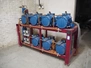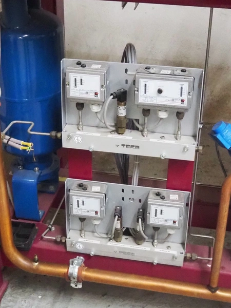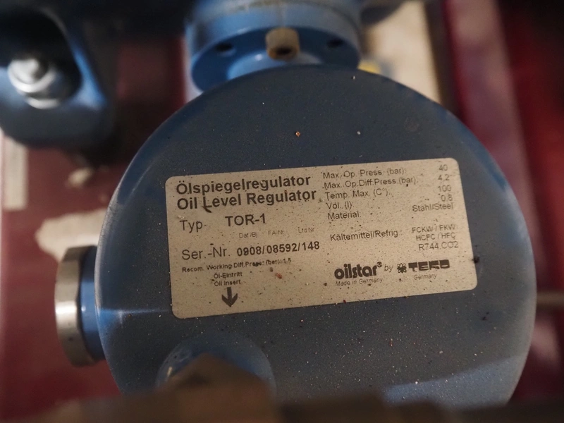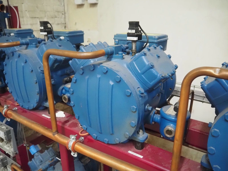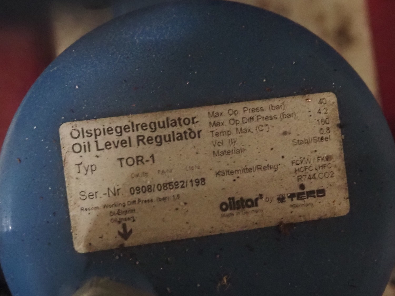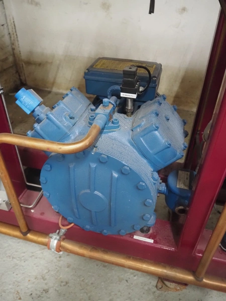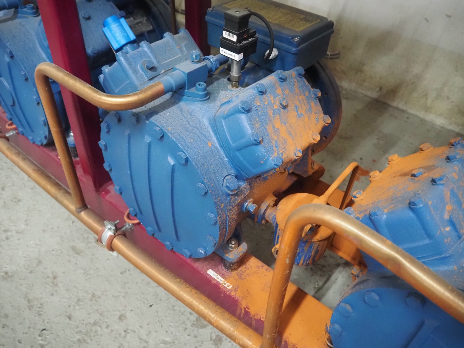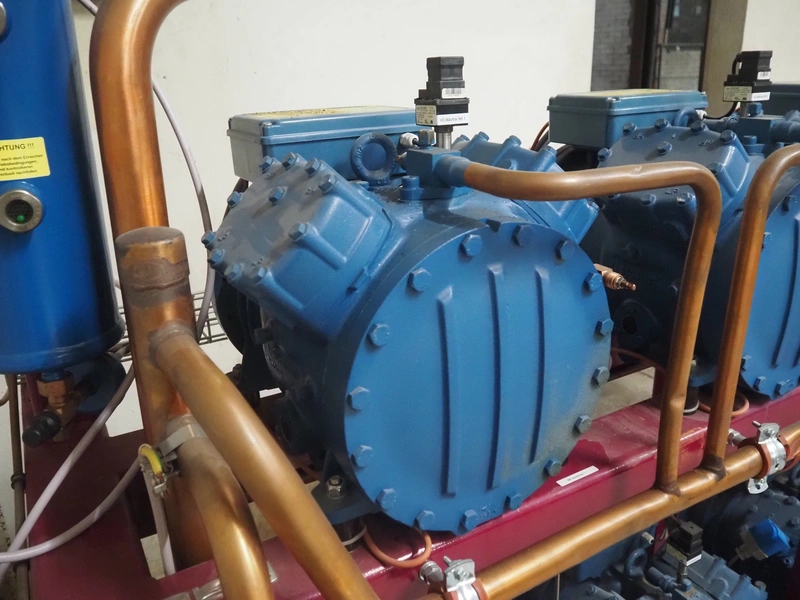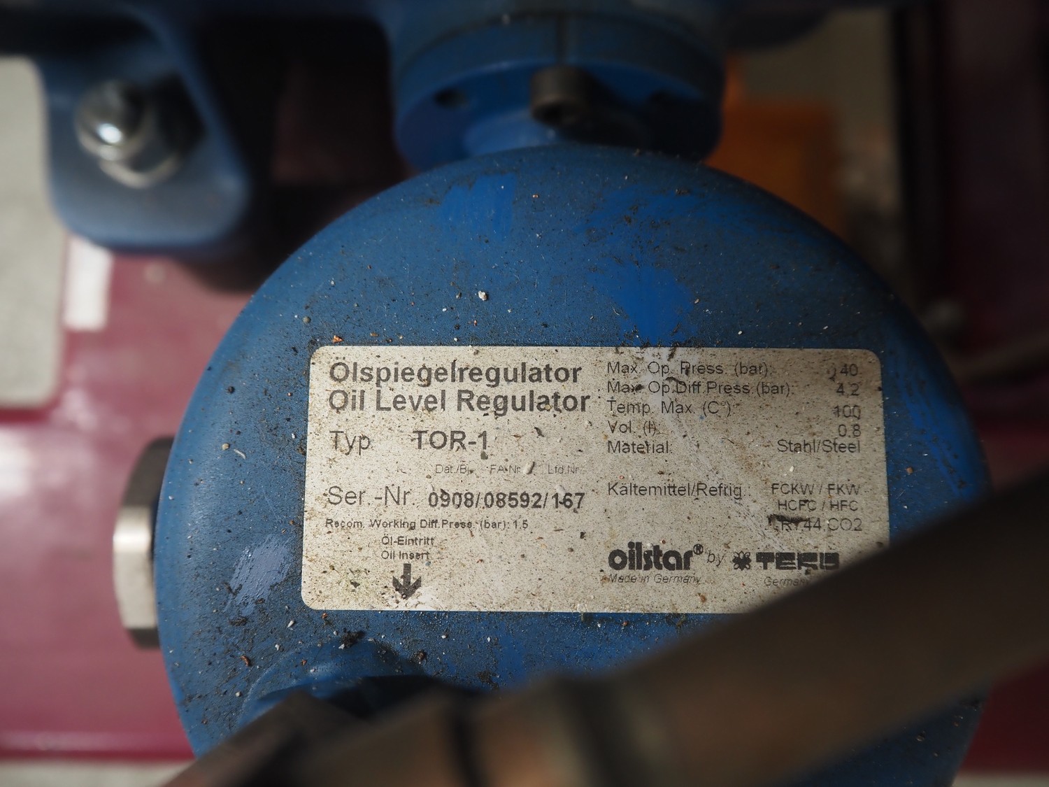 Teko compressor rack with 7 Frascold cooling compressors, type: (5x) S 7 51 Y, capacity: 50.43/61.51 m³ per hour, (2x) S 7 39 Y, capacity: 38.25/45.9 m³ per hour, dimensions: 2180 mm x 820 mm x 1720 mm.