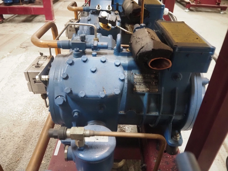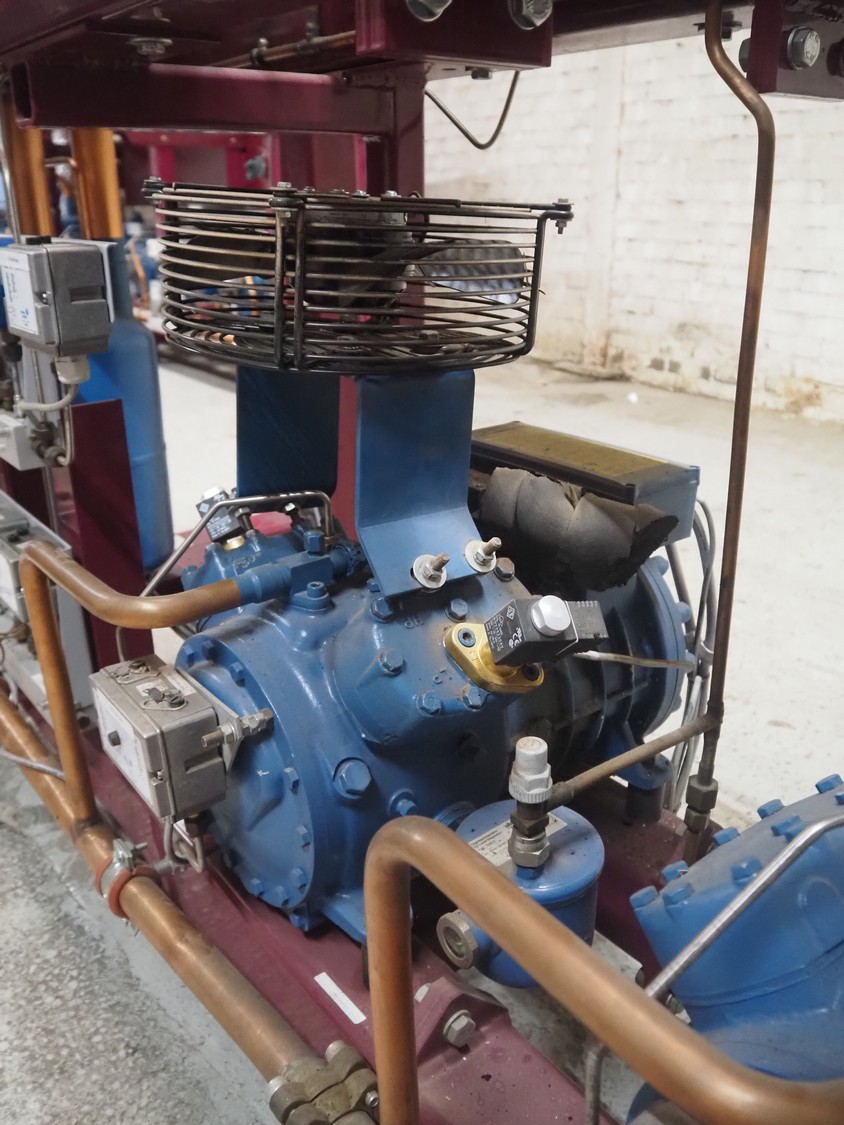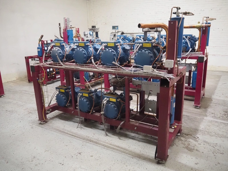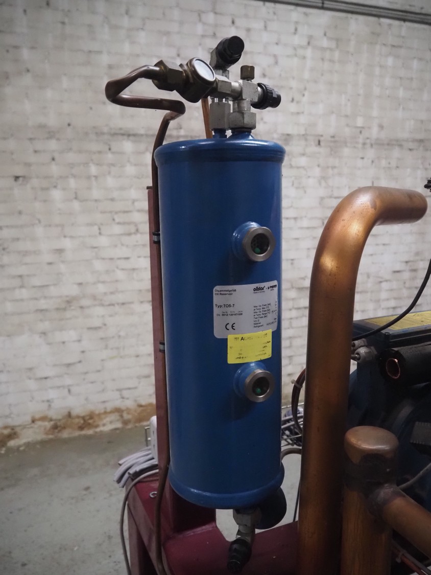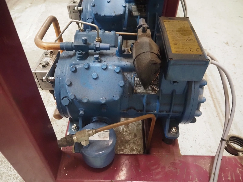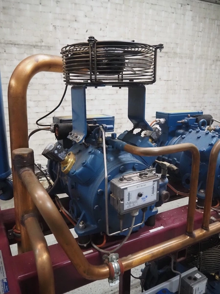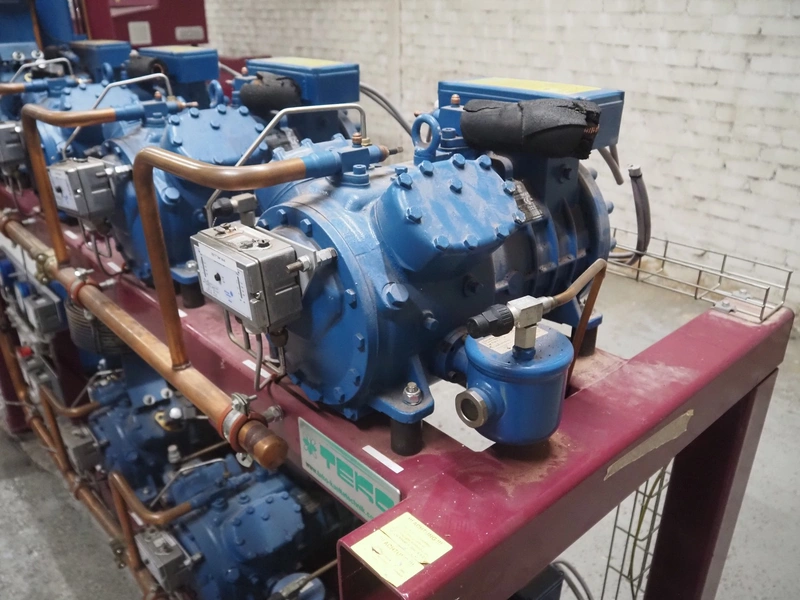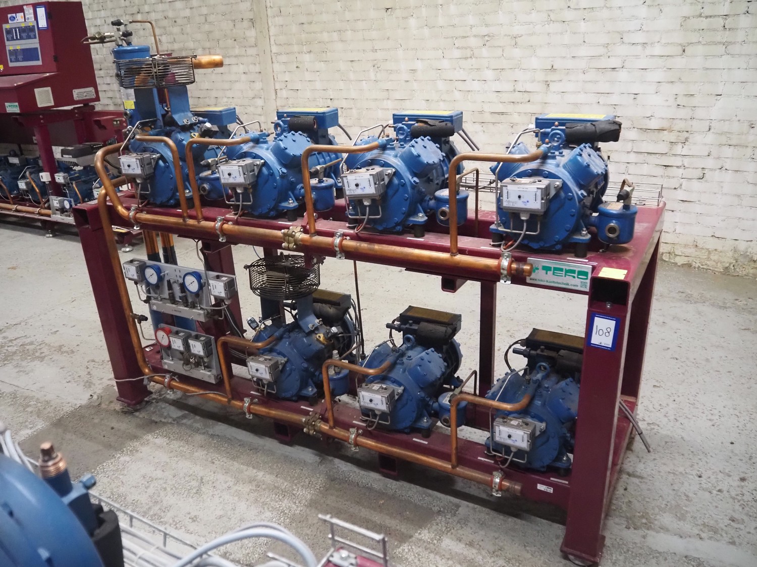 Teko compressor rack with 7 Frascold cooling compressors, type: (3x) Q 5 28.1 Y 1000, capacity: 28.02/33.62 m³ per hour, (4x) Q 4 21.1 Y 1000, capacity: 21.18/25.42 m³ per hour, refrigerant: R134A, dimensions: 2180 mm x 820 mm x 1720 mm.