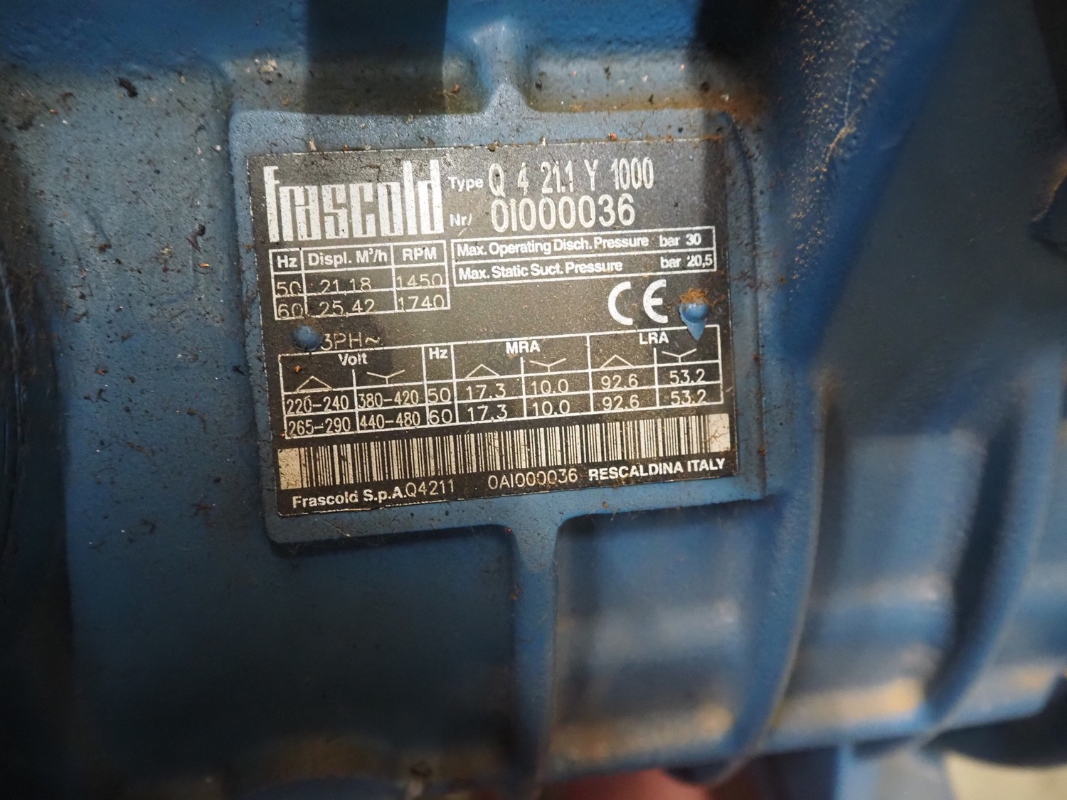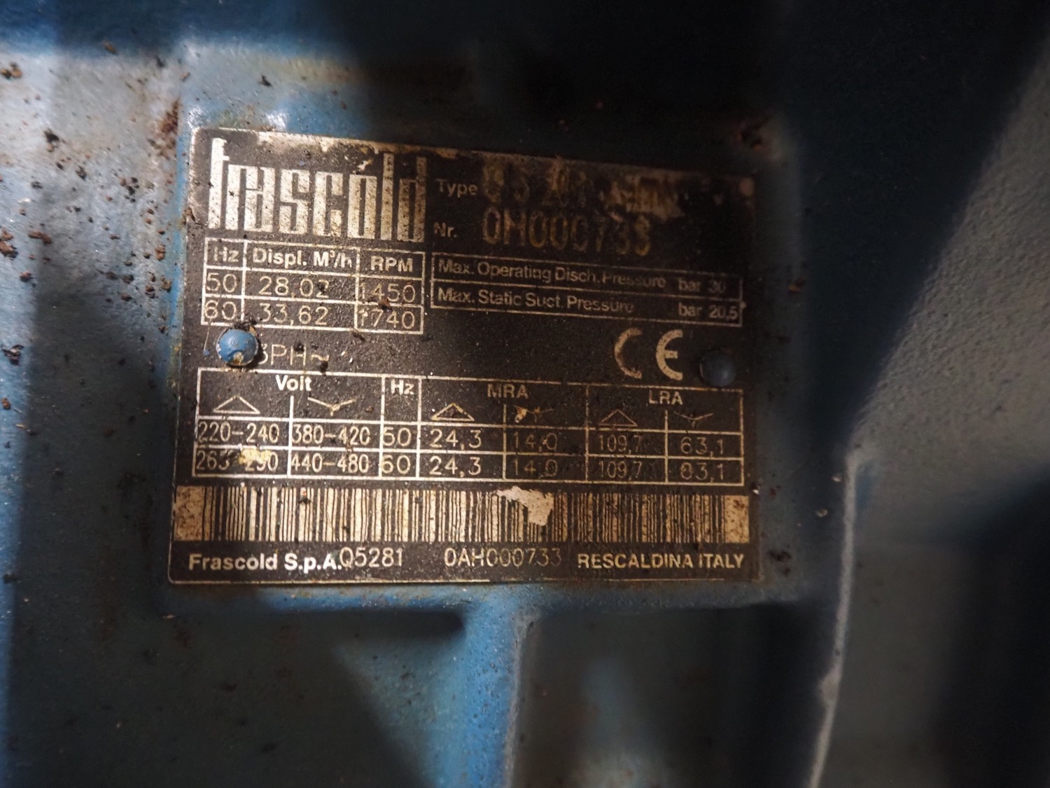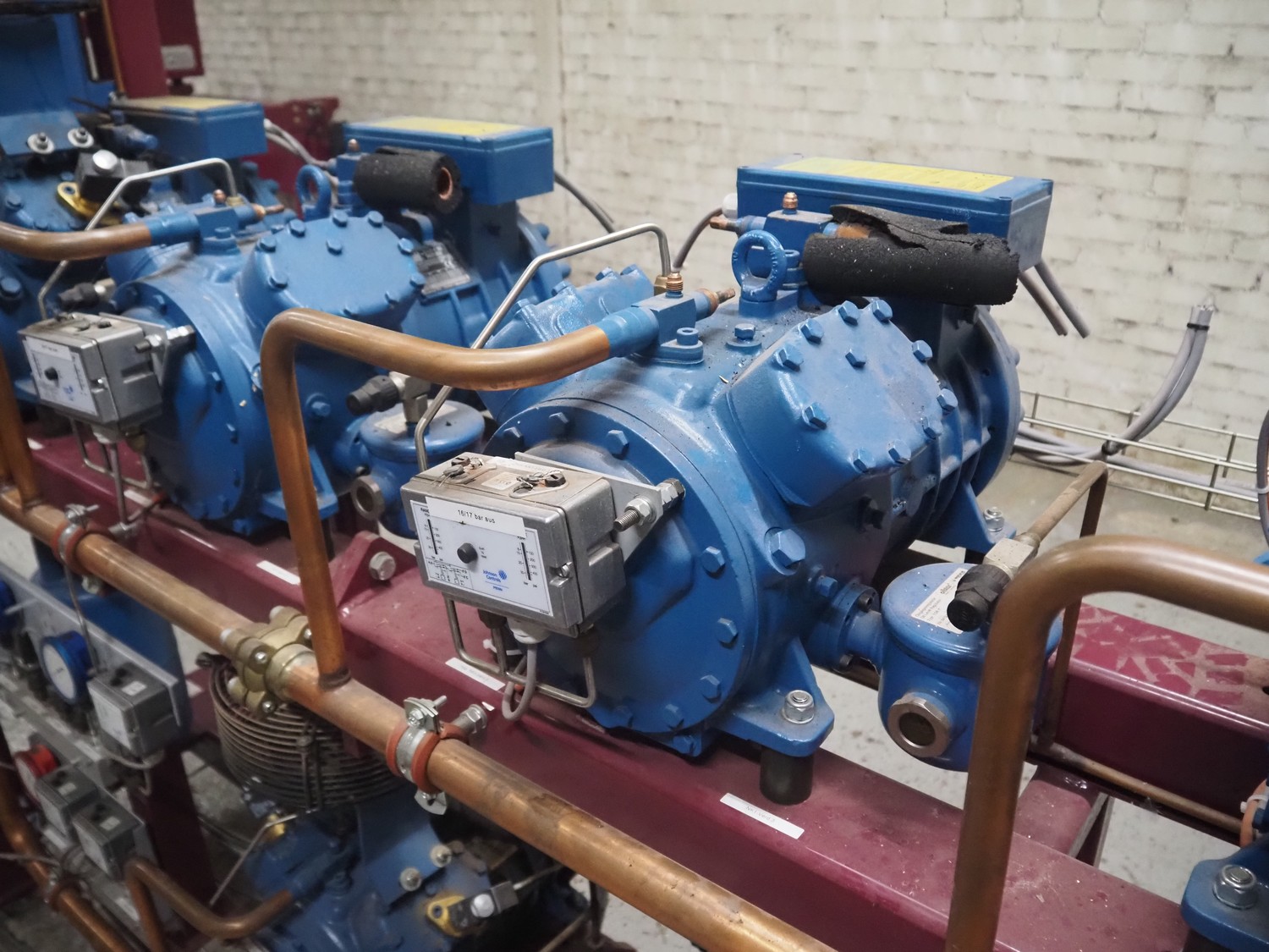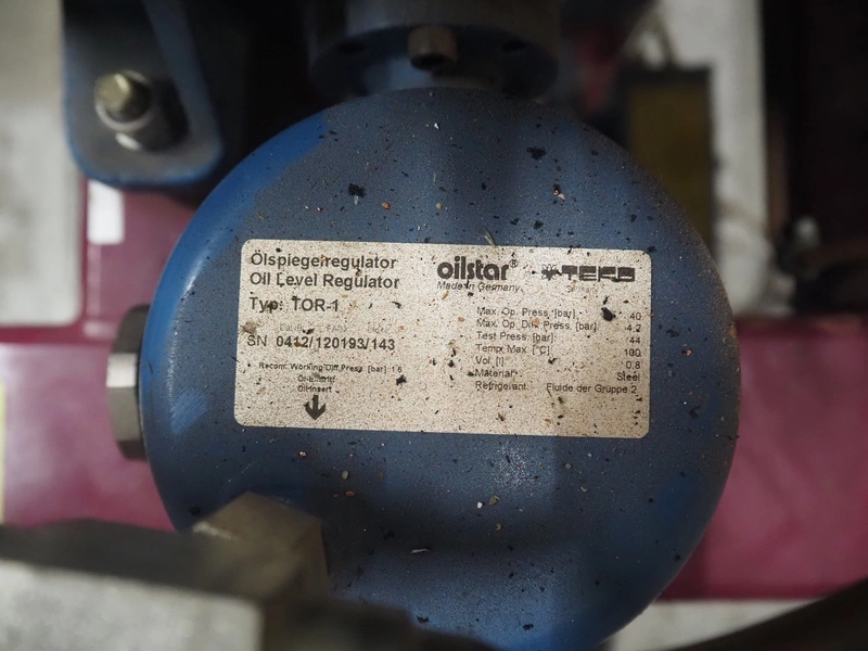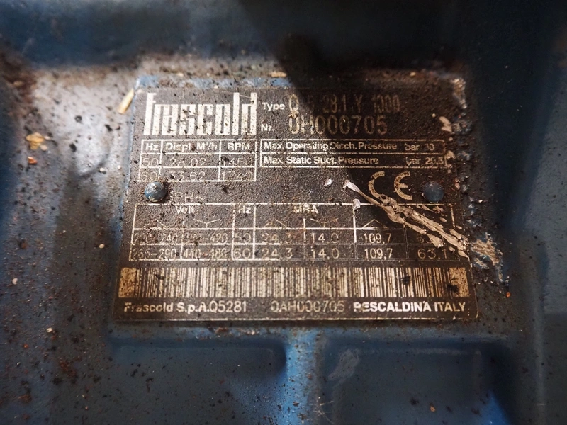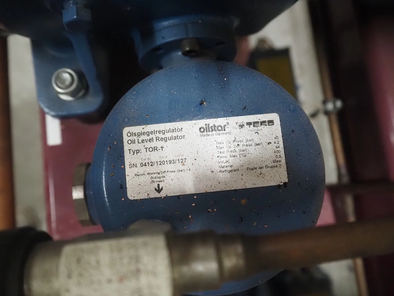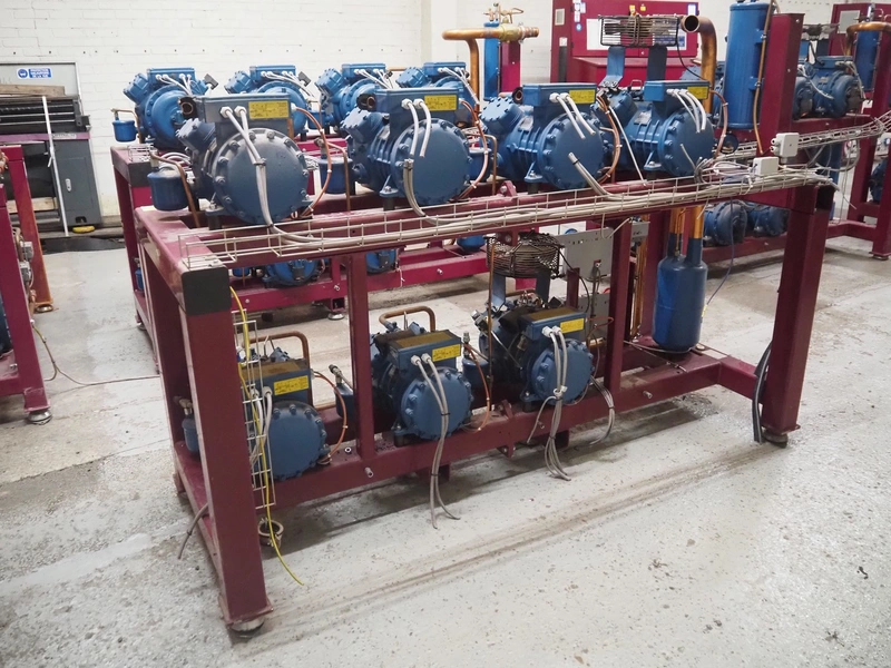 Teko compressor rack with 7 Frascold cooling compressors, type: (3x) Q 5 28.1 Y 1000, capacity: 28.02/33.62 m³ per hour, (4x) Q 4 21.1 Y 1000, capacity: 21.18/25.42 m³ per hour, refrigerant: R134A, dimensions: 2180 mm x 820 mm x 1720 mm.