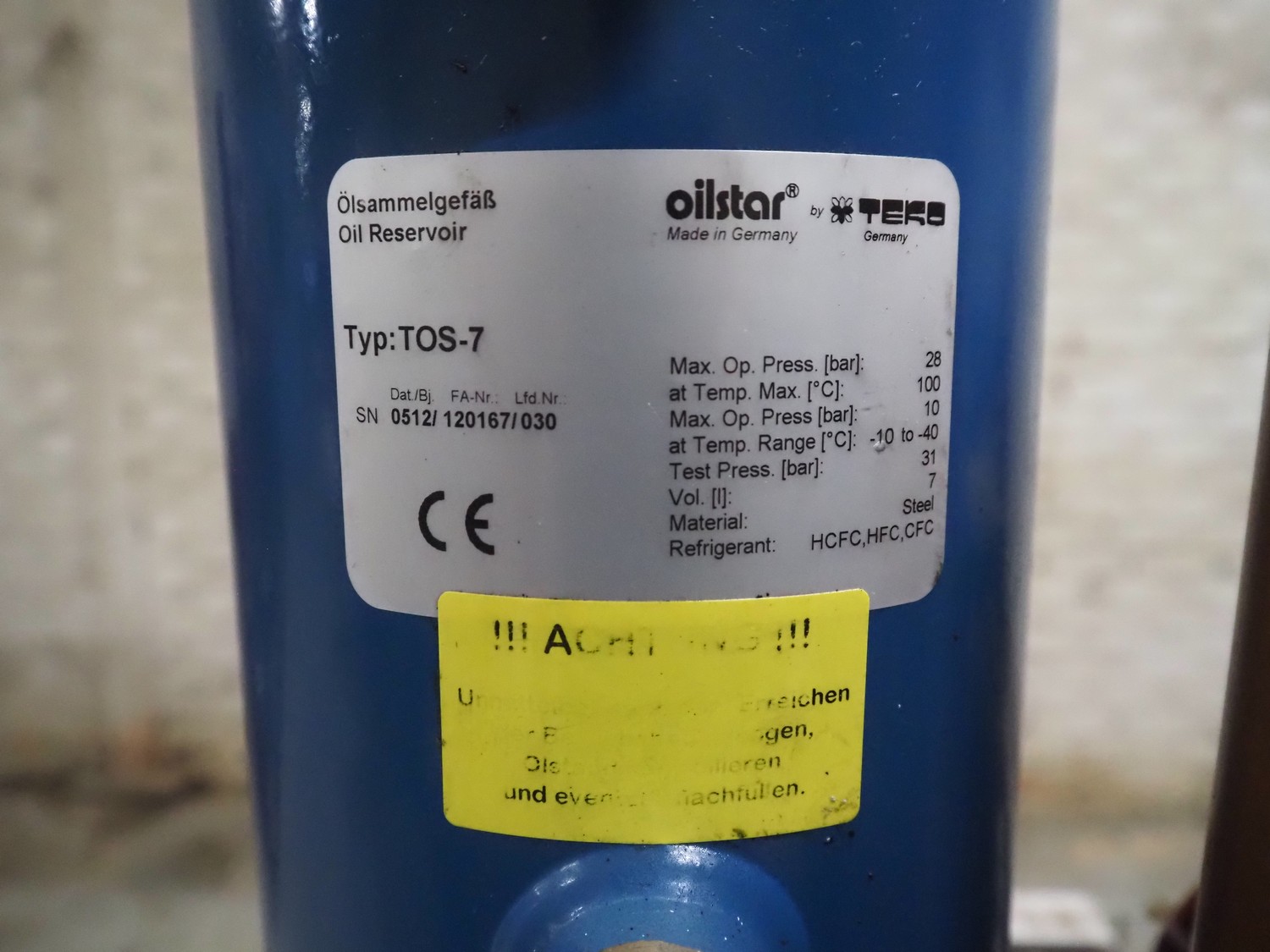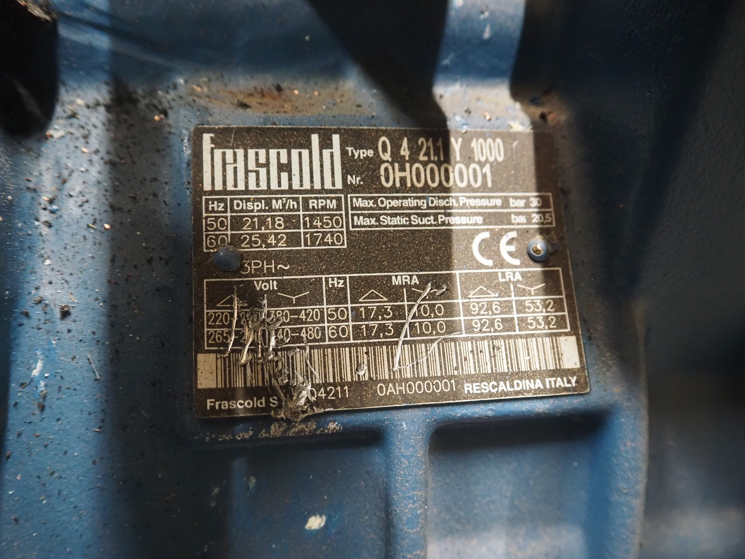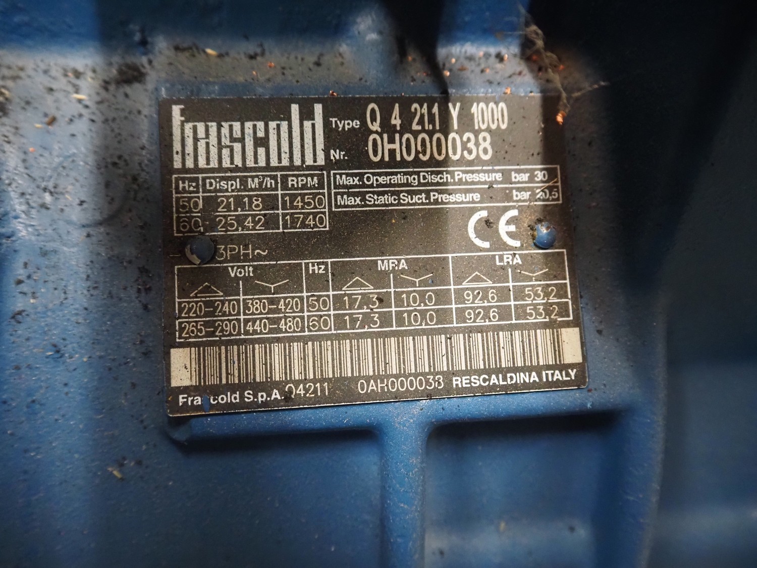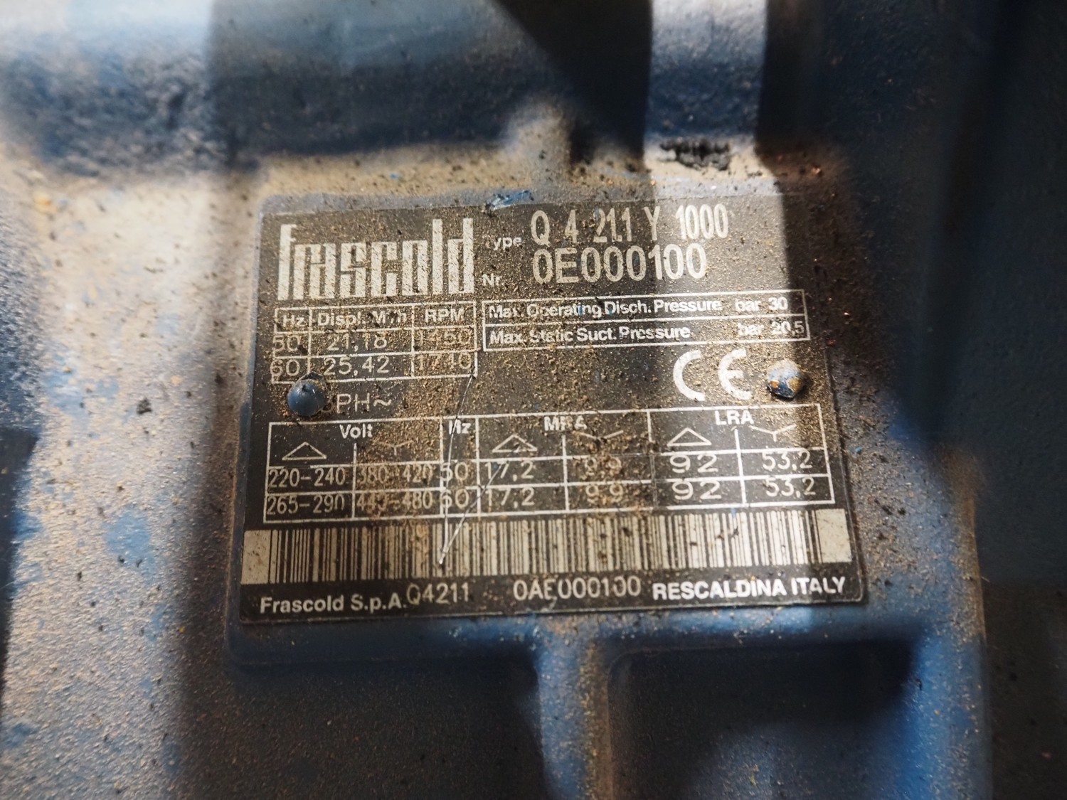 Teko compressor rack with 7 Frascold cooling compressors, type: (3x) Q 5 28.1 Y 1000, capacity: 28.02/33.62 m³ per hour, (4x) Q 4 21.1 Y 1000, capacity: 21.18/25.42 m³ per hour, refrigerant: R134A, dimensions: 2180 mm x 820 mm x 1720 mm.