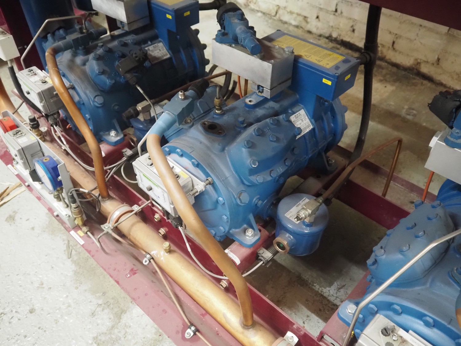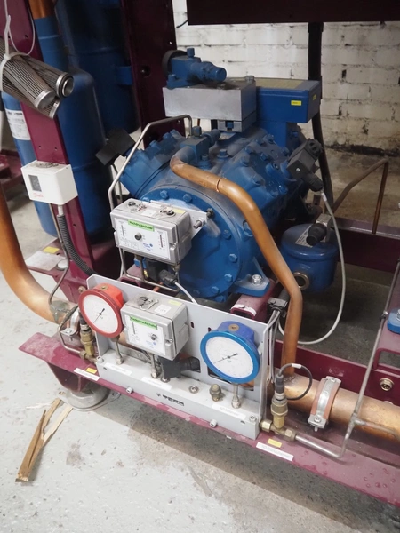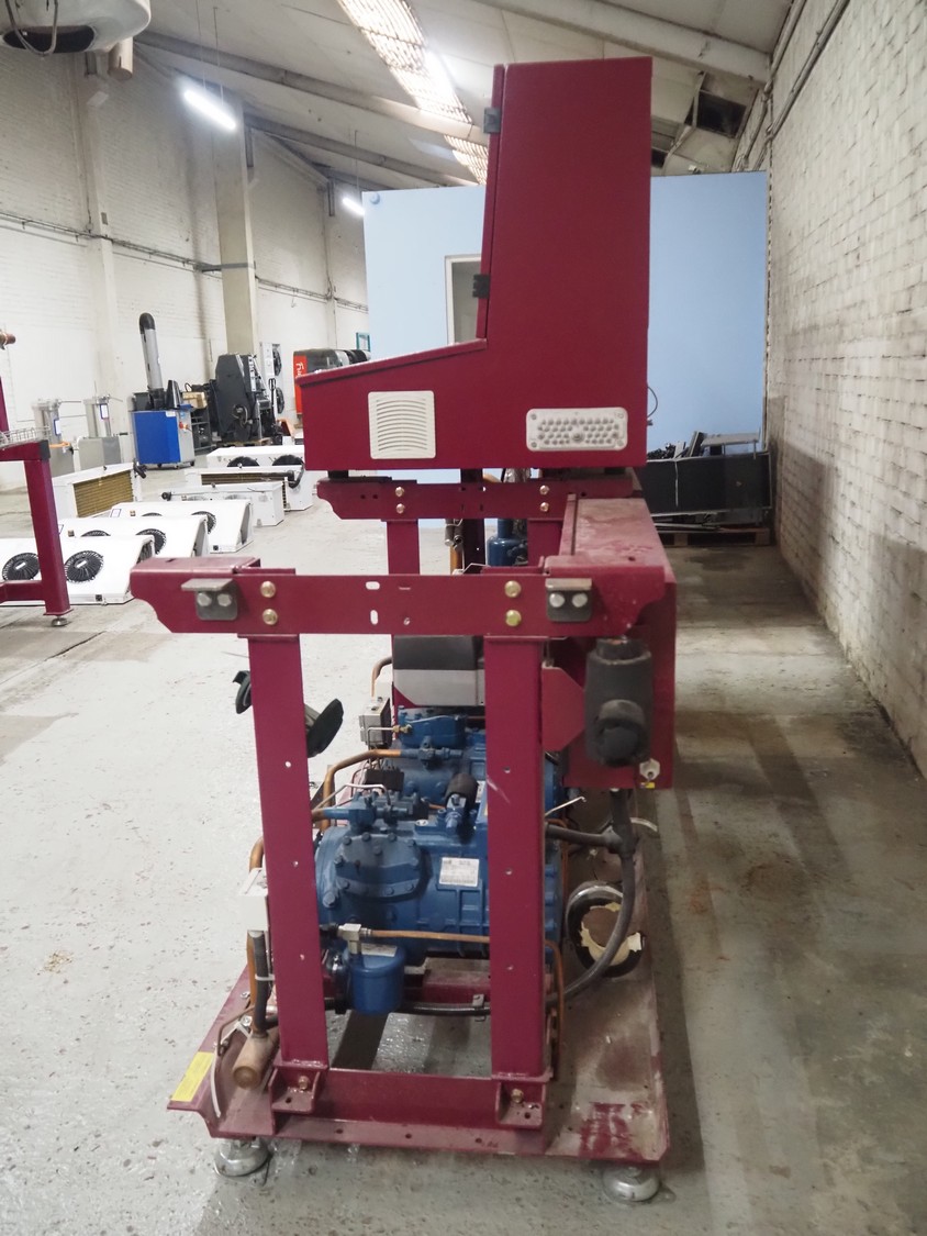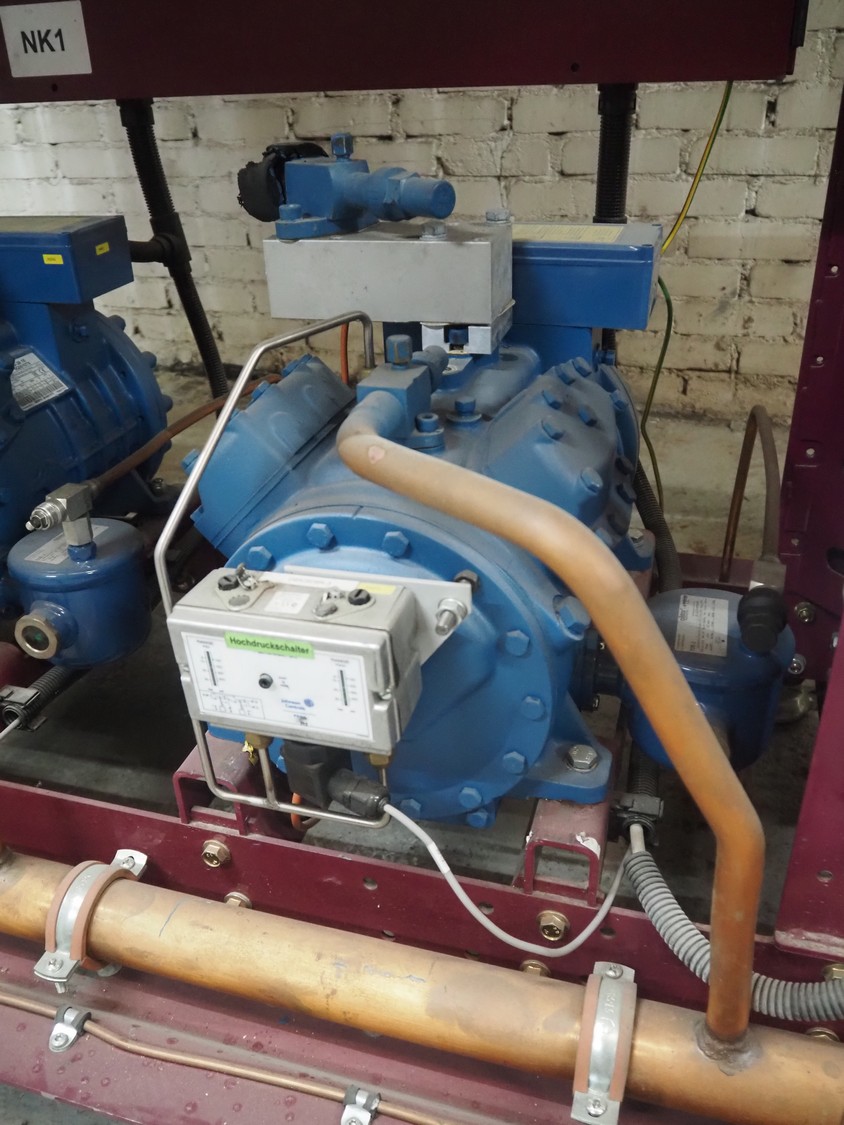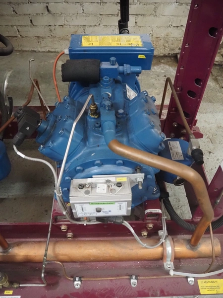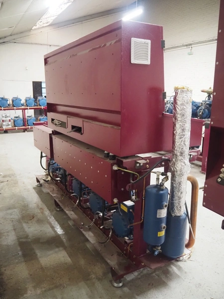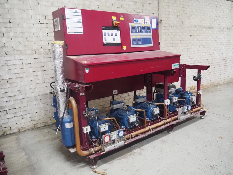 Teko compressor rack with 5 Frascold cooling compressors, type: Q5-33.1E, capacity: 32.66/39.19 m³ per hour, D4-16.1Y, capacity: 16.4/19.68 m³ per hour, (3x) Q5-28.1E, capacity: 28.02/33.62 m³ per hour, refrigerant: R134a, dimensions: 1650 mm x 810 mm x 1650 mm.