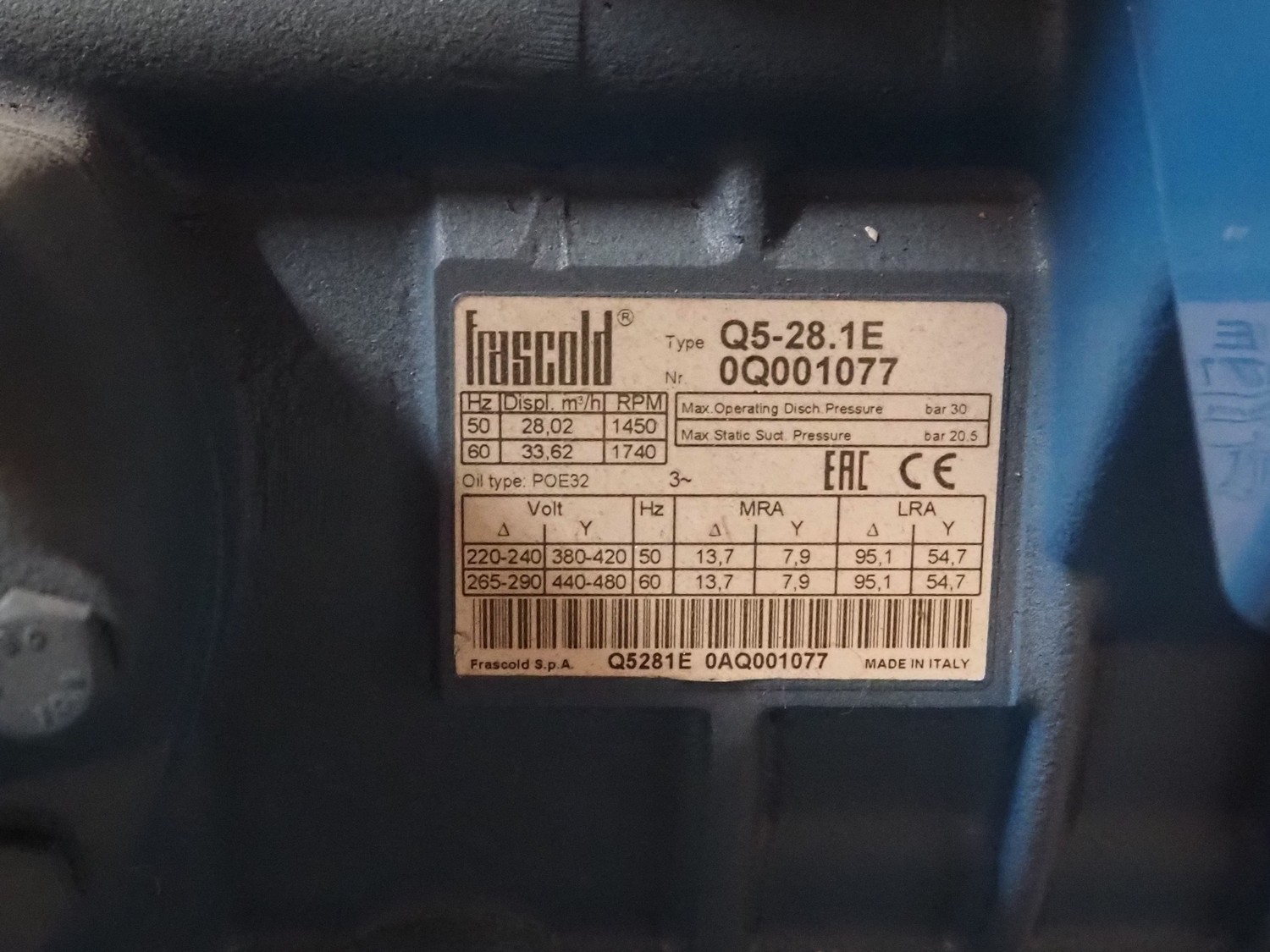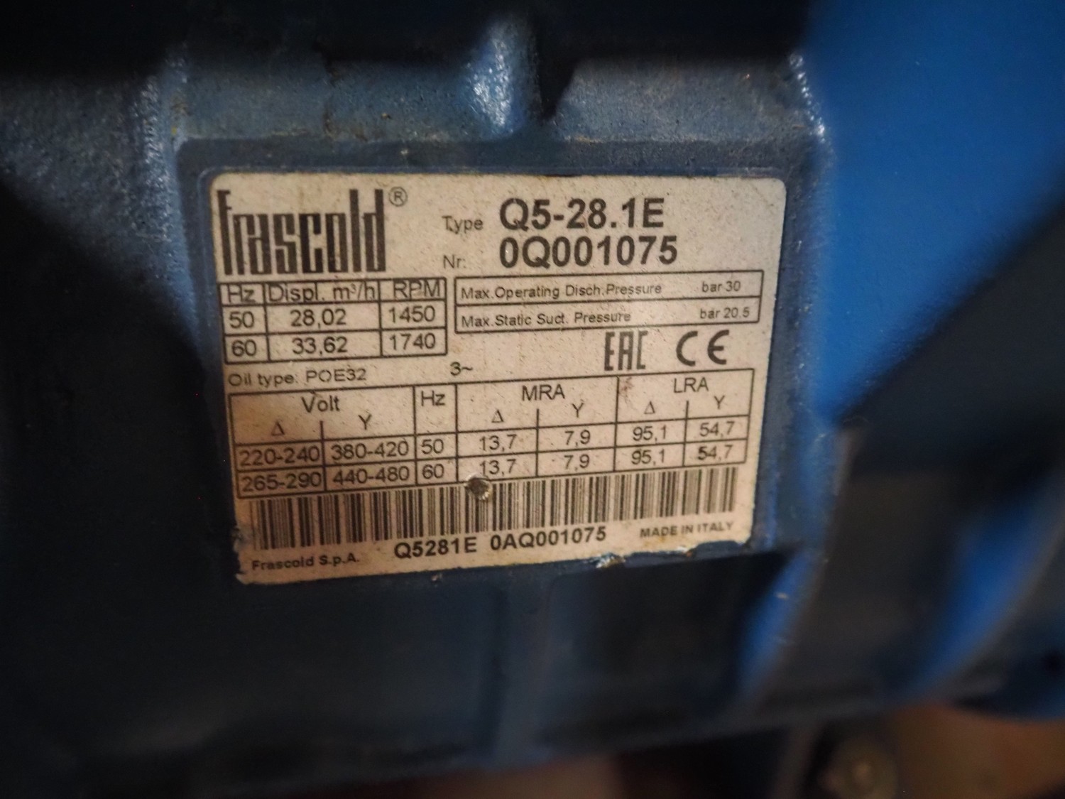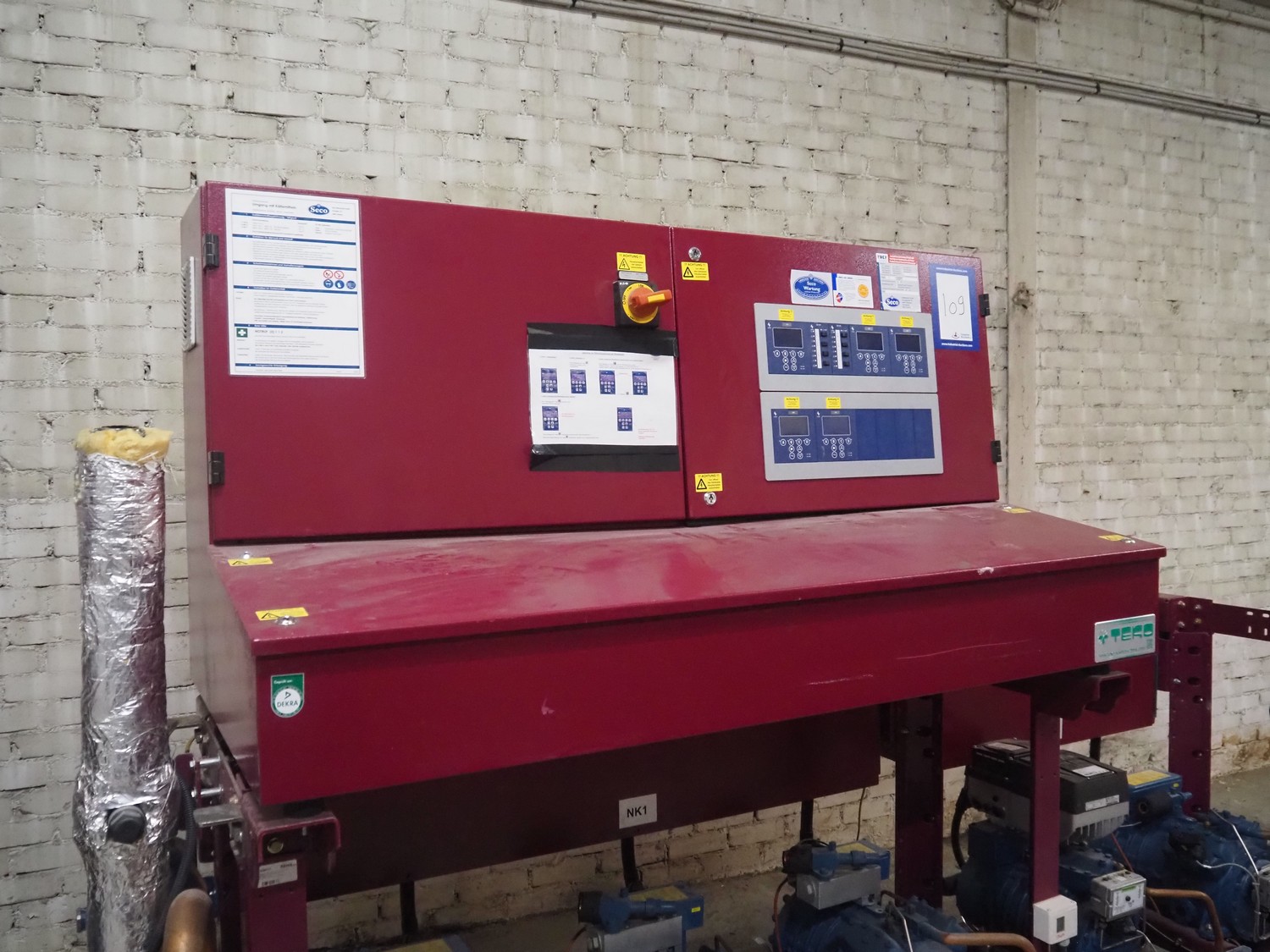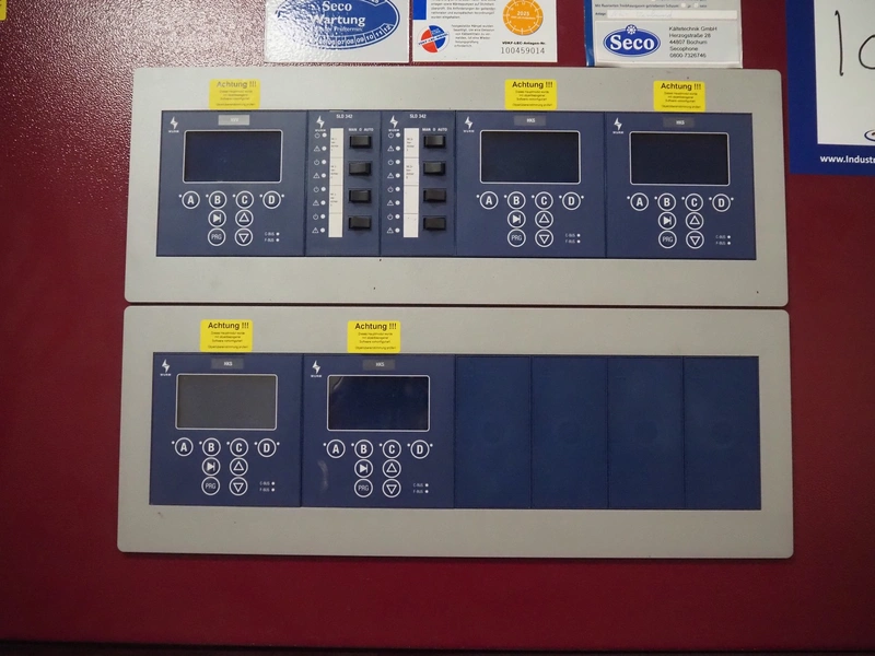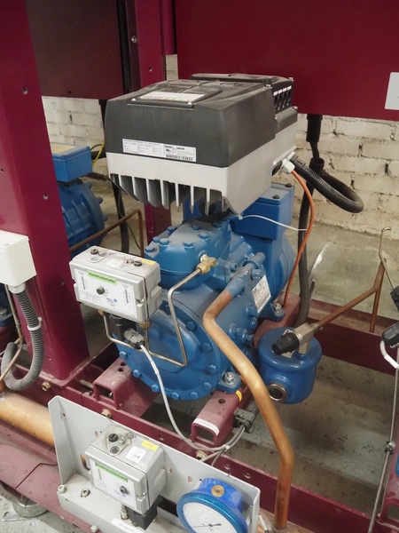 Teko compressor rack with 5 Frascold cooling compressors, type: Q5-33.1E, capacity: 32.66/39.19 m³ per hour, D4-16.1Y, capacity: 16.4/19.68 m³ per hour, (3x) Q5-28.1E, capacity: 28.02/33.62 m³ per hour, refrigerant: R134a, dimensions: 1650 mm x 810 mm x 1650 mm.