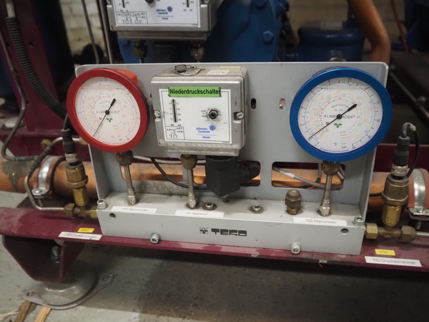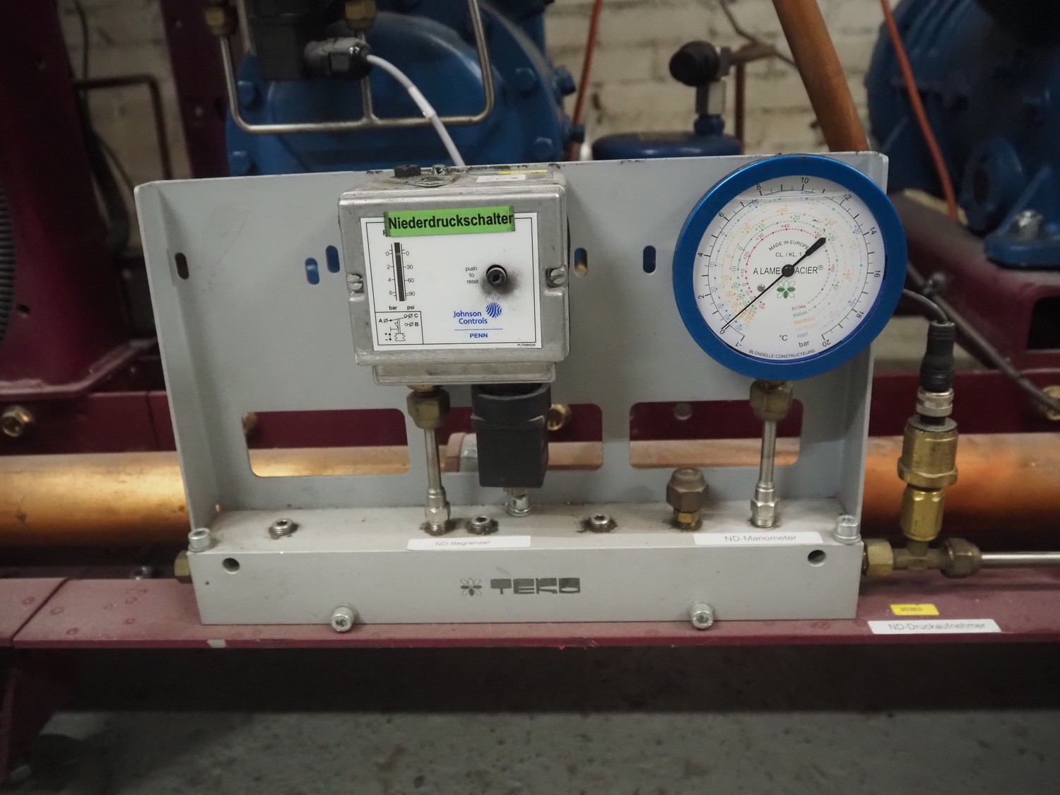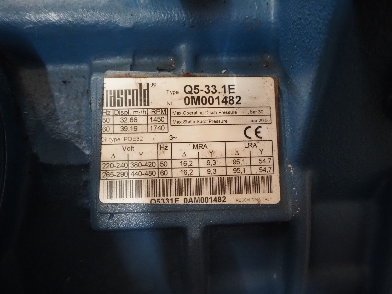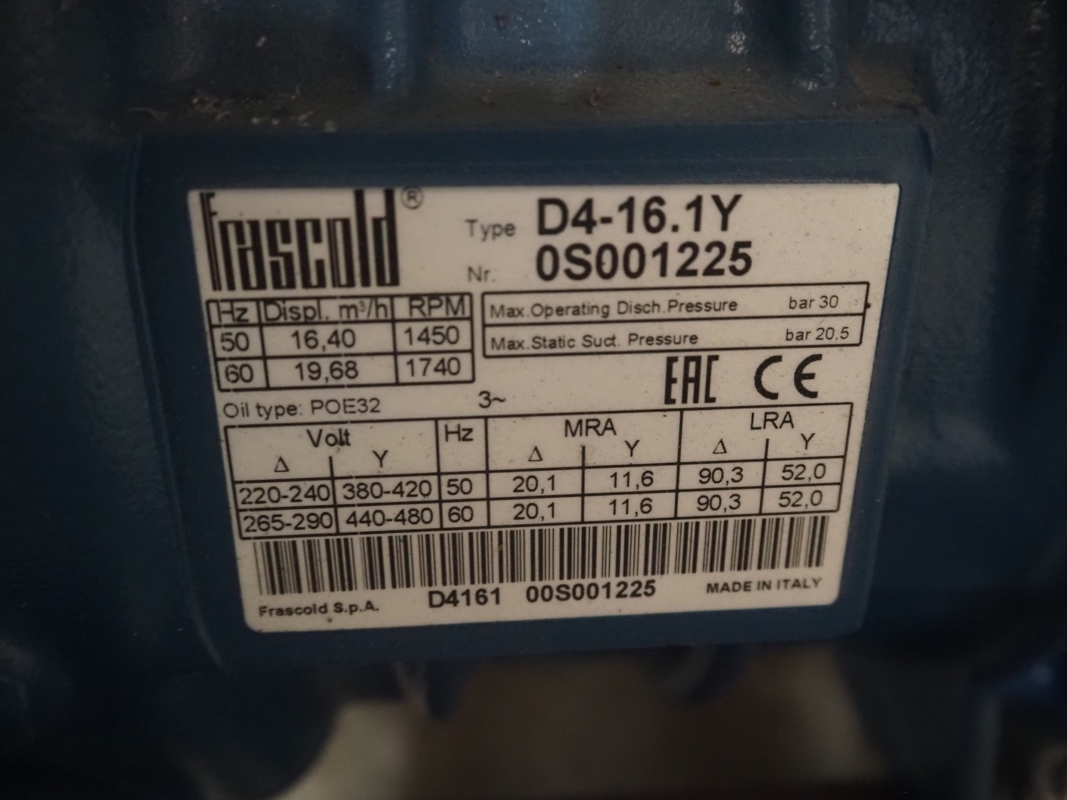 Teko compressor rack with 5 Frascold cooling compressors, type: Q5-33.1E, capacity: 32.66/39.19 m³ per hour, D4-16.1Y, capacity: 16.4/19.68 m³ per hour, (3x) Q5-28.1E, capacity: 28.02/33.62 m³ per hour, refrigerant: R134a, dimensions: 1650 mm x 810 mm x 1650 mm.