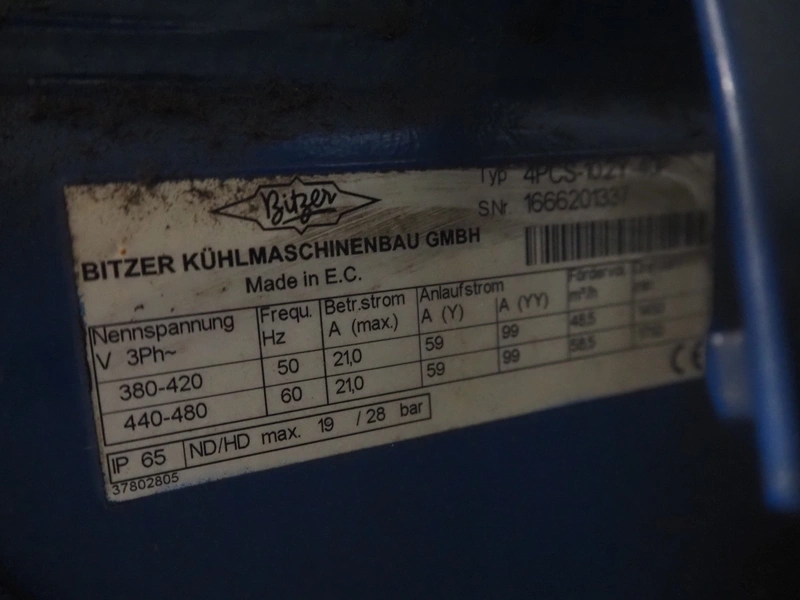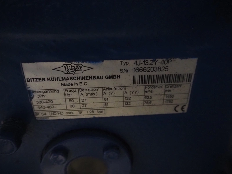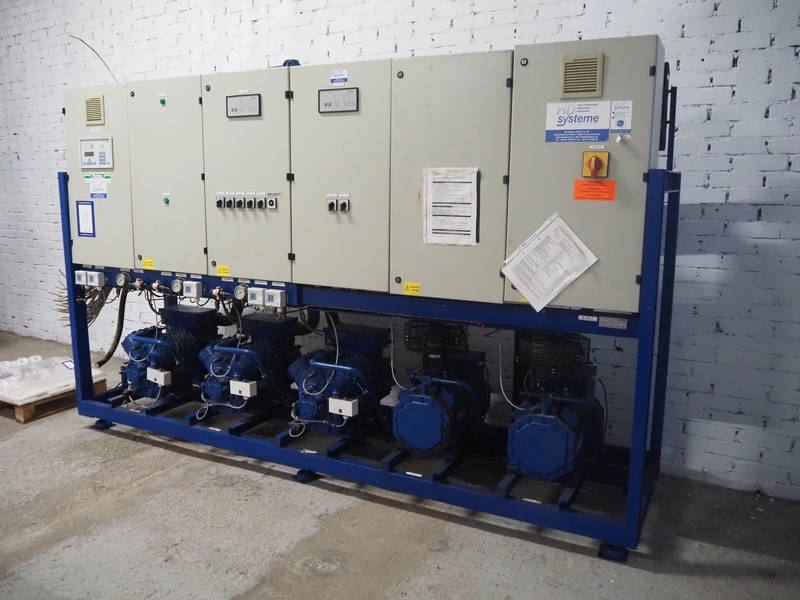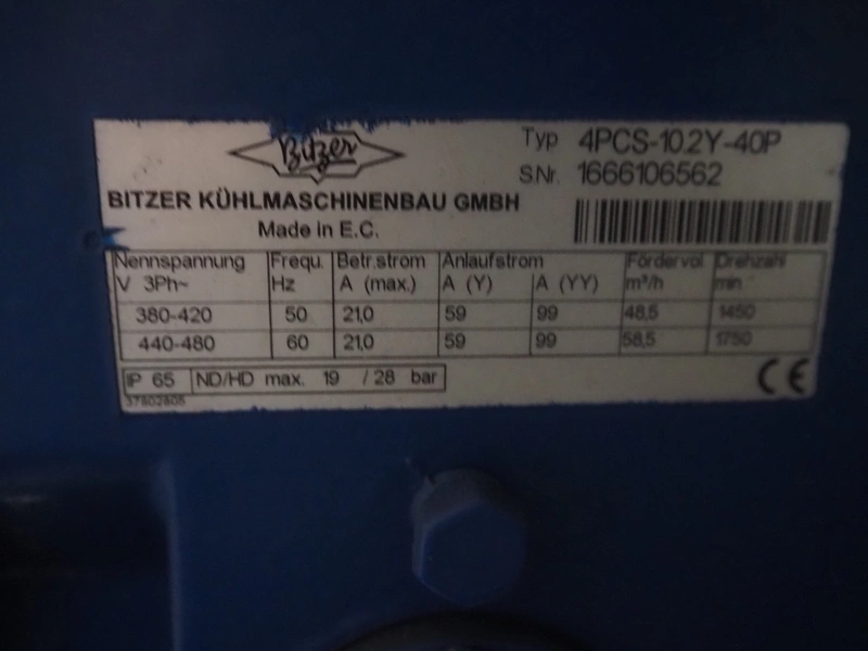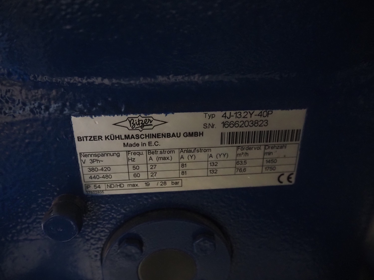 Celsior GmbH compressor rack with 5 Bitzer Kühlmaschinenbau GmbH cooling compressors, type: (3x) 4J-13.2Y-40P, capacity: 63/76,7 m³ per hour and (2x) 4PCS-10.2Y-40P, capacity: 48.5/58,5 m³ per hour, year of construction: 2004, refrigerant: R404A, dimensions: 3100 mm x 820 mm x 2080 mm.