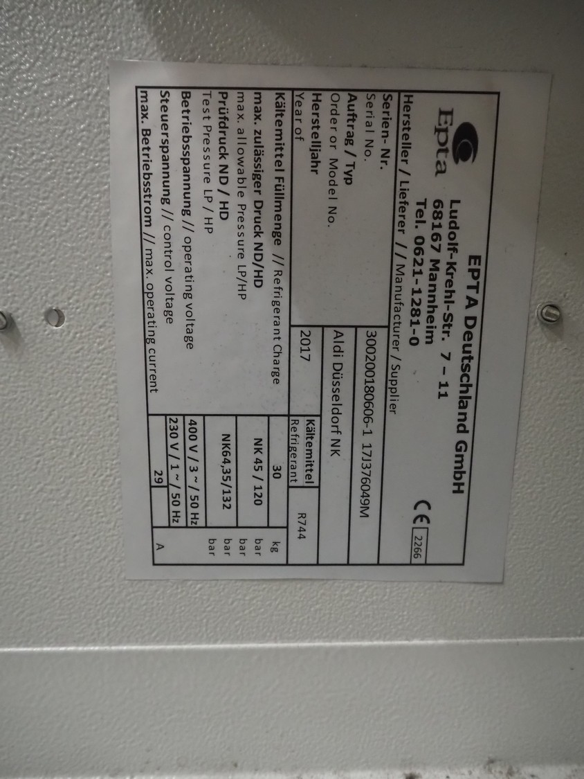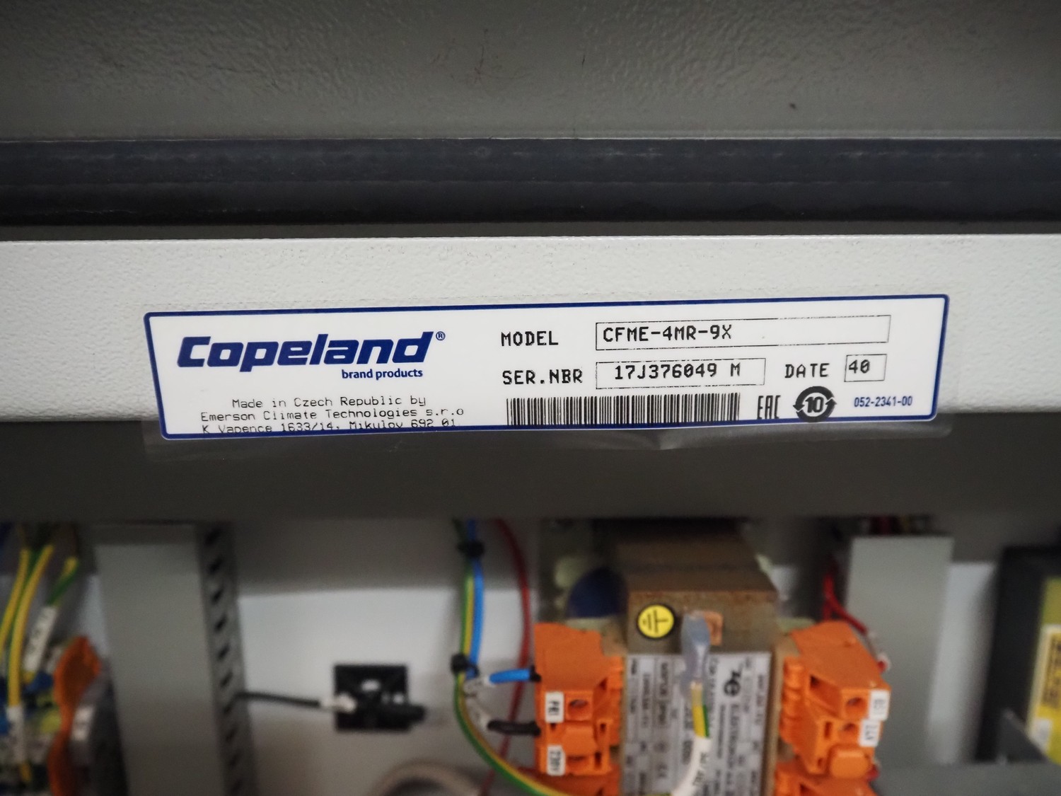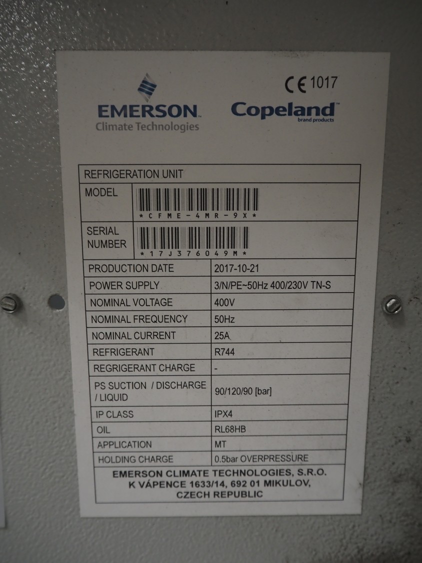 Copeland refrigeration unit, model: CFME-4MR-9X, serial number: 17J376049 M, year of construction: 21-10-2017, 230/400 V, 3 Ph, 50 Hz, 25 A, weight: 450 kg, refrigerant: R744, dimensions: 1600 mm x 900 mm x 1150 mm.