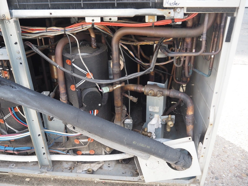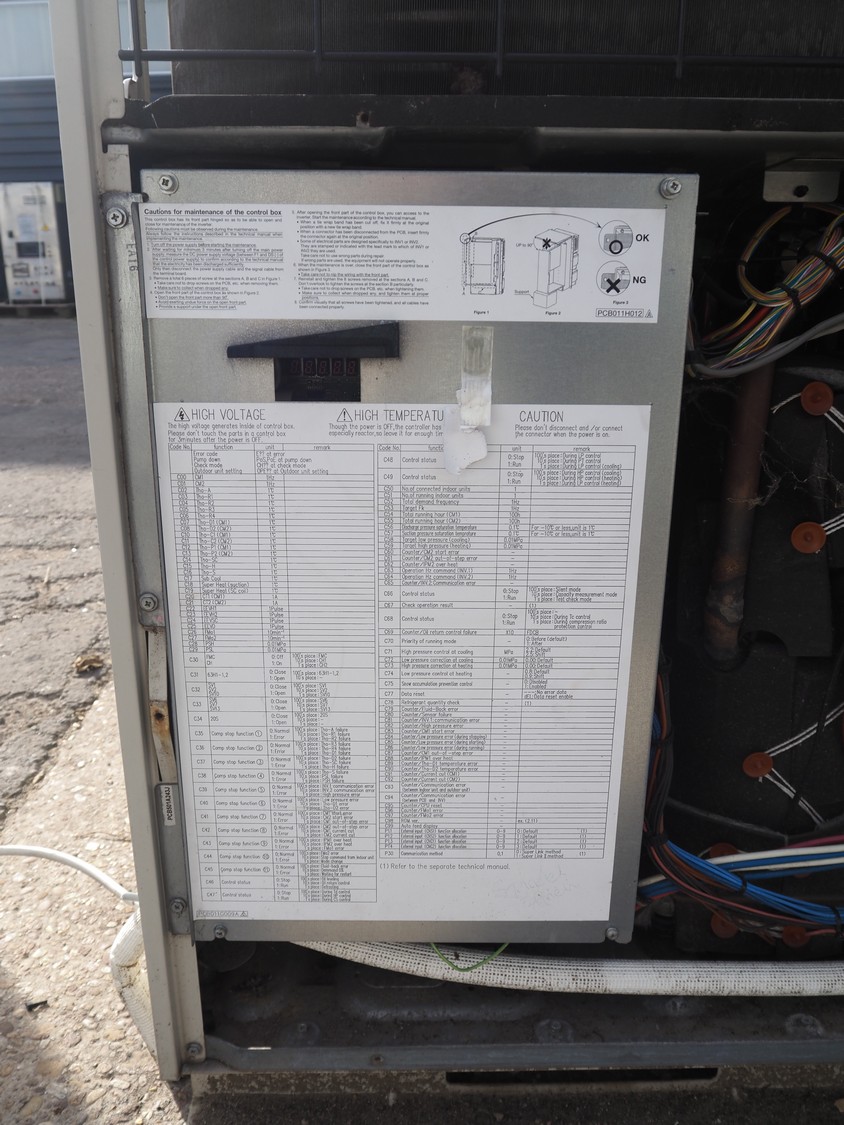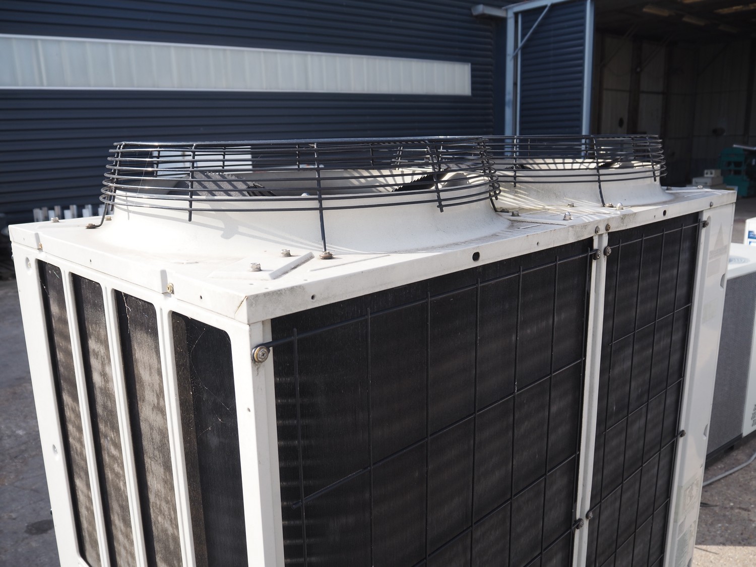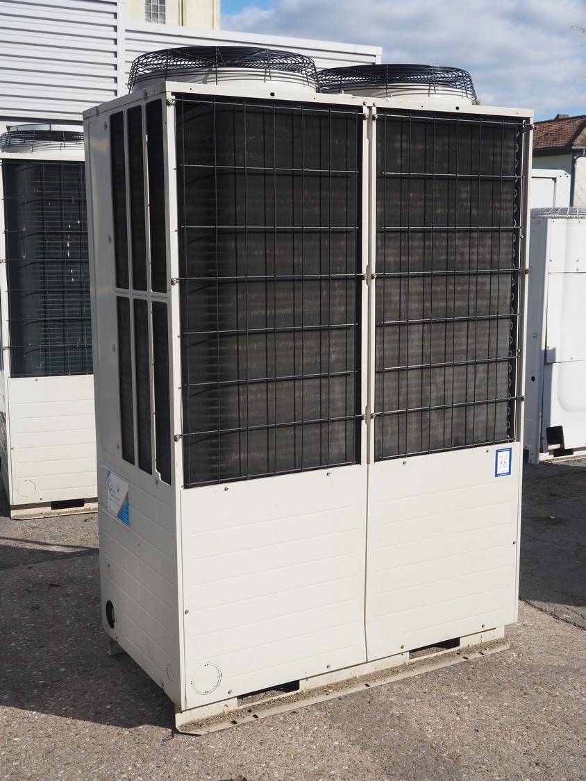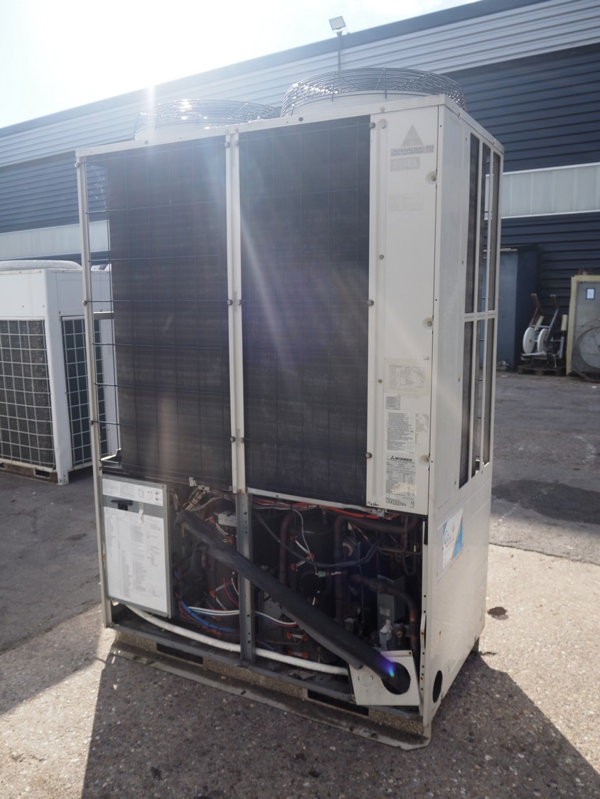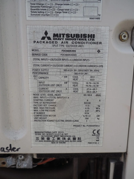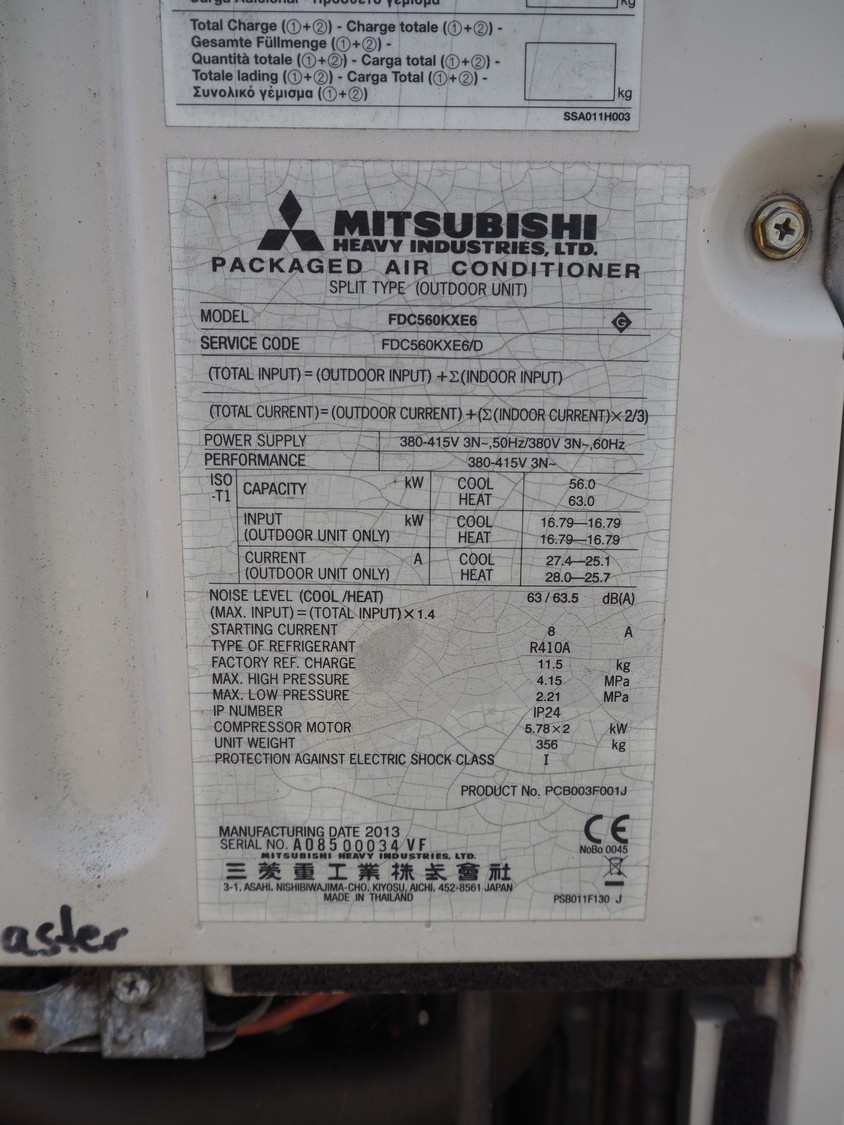 Mitsubishi outdoor air conditioner, model: FDC560KXE6, serial number: A08500034VF, year of construction: 2013, 380/415 V, 3 Ph, 50/60 Hz, weight: 356 Kg, cool capacity: 56.0 kW, heat capacity: 63.0 kW, refrigerant: R410A, 2 fans, dimensions: 1350 mm x 750 mm x 2050 mm.