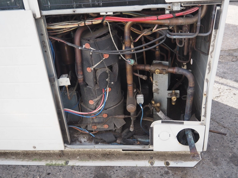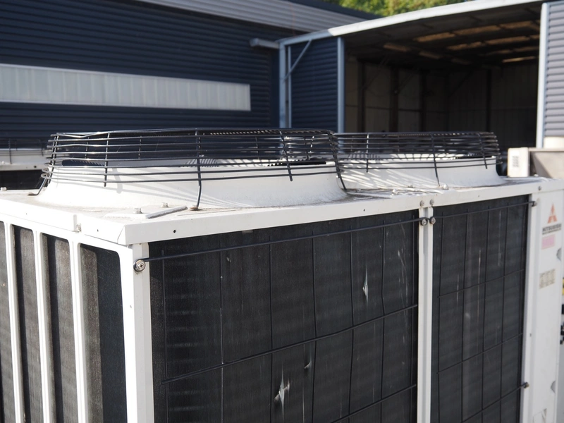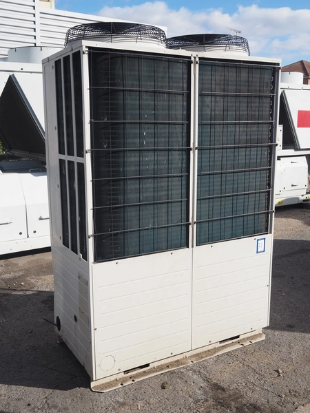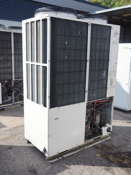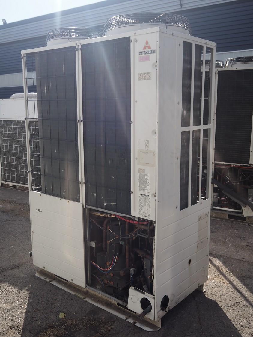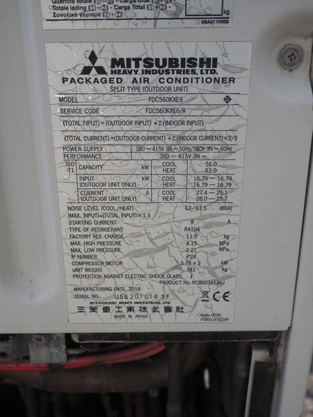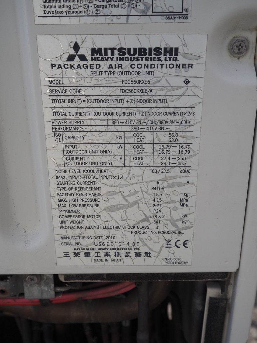 Mitsubishi outdoor air conditioner, model: FDC560KXE6, serial number: U56201014 3F, year of construction: 2010, 380/415 V, 3 Ph, 50 H/60 Hz, weight: 341 Kgcool capacity: 56.0 kW, heat capacity: 63.0 kW, refrigerant: R410A, 2 fans, dimensions: 1350 mm x 750 mm x 2050 mm.
