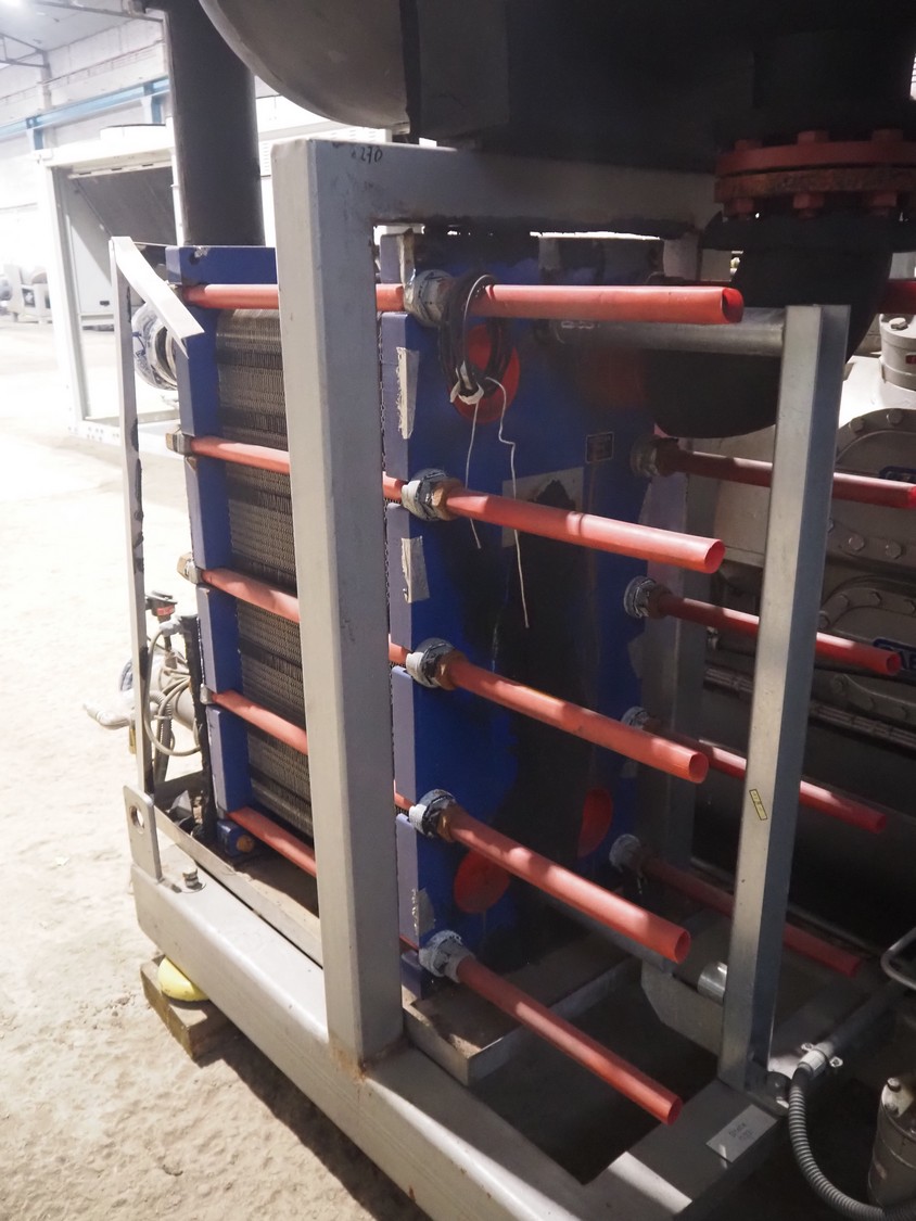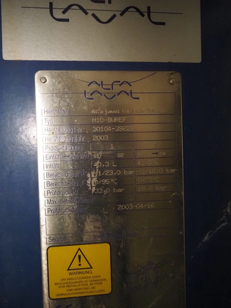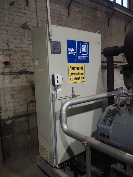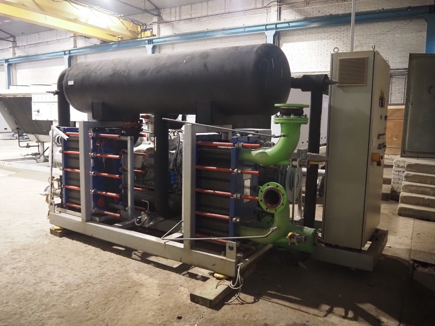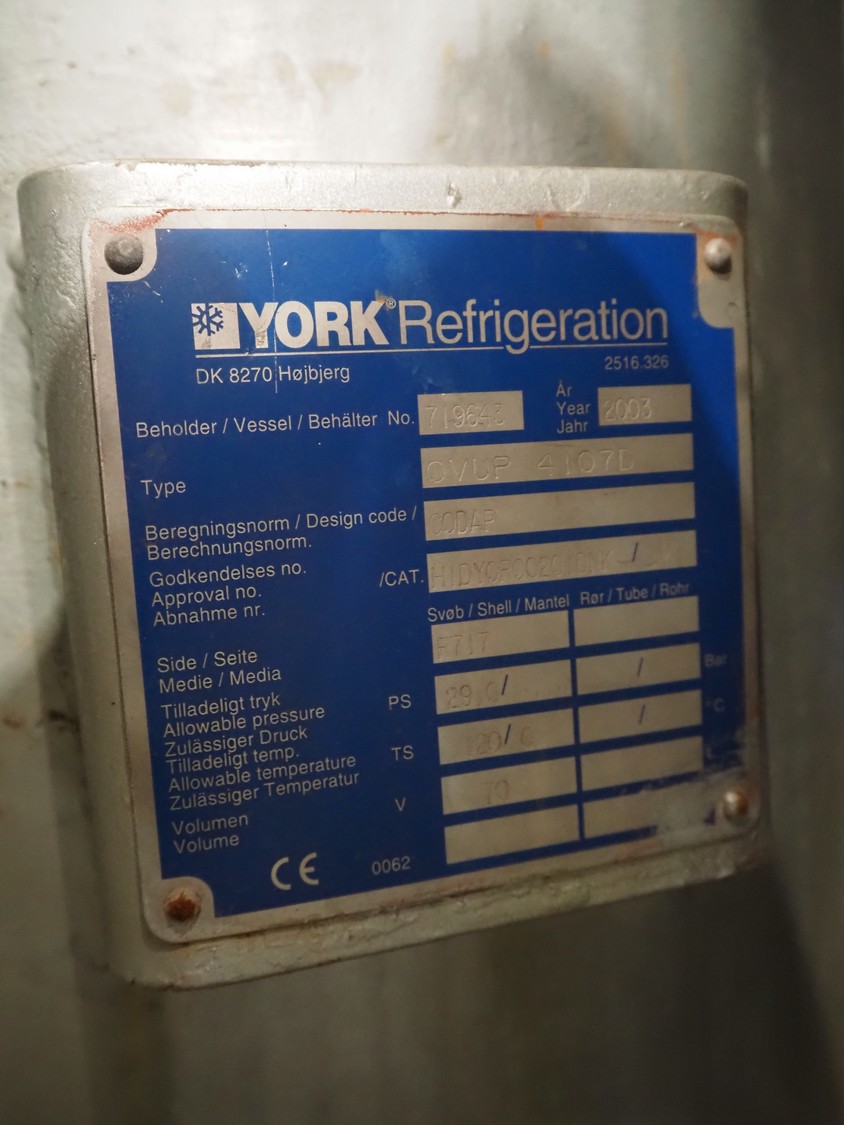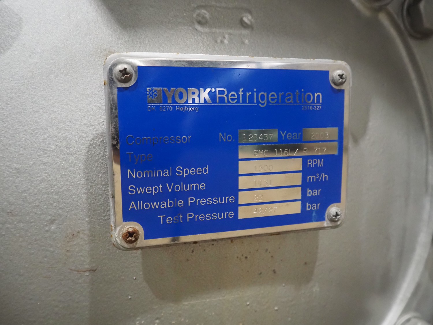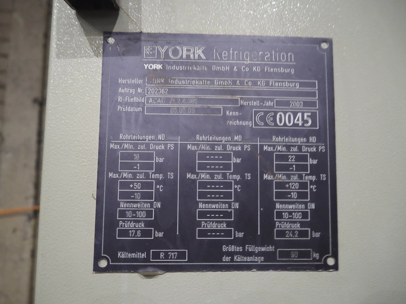 Sabroe reciprocating cooling installation, consisting of Sabroe cooling compressor, type: SMC 116L / R717, number: 123437, year of construction: 2003, 1500 rpm, 1131 m³ per hour, Alfa-Laval plate heat exchanger, type: M10-BWREF, year of construction: 2003, and York refrigerant tank, dimensions: 4400 mm x 2000 mm x 2430 mm. Technical condition unknown.