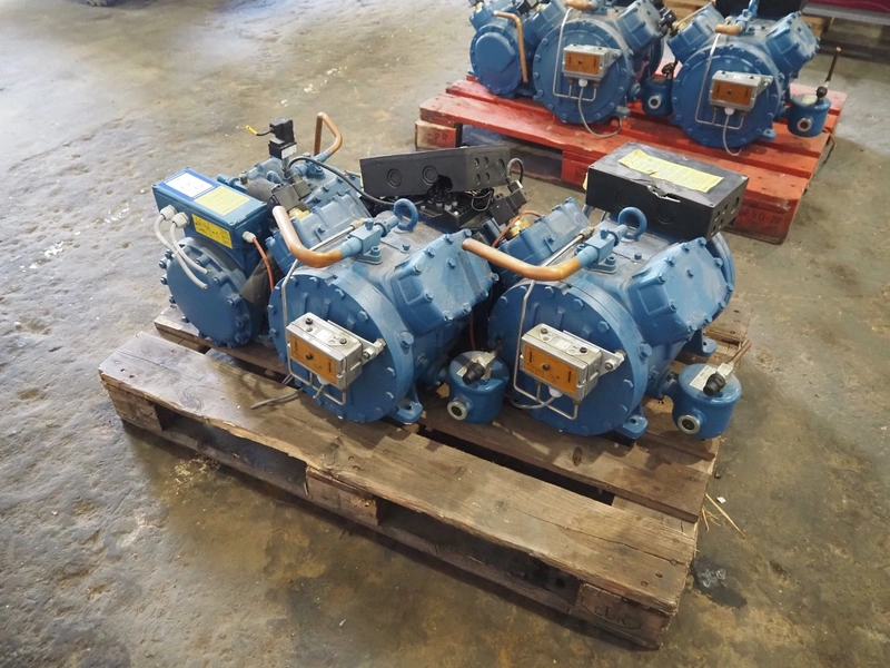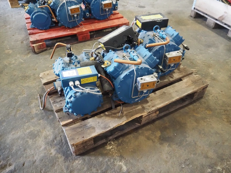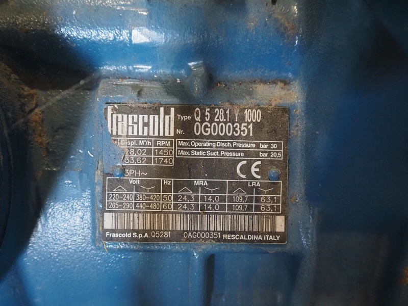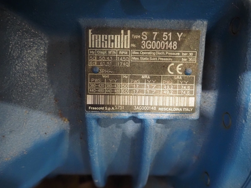 3 Frascold cooling compressors, type: (2x) S 7 51 Y, capacity: 50.43/61.51 m³ per hour and type: (1x) Q 5 28.1 Y 1000, capacity: 28.02/33.62 m³ per hour, dimensions: (2x) 630 mm x 500 mm x 400 mm and (1x) 530 mm x 400 mm x 400 m.