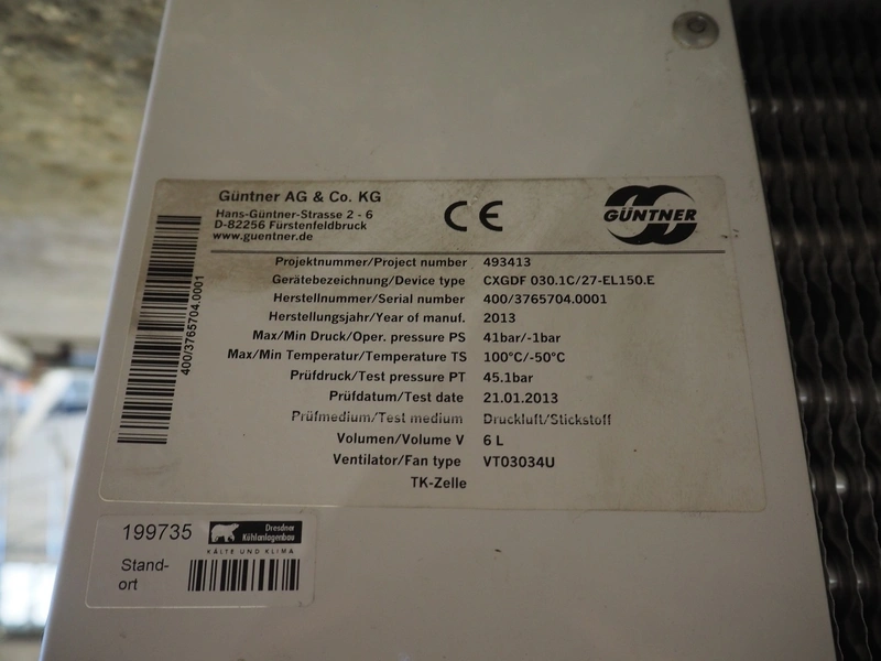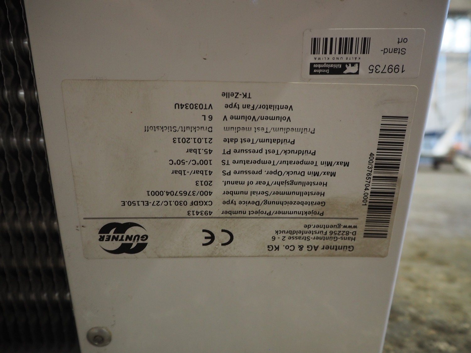 Güntner AG&Co.KG evaporator, type: CXGDF 030.1C/27-EL150.E, serial number: 400/3765704.0001, year of construction: 2013, volume: 6 liter, 2 fans, dimensions: 1650 mm x 600 mm x 400 mm.