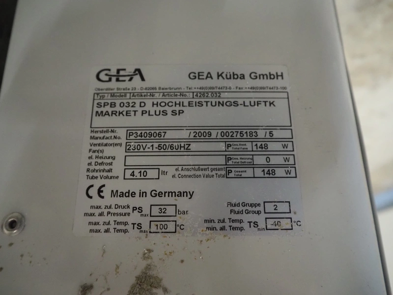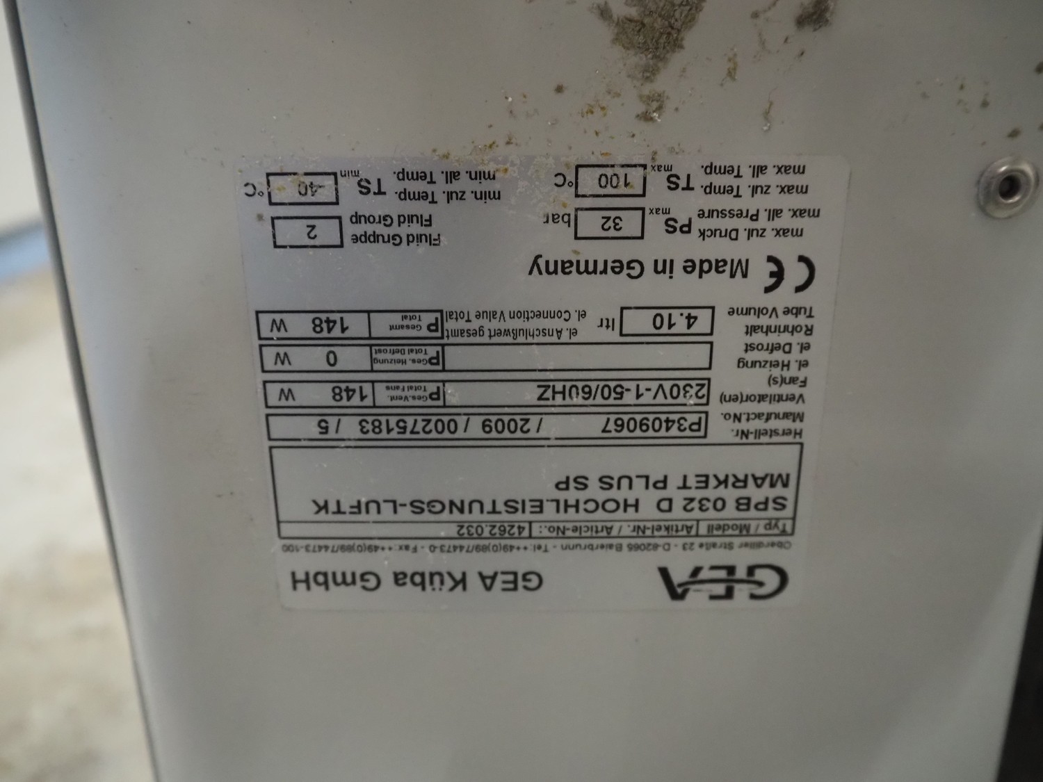 GEA Küba GmbH evaporator, model: SPB 032 D HOCHLEISTUNGS-LUFTK MARKET PLUS SP, number: P3409067, year of construction: 2009, 230 V, 1 Ph, 50/60 Hz, 148 Watt, dimensions: 1560 mm x 530 mm x 580 mm.