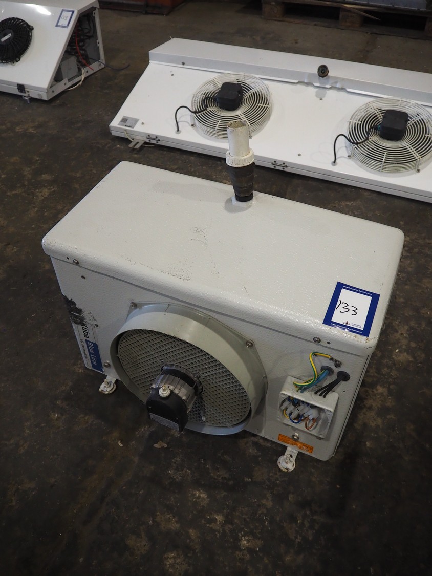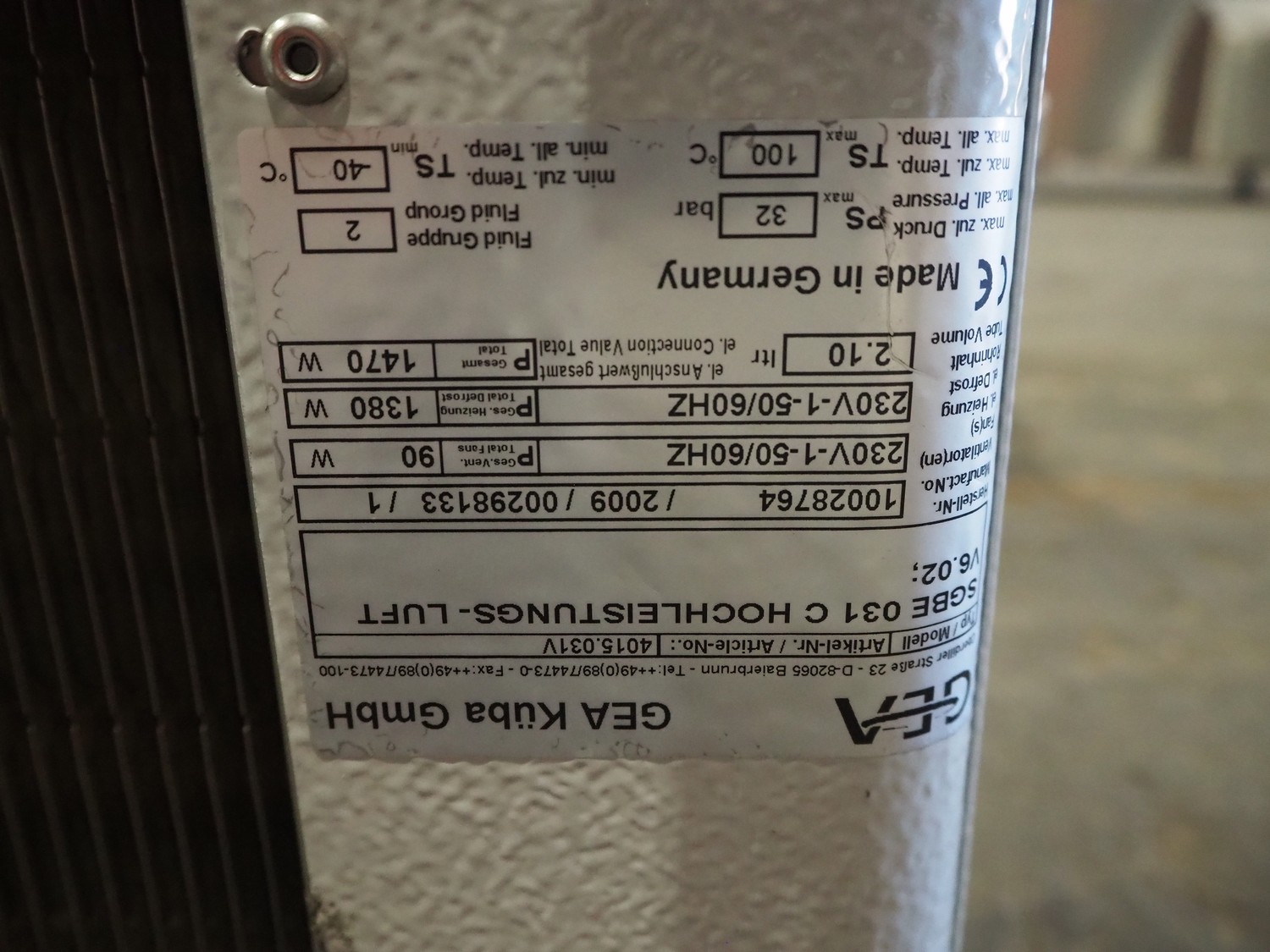 GEA Küba GmbH evaporator, model: SGBE 031 C HOCHLEISTUNGS-LUFT V6.02, number: 10028764, year of construction: 2009, 230 V, 1 Ph, 50/60 Hz, 1470 W, 1 fan, dimensions: 670 mm x 530 mm x 600 mm.