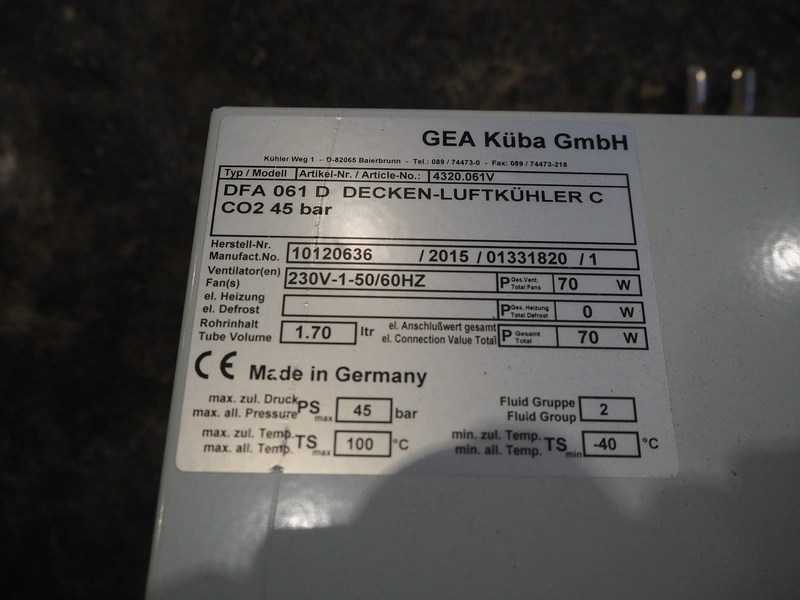 GEA Küba GmbH evaporator, model: DFA 061 D DECKEN-LUFTKÜhler C CO2 45 bar, number: 10120636, year of construction: 2015, 230 V, 1 Ph, 50/60 Hz, 1470 W, 1 fan, dimensions: 1000 mm x 630 mm x 320 mm.