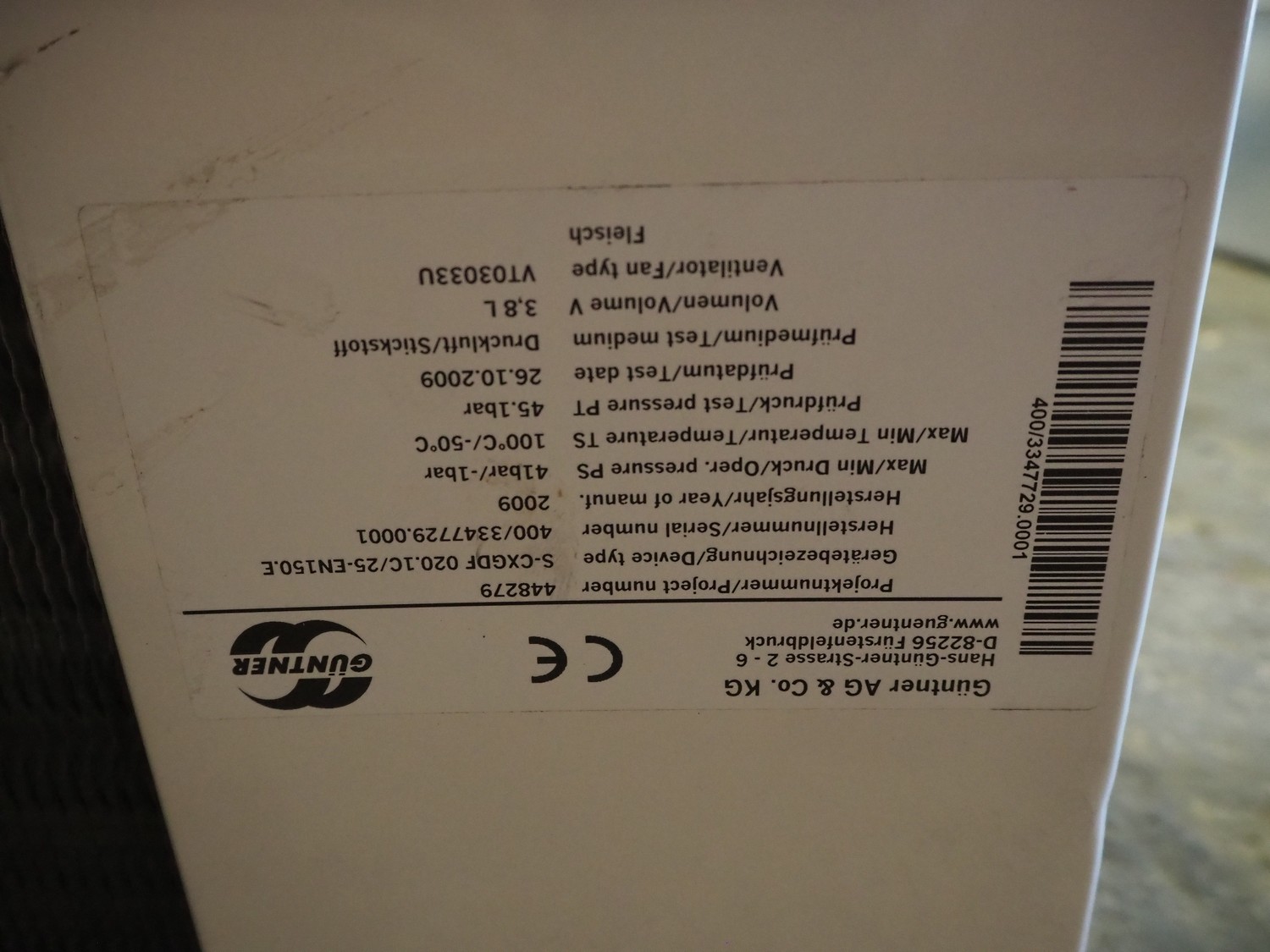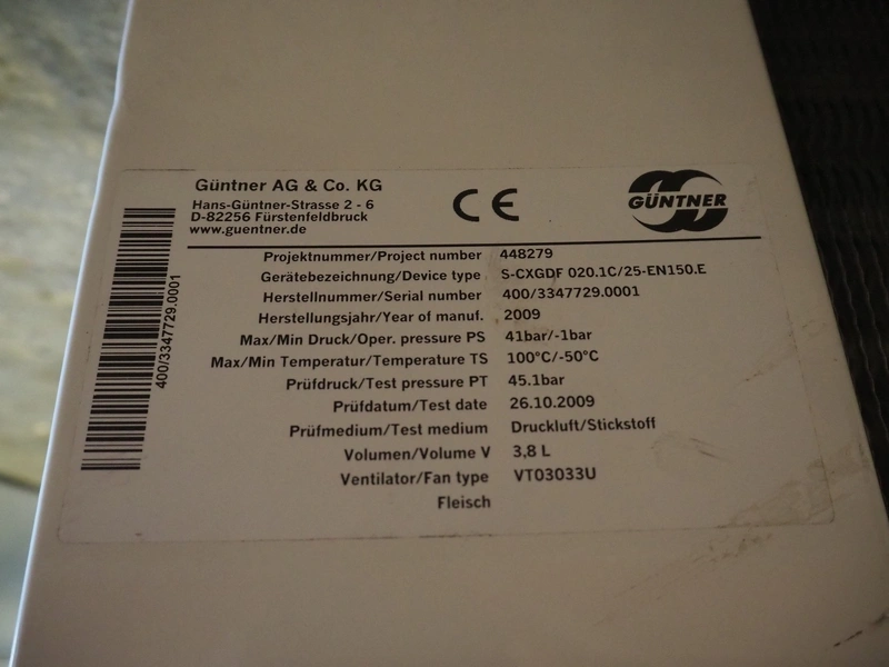 Güntner AG&Co.KG evaporator, type: S-CXGDF 020.1C/25-EN150.E, serial number: 400/3347729.0001, year of construction: 2009, volume: 3.8 liter, 2 fans, dimensions: 1080 mm x 550 mm x 380 mm.