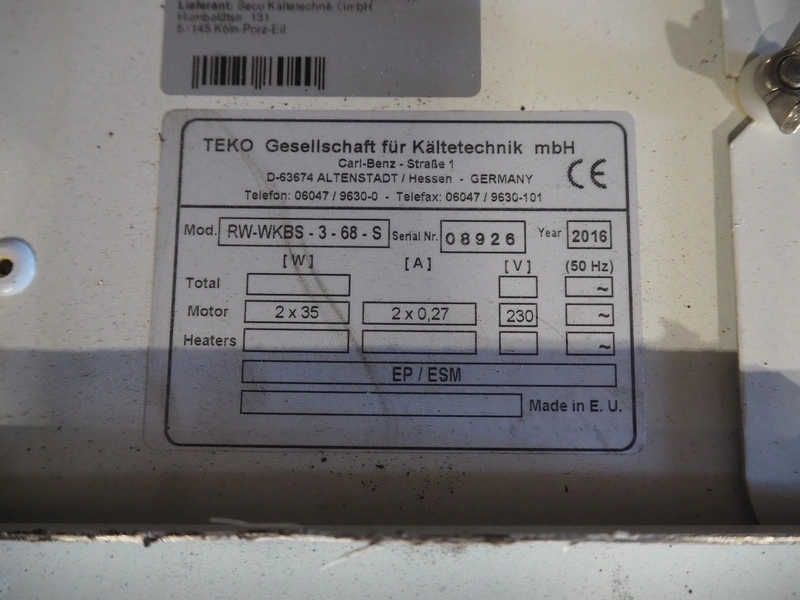 Teko evaporator, model: RW-WKBS-3-68-S, serial number: 08926, year of construction: 2016, 230 V, 50 Hz, 2x0.27 A, 2x35 W, 2 fans, dimensions: 1300 mm x 400 mm x 440 mm.