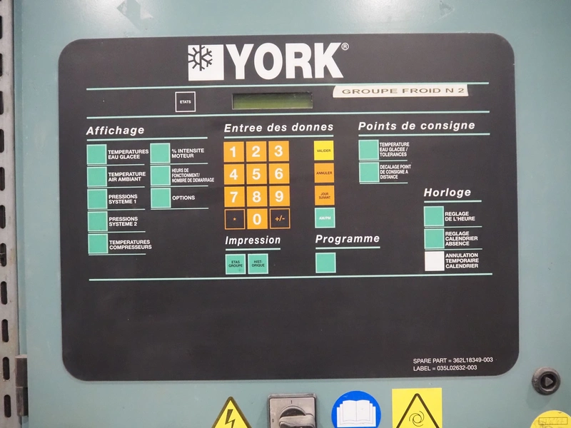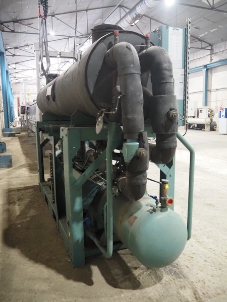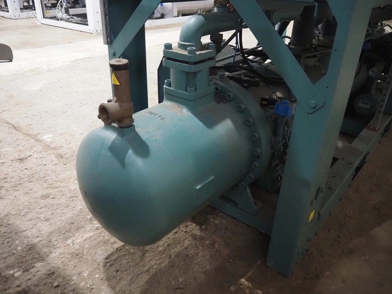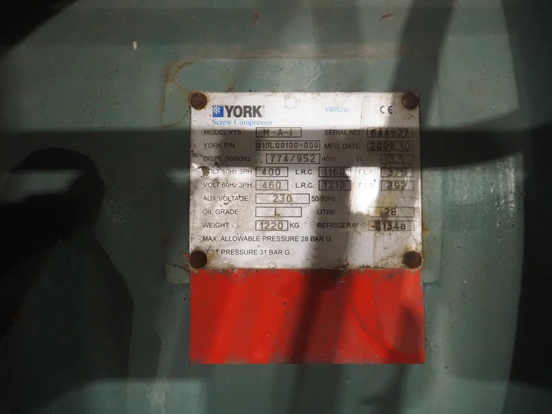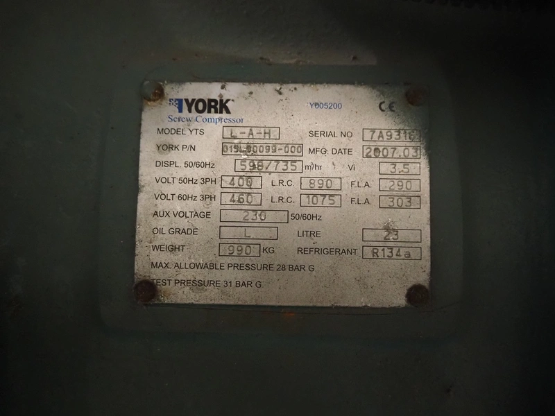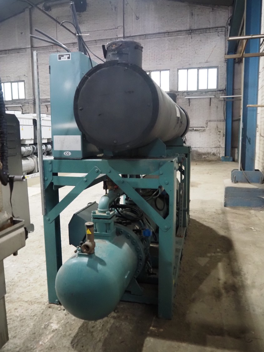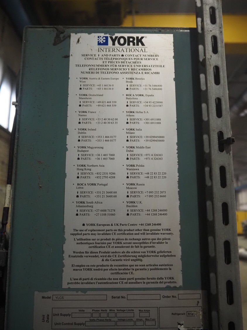 York YLCS water cooled screw chiller, with 2 York screw compressors, type: YLCS 0840AA, model: L-A-H and M-A-I, serial number: 7A9316 and 6AA927, year of construction: 2007 and 2006, 400/460 V, 3 Ph, 50/60 Hz, capacity: 598/735 and 774/952 m³ per hour, refrigerant: R134a, cooling capacity: 788 kW, dimensions: 4100 mm x 1100 mm x 2170 mm. Including pallet with liquid vessel, type: FS902, serial number: 1172403249, year of construction: 2007, volume: 89 liter, dimensions: 1500 mm x 800 mm x 450 mm.