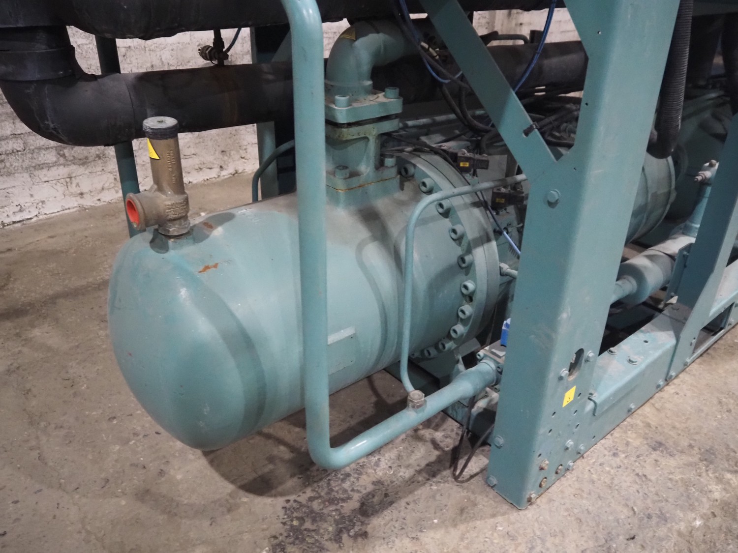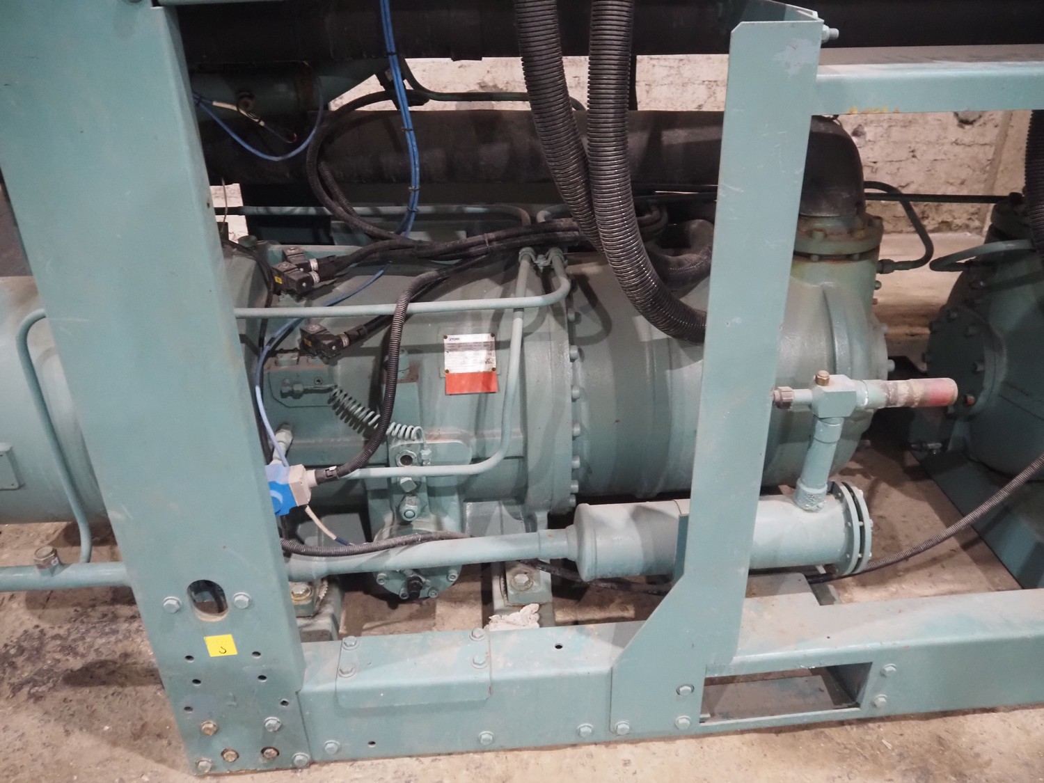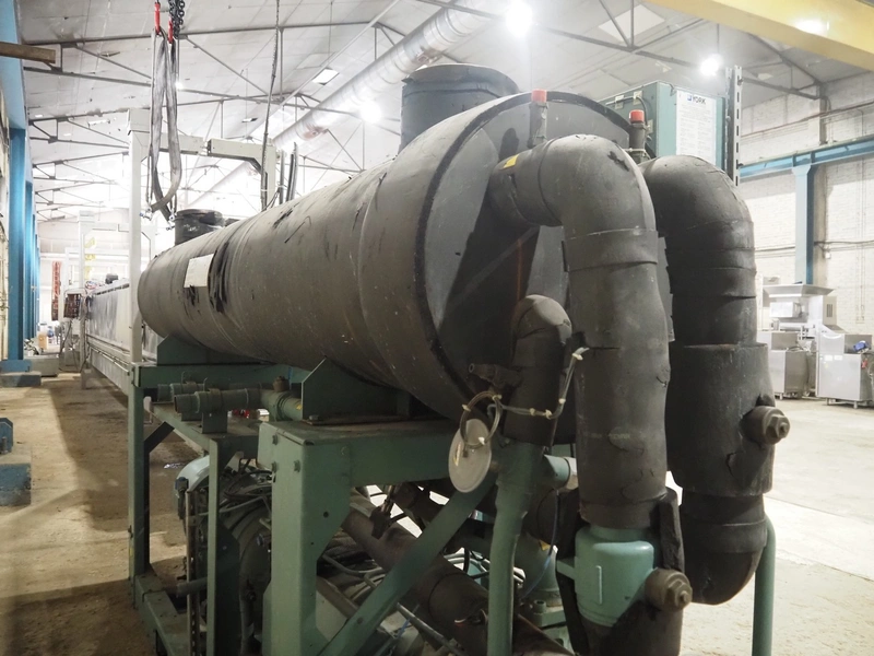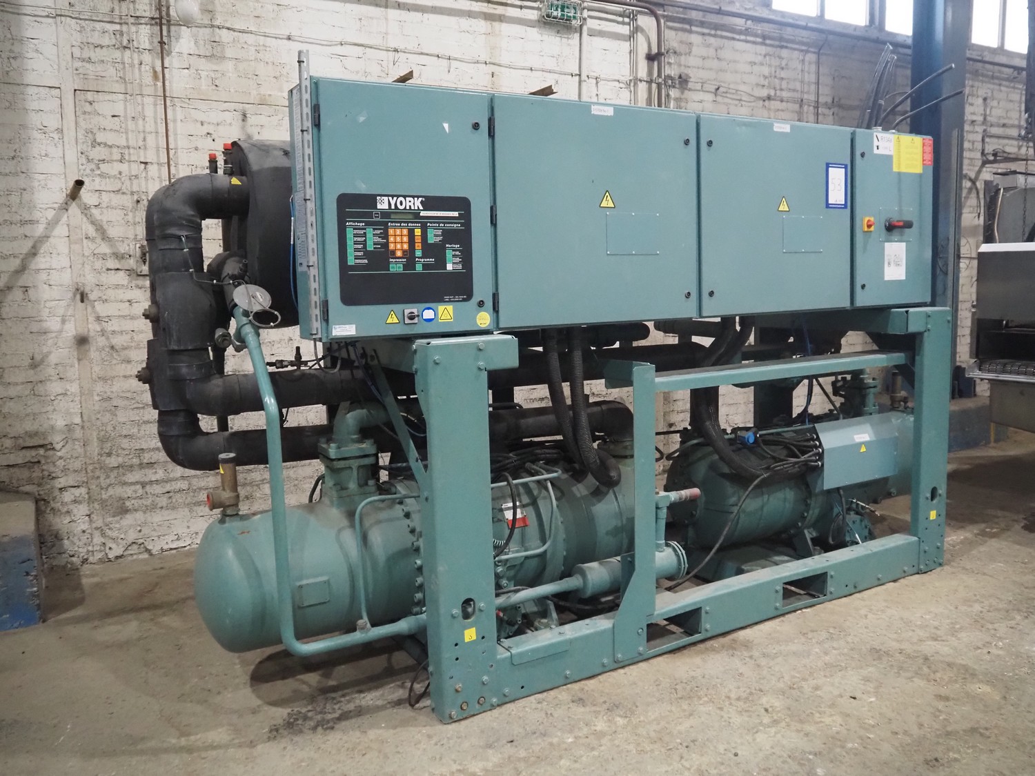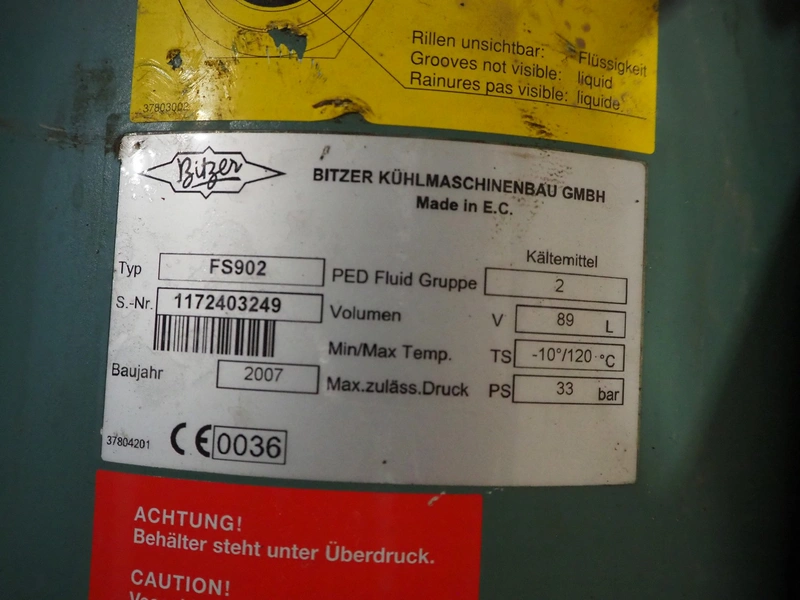 York YLCS water cooled screw chiller, with 2 York screw compressors, type: YLCS 0840AA, model: L-A-H and M-A-I, serial number: 7A9316 and 6AA927, year of construction: 2007 and 2006, 400/460 V, 3 Ph, 50/60 Hz, capacity: 598/735 and 774/952 m³ per hour, refrigerant: R134a, cooling capacity: 788 kW, dimensions: 4100 mm x 1100 mm x 2170 mm. Including pallet with liquid vessel, type: FS902, serial number: 1172403249, year of construction: 2007, volume: 89 liter, dimensions: 1500 mm x 800 mm x 450 mm.