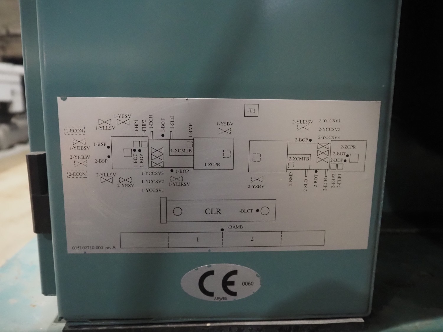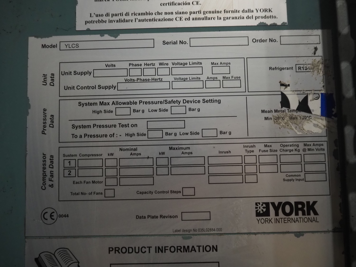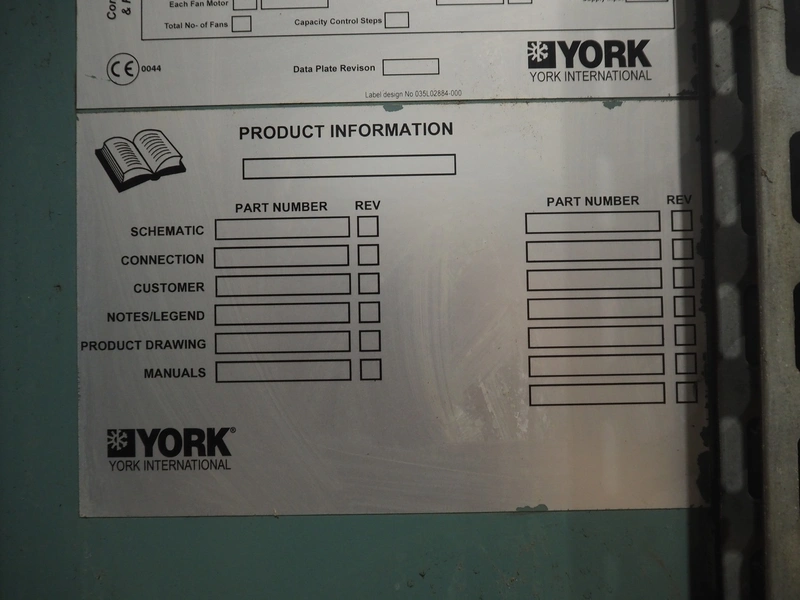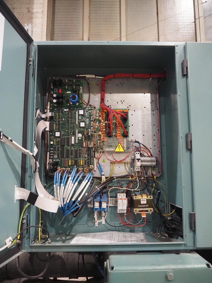 York YLCS water cooled screw chiller, with 2 York screw compressors, type: YLCS 0840AA, model: L-A-H and M-A-I, serial number: 7A9316 and 6AA927, year of construction: 2007 and 2006, 400/460 V, 3 Ph, 50/60 Hz, capacity: 598/735 and 774/952 m³ per hour, refrigerant: R134a, cooling capacity: 788 kW, dimensions: 4100 mm x 1100 mm x 2170 mm. Including pallet with liquid vessel, type: FS902, serial number: 1172403249, year of construction: 2007, volume: 89 liter, dimensions: 1500 mm x 800 mm x 450 mm.
