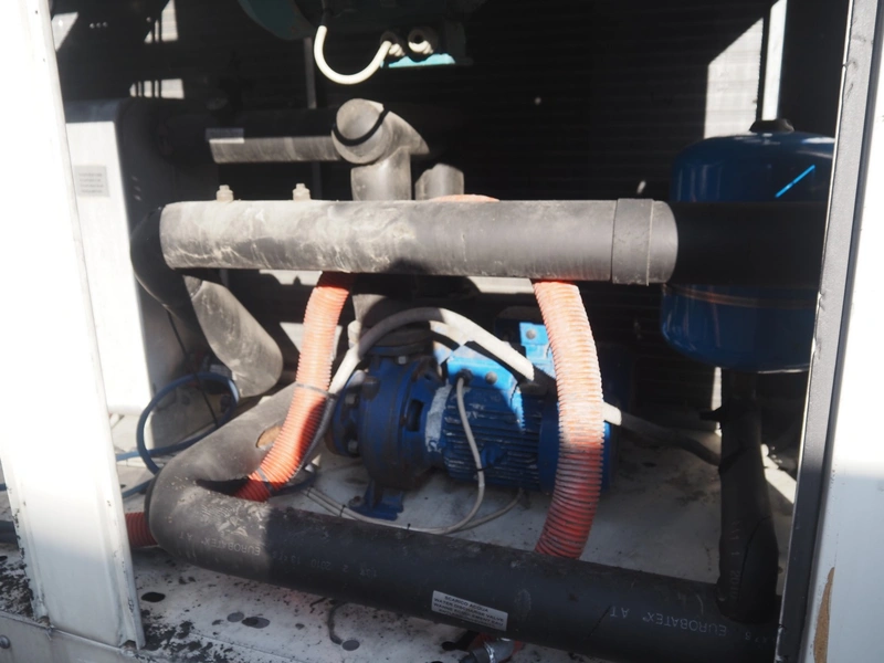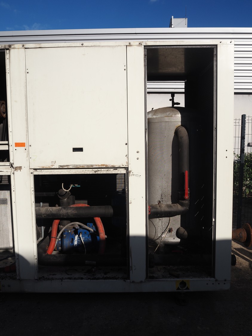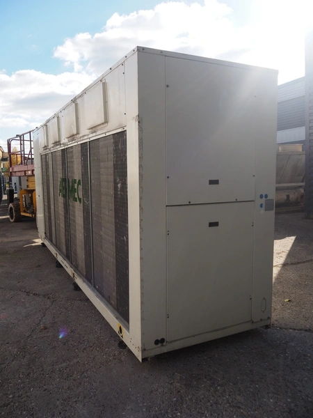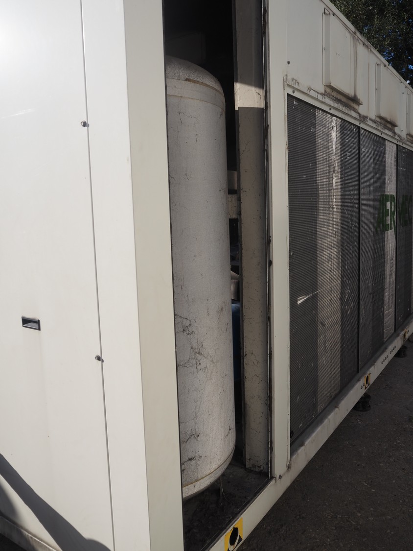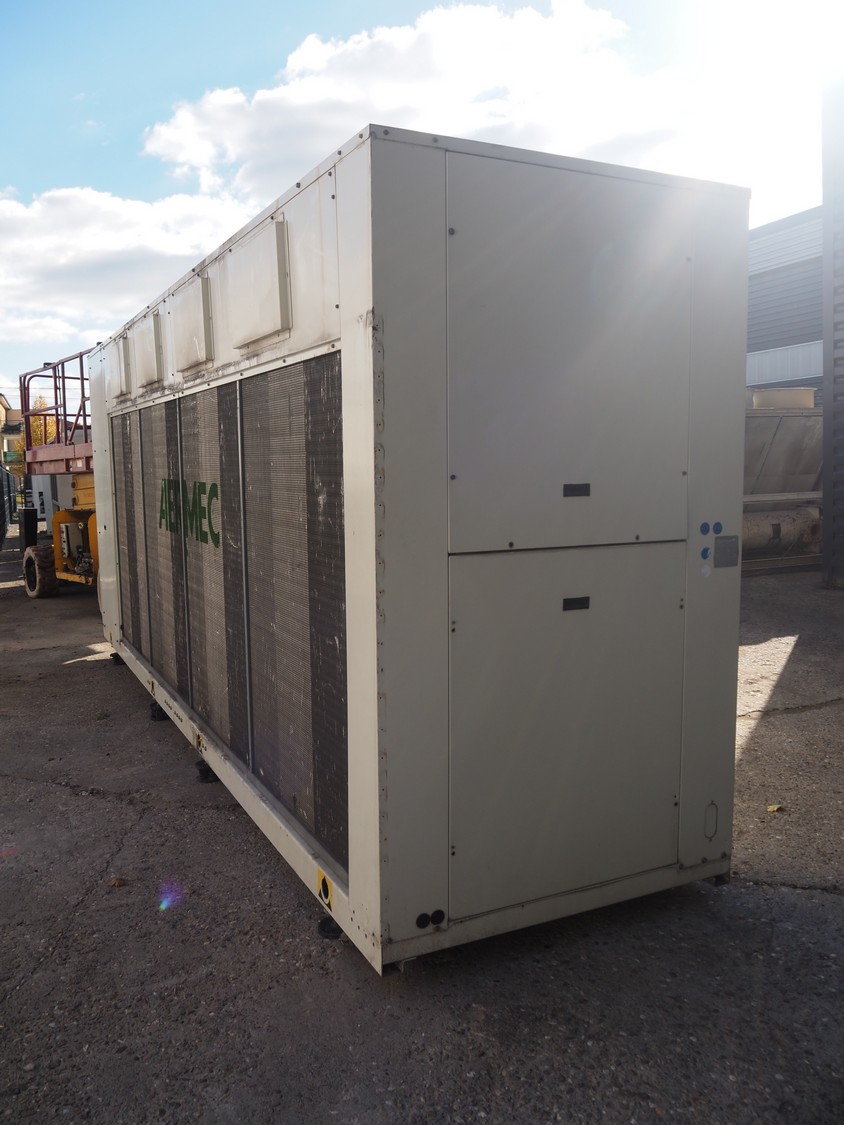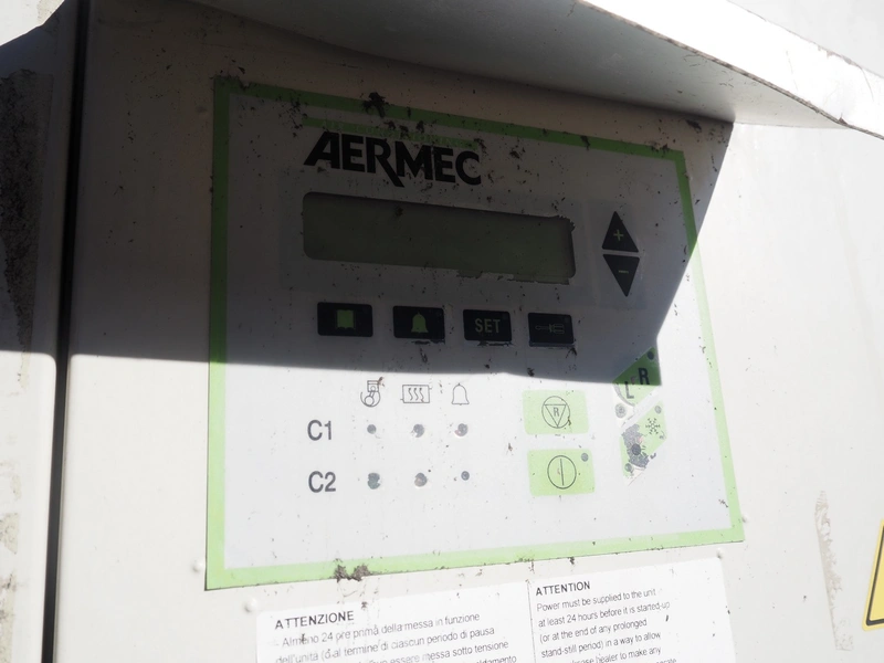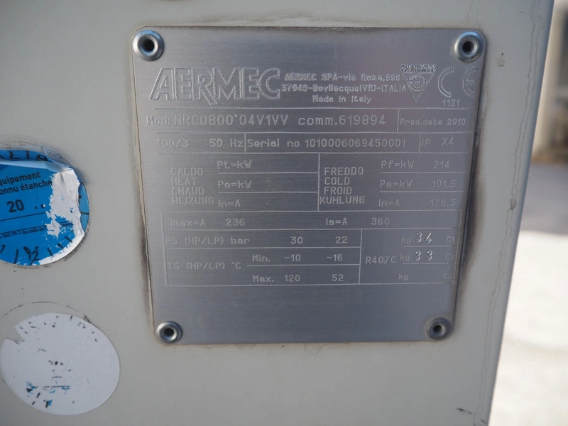 Aermec chiller, model: NRC0800 04V1VV, serial number: 1010006069450001, year of construction: 2010, 400 V, 3 Ph, 50 Hz, 176.5 A, heating: 101.5 kW, cooling capacity: 214 kW, refrigerant: R407C, dimensions: 6050 mm x 1300 mm x 2420 mm.