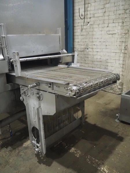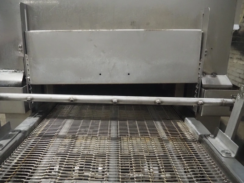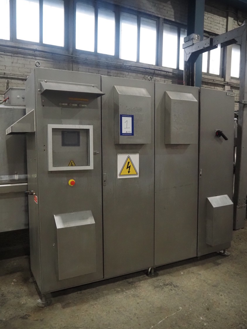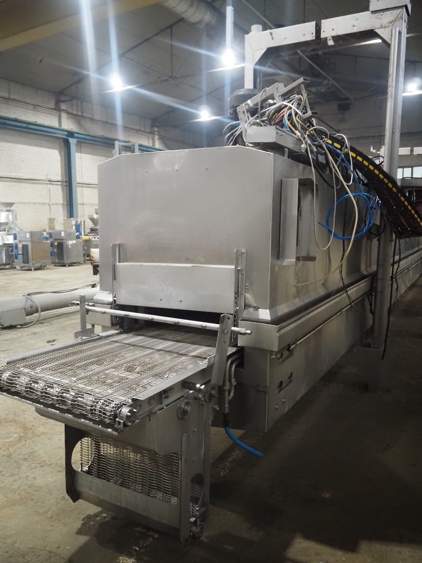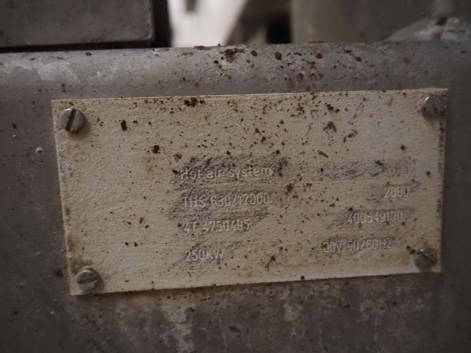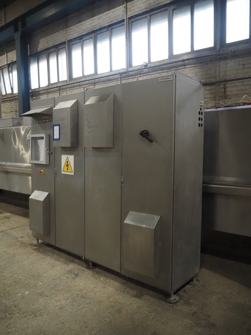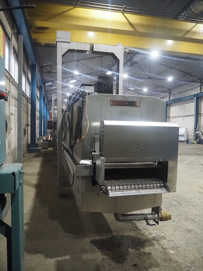 Stork Titan B.V. hot air tunnel oven, model: THS 630/12000, year of construction: 2000, 400 V, 50/60 Hz, 250 kW, s/s mesh belt, belt width: 630 mm, clearance: 630 mm x 120 mm, total dimensions: 14200 mm x 1800 mm x 3300 mm, dimensions switch cabinet: 2300 mm x 720 mm x 2470 mm. Including various parts and new s/s belt.