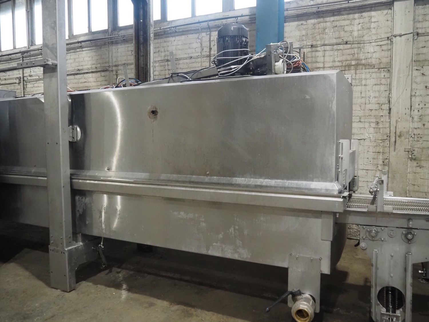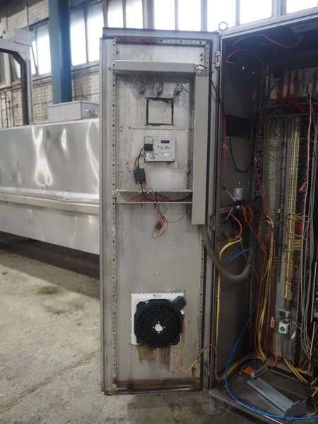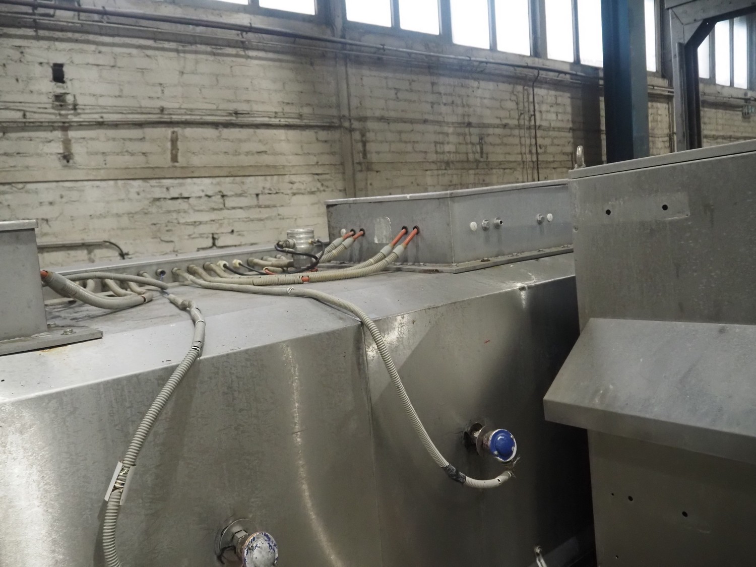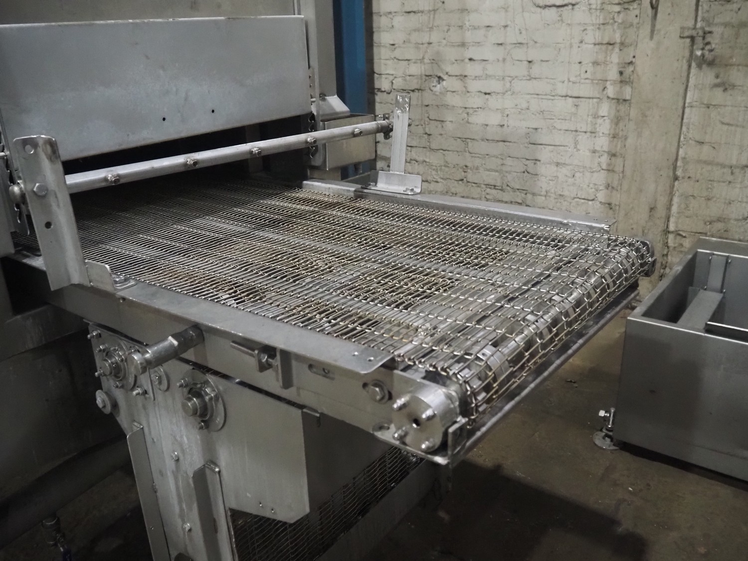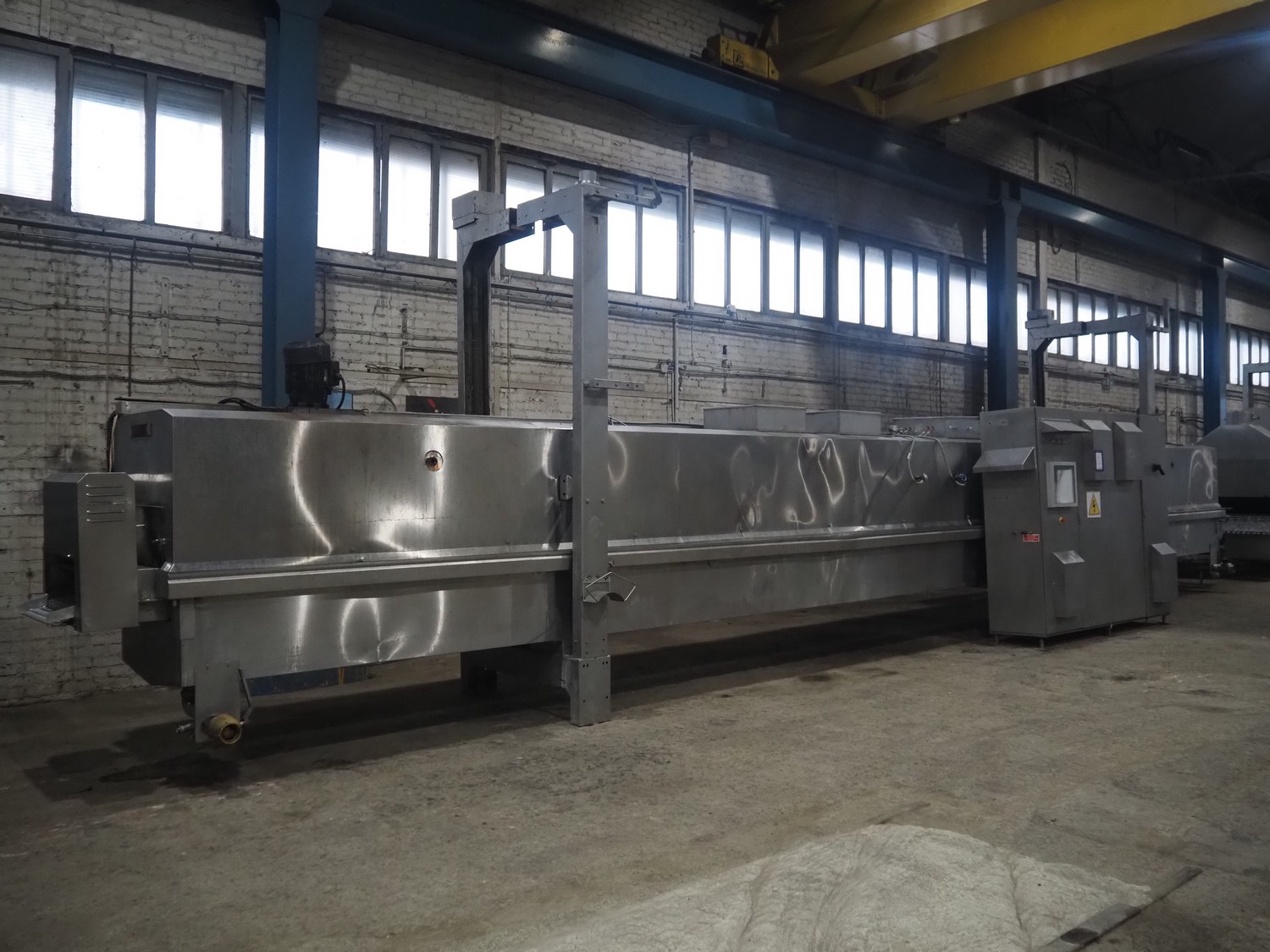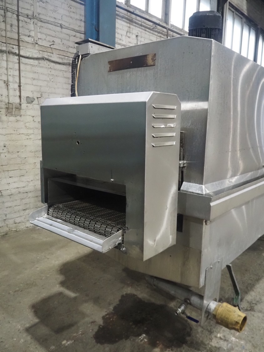 Stork Titan B.V. hot air tunnel oven, model: THS 630/12000, year of construction: 2000, 400 V, 50/60 Hz, 250 kW, s/s mesh belt, belt width: 630 mm, clearance: 630 mm x 120 mm, total dimensions: 14200 mm x 1800 mm x 3300 mm, dimensions switch cabinet: 2300 mm x 720 mm x 2470 mm. Including various parts and new s/s belt.